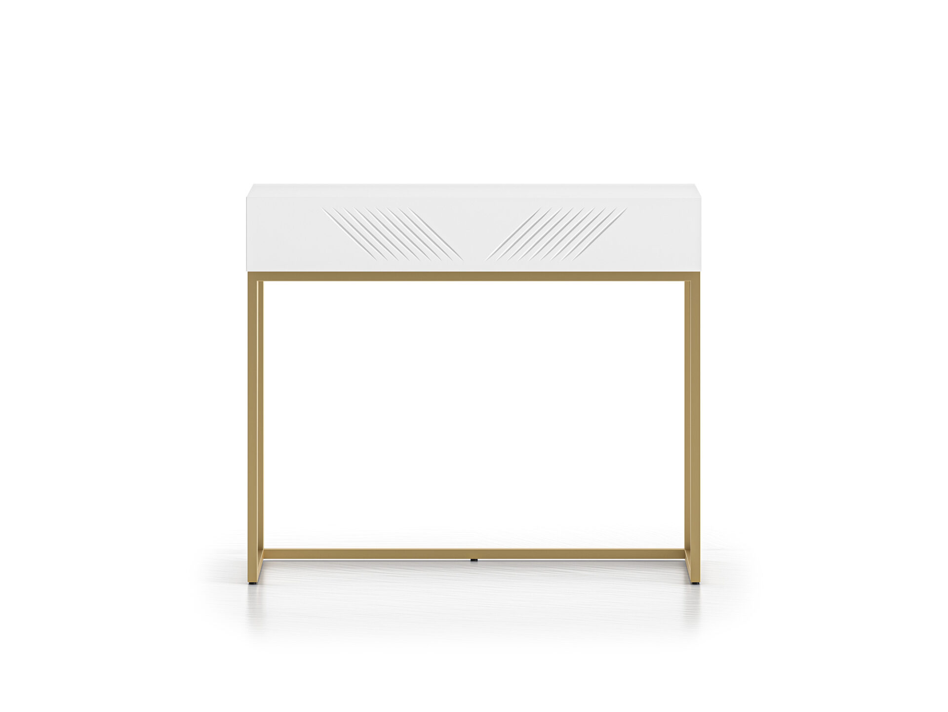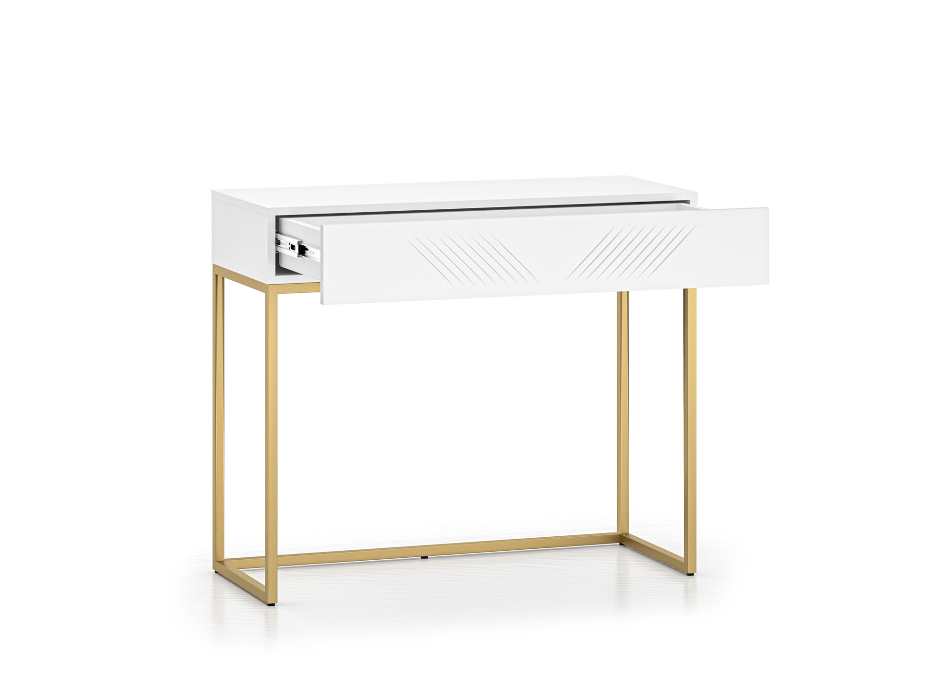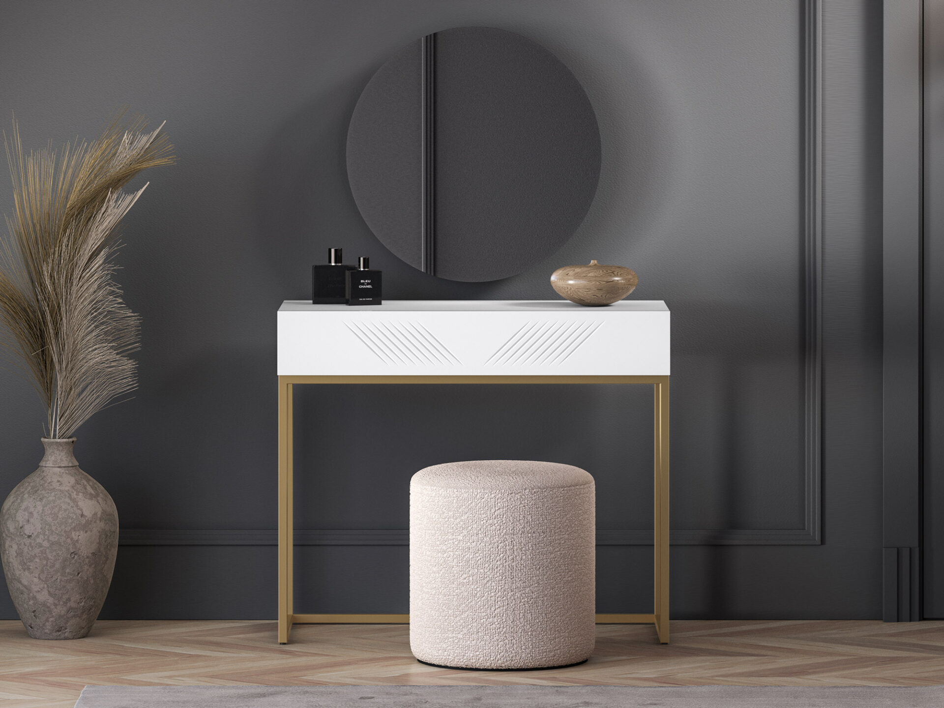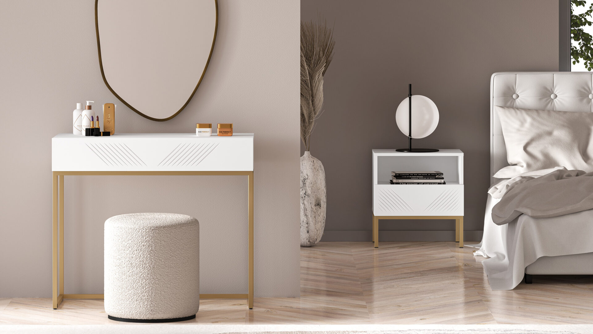 „Clearing 06“ tualetinis staliukas – puikus jūsų miegamojo papildymas. Didelis stalviršis leidžia demonstruoti kvepalų kolekciją ir laikyti makiažą. Jei mėgstate minimalizmą ir tvarką, erdviame stalčiuje galite laikyti visą kosmetiką, o stalviršis tarnauja kaip vieta, pavyzdžiui, vazai su mėgstamomis gėlėmis. Be funkcionalumo, pagrindinis „Clearing“ kolekcijos baldų privalumas yra jų dizainas. Paprasti, balti fasadai, pagaminti iš itin patvarios MDF plokštės, paryškinti unikaliais frezavimais. Minimalistinė forma su įdomiu akcentu sukuria modernų pasiūlymą šiuolaikiniam miegamajam. Auksinis metalinis pagrindas suteikia komodai charakterio ir kartu su likusia balta konstrukcija sukuria klasikinį ir elegantišką spalvų kontrastą.