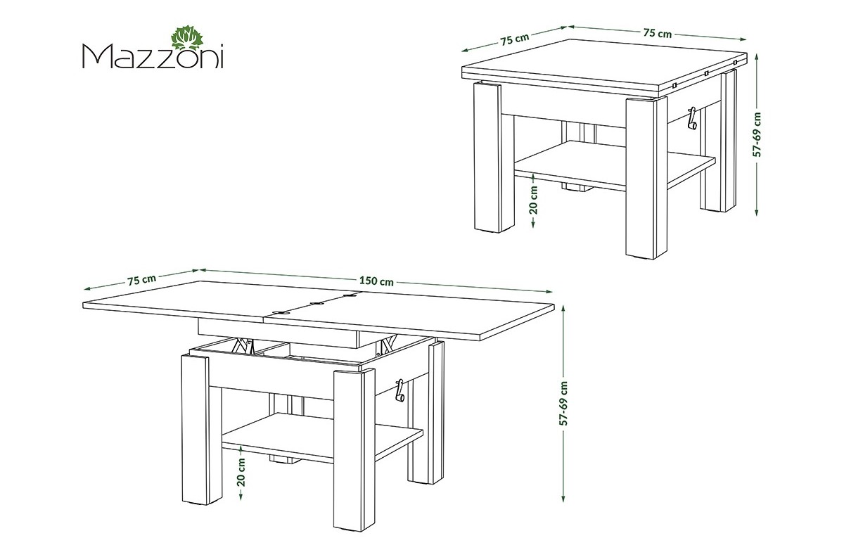 PLOTIS 75 cm / 150 cm, GYLIS 75 cm, REGULIUOJAMAS AUKŠTIS 57–69 cm, MEDŽIAGOS Medžio drožlių plokštė, FUNKCIJA Ištraukiamas stalviršis, PAVIRŠIUS Matinis, STILIUS Klasikinis, SVORIS SU PAKUOTE 40 kg
