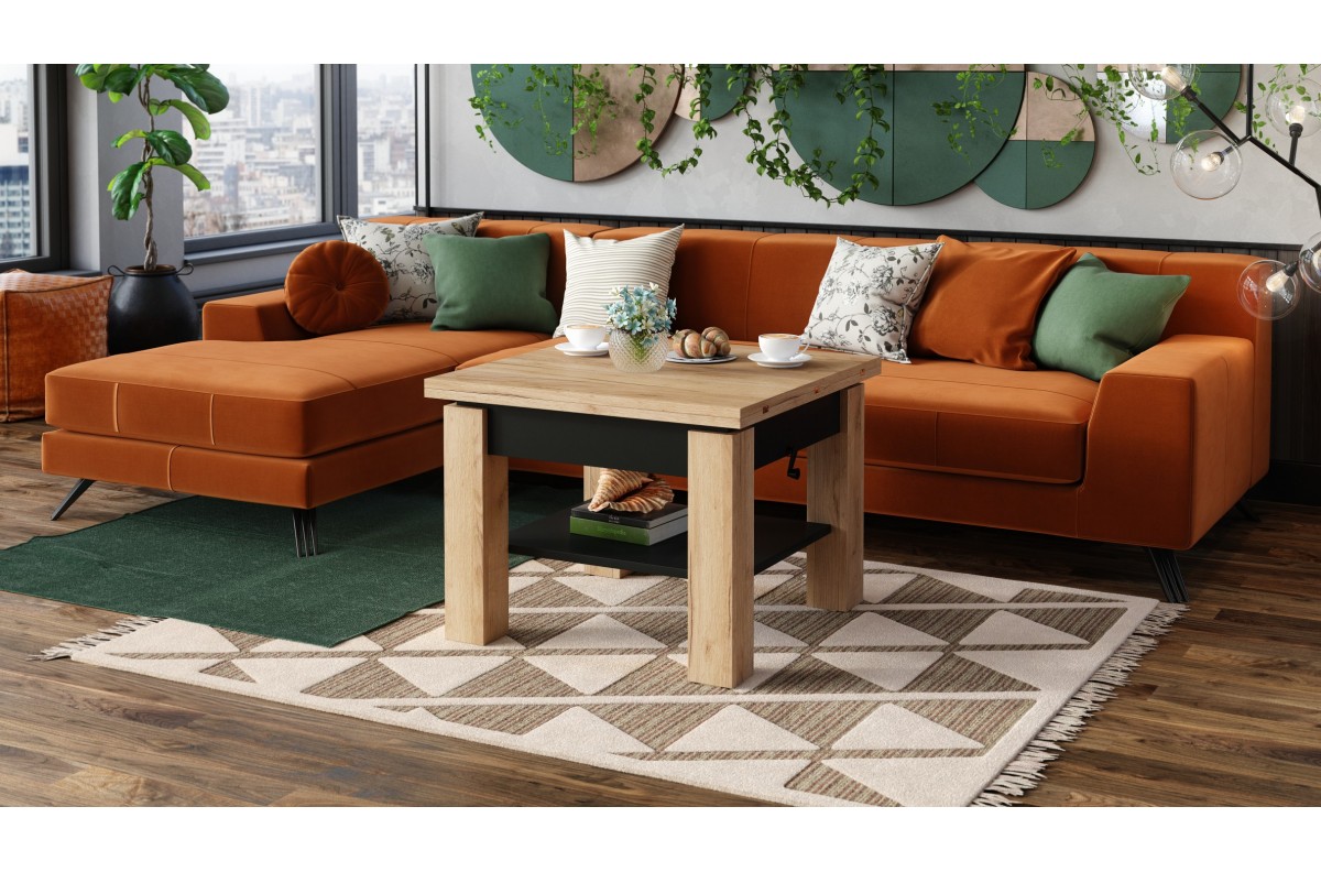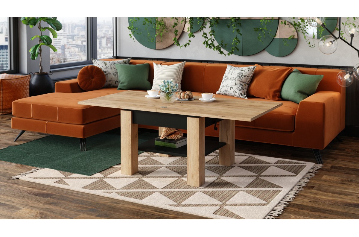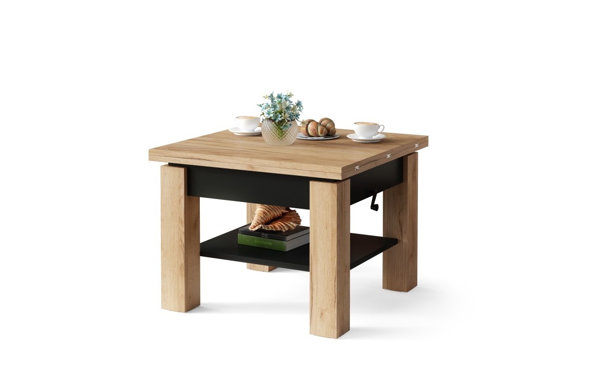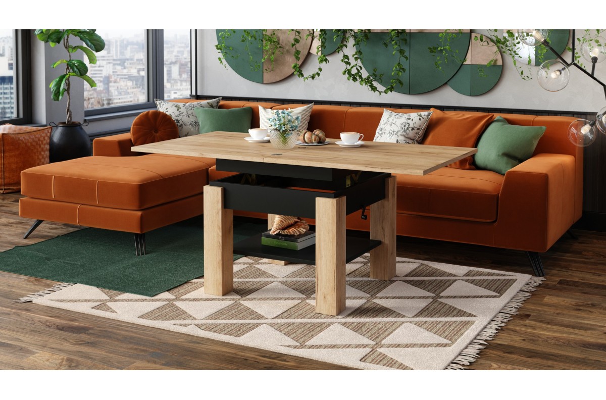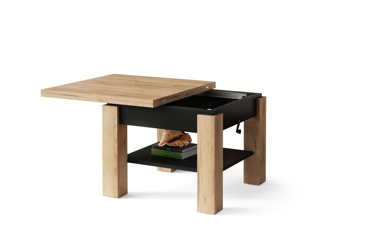 CLEO Craft ąžuolo aukso/juodo spalvos kavos staliukas su ištraukiamu ir pakeliamu stalviršiu