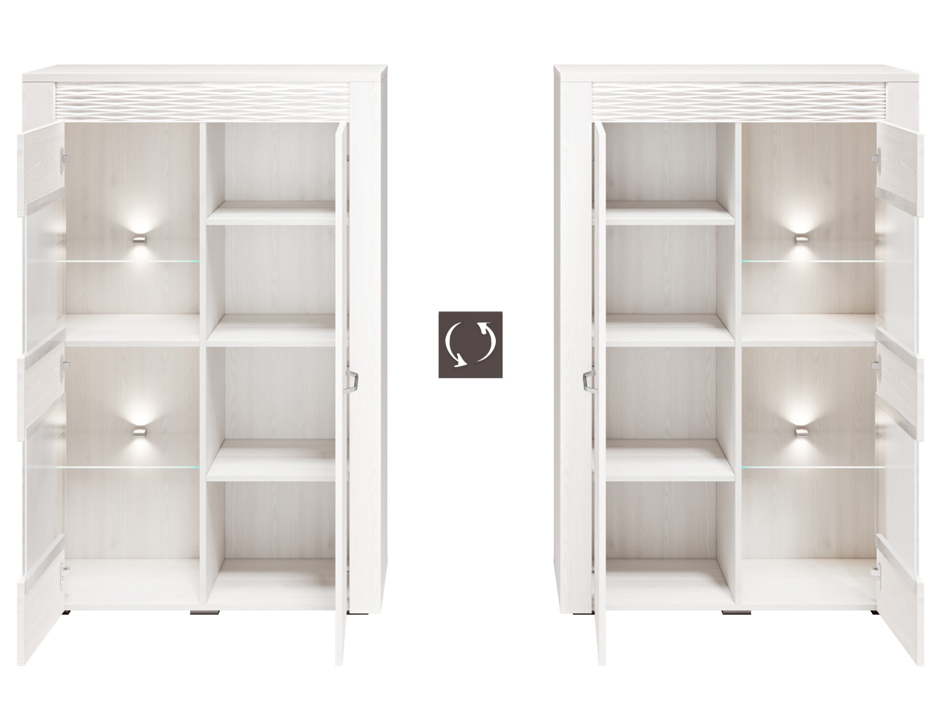 Vitrinos durys yra stiklinės ir pagamintos iš aukštos kokybės baldinės plokštės. Priklausomai nuo interjero dizaino, joje galima laikyti knygas, suvenyrus, stalo įrankius ir daug daugiau.