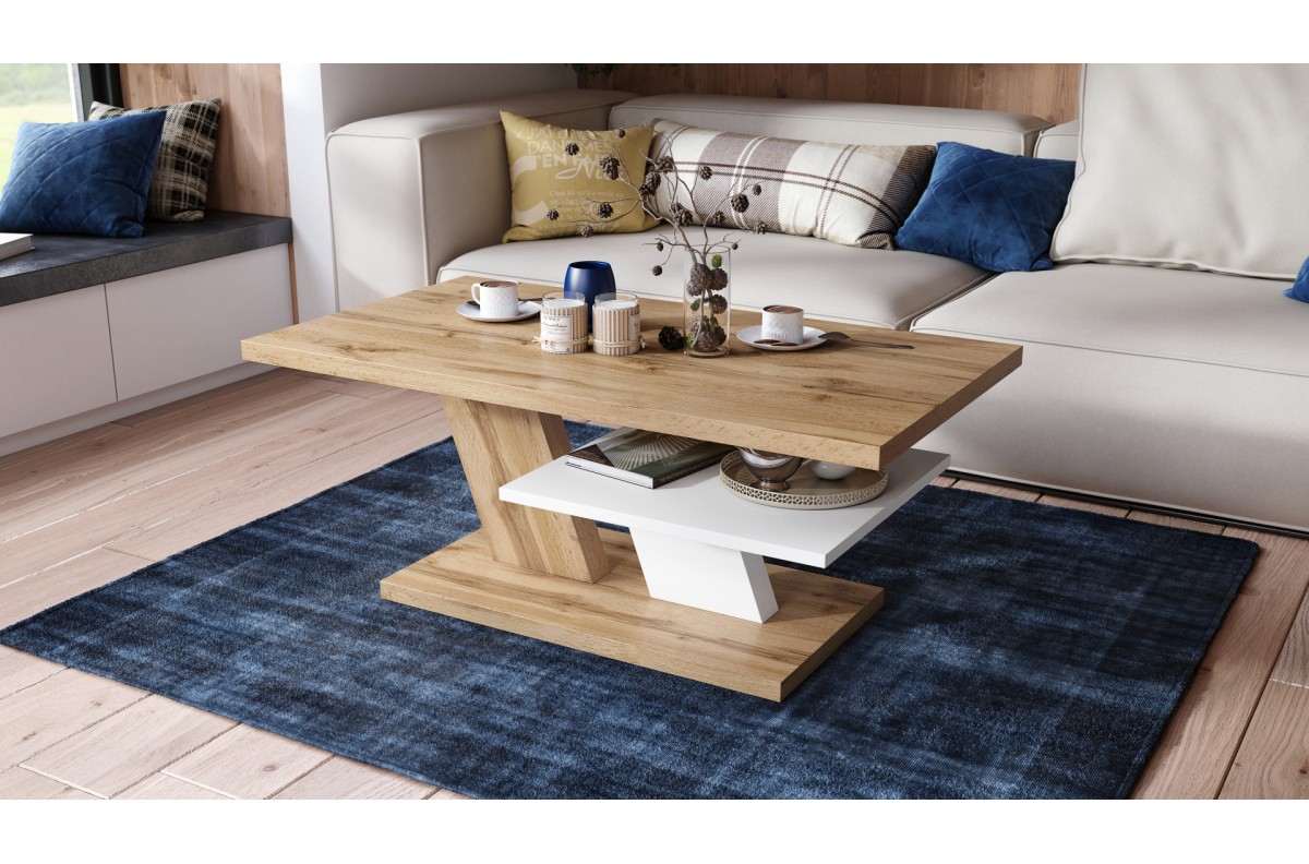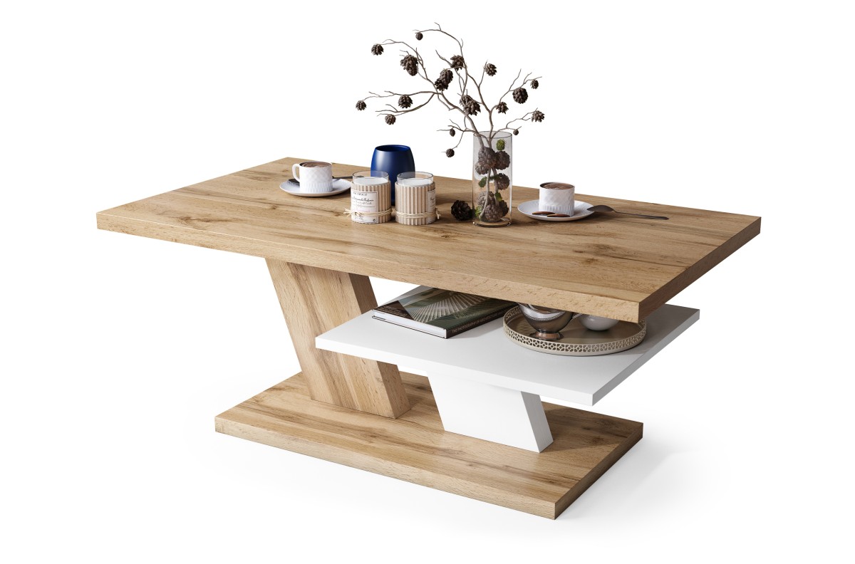 Stalas pagamintas iš 28 mm storio matinės medžio drožlių plokštės, laminuotos iš abiejų pusių, o lentynos storis – 18 mm. Visas gaminys apdailintas 1 mm ABS kraštais.