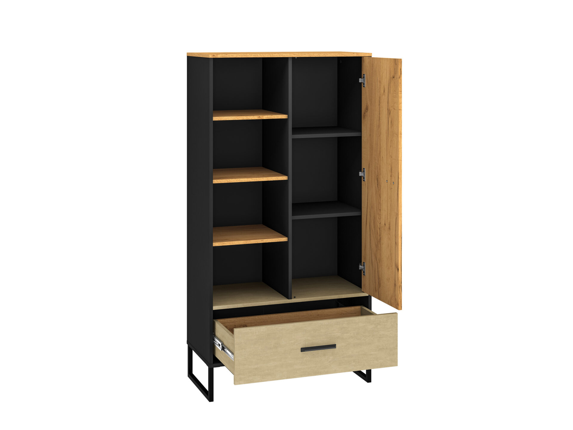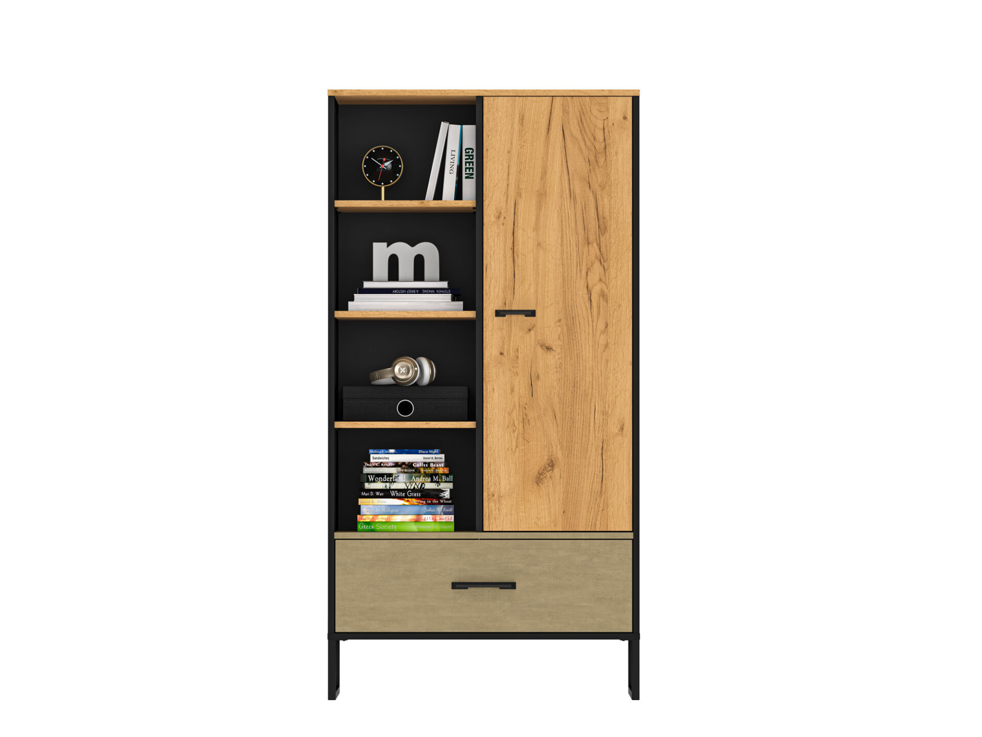 „Colt 04“ knygų lentyna suteikia daug vietos daiktams susidėti ir leidžia eksponuoti mėgstamiausius daiktus. Kairėje spintelės pusėje yra keturios atviros nišos, puikiai tinkančios knygoms, kelionių suvenyrams ar kitiems daiktams, kuriuos norite lengvai pasiekti. Dešinėje pusėje yra uždara dalis su trimis erdviomis nišomis, puikiai tinkančiomis, pavyzdžiui, drabužiams laikyti. Apatinėje dalyje yra erdvus stalčius su patogia pilno ištraukimo funkcija ir sutvirtintu dugnu. Dizainas ir dinamiškas dekoro derinys – šiltas ąžuolas ir neapdorotas aukščiausios kokybės plienas, kontrastuojantis su juoda spalva – pabrėš individualų jaunų žmonių stilių ir charakterį. Aukštos metalinės kojelės palengvina valymą.