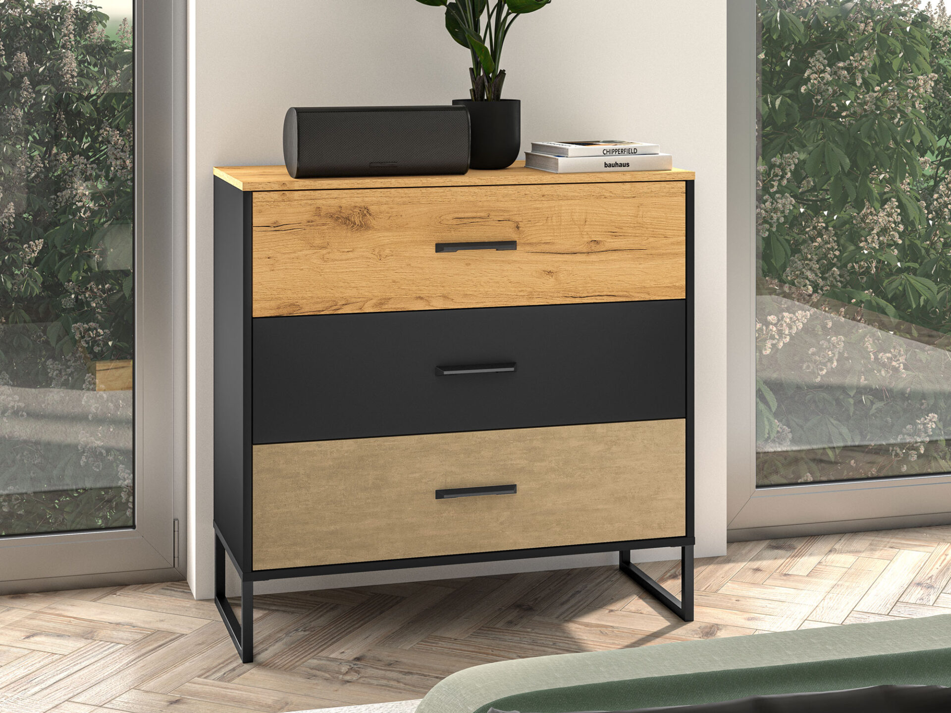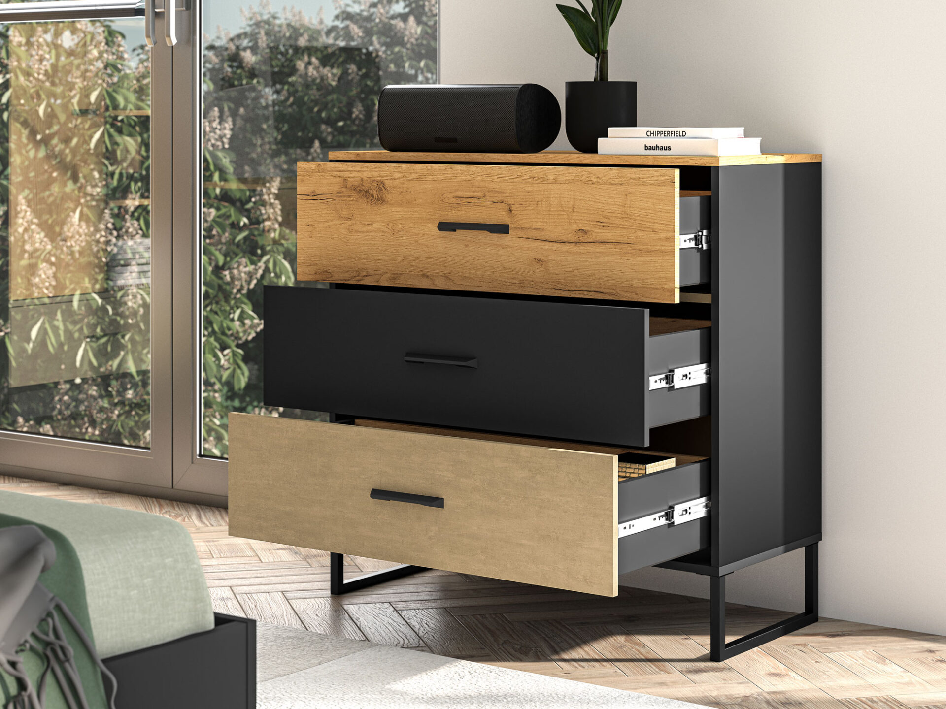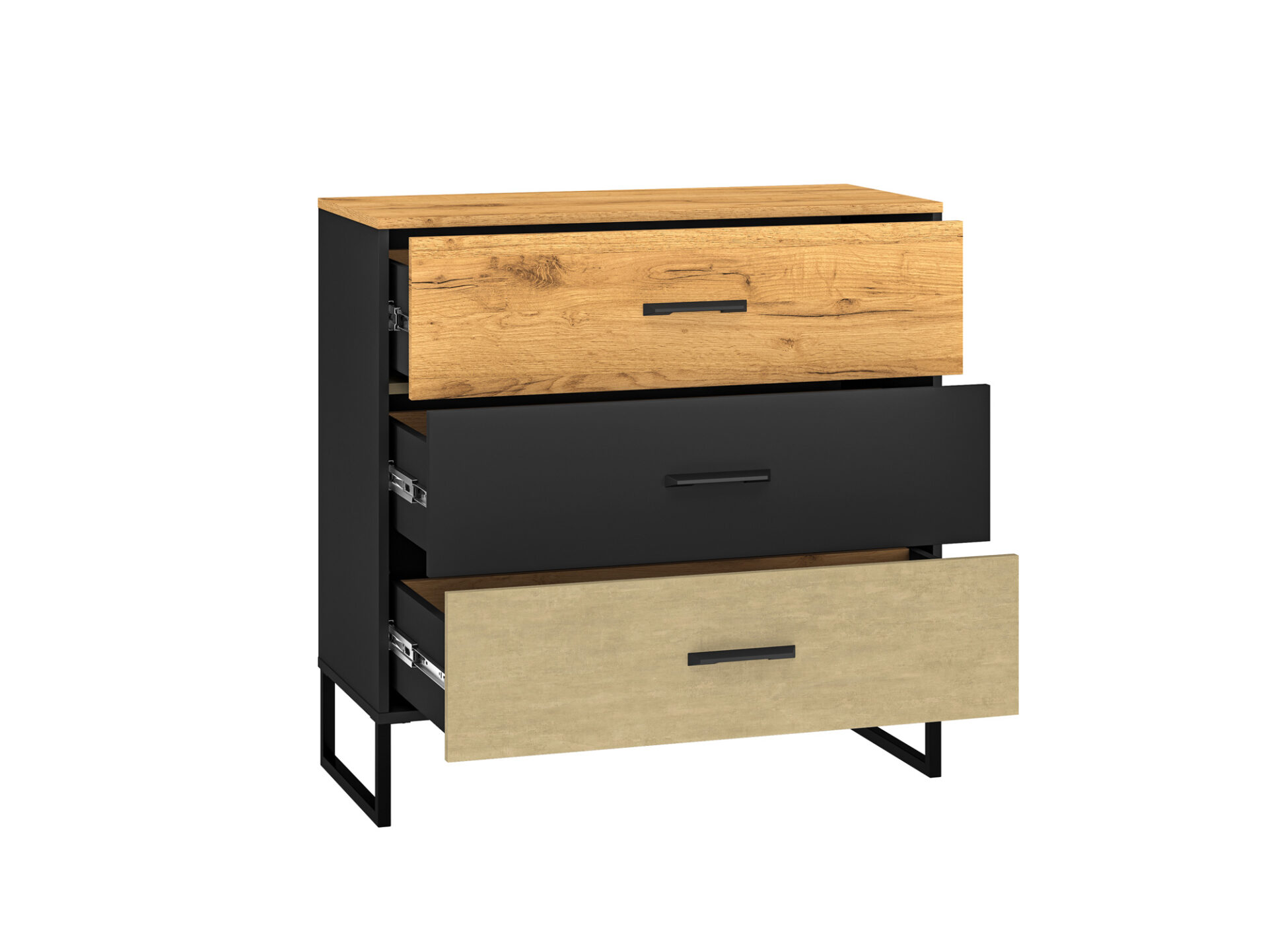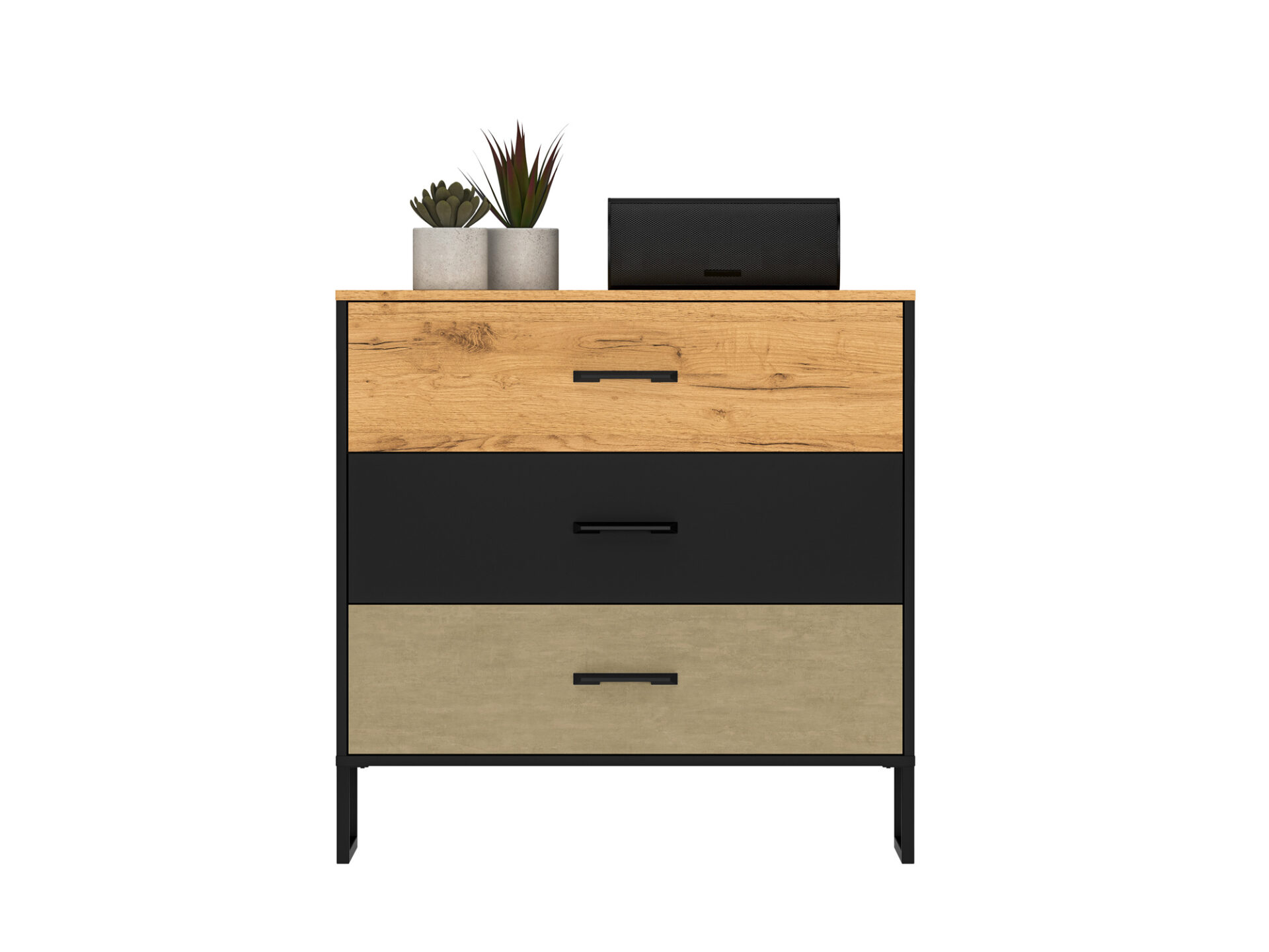„Colt 05“ komoda suteikia daug vietos daiktams susidėti ir leidžia jums eksponuoti mėgstamiausius daiktus. Ją sudaro trys erdvūs stalčiai su sutvirtintais dugnais, švelnaus uždarymo ir pilno ištraukimo funkcijomis. Platus 91 cm stalviršis leidžia jums eksponuoti mėgstamiausius daiktus. Dizainas ir dinamiškas dekoro derinys – šiltas ąžuolas ir neapdorotas aukščiausios kokybės plienas, kontrastuojantis su juoda spalva – pabrėš individualų jaunų žmonių stilių ir charakterį. Aukštos metalinės kojelės palengvina valymą.