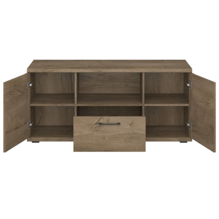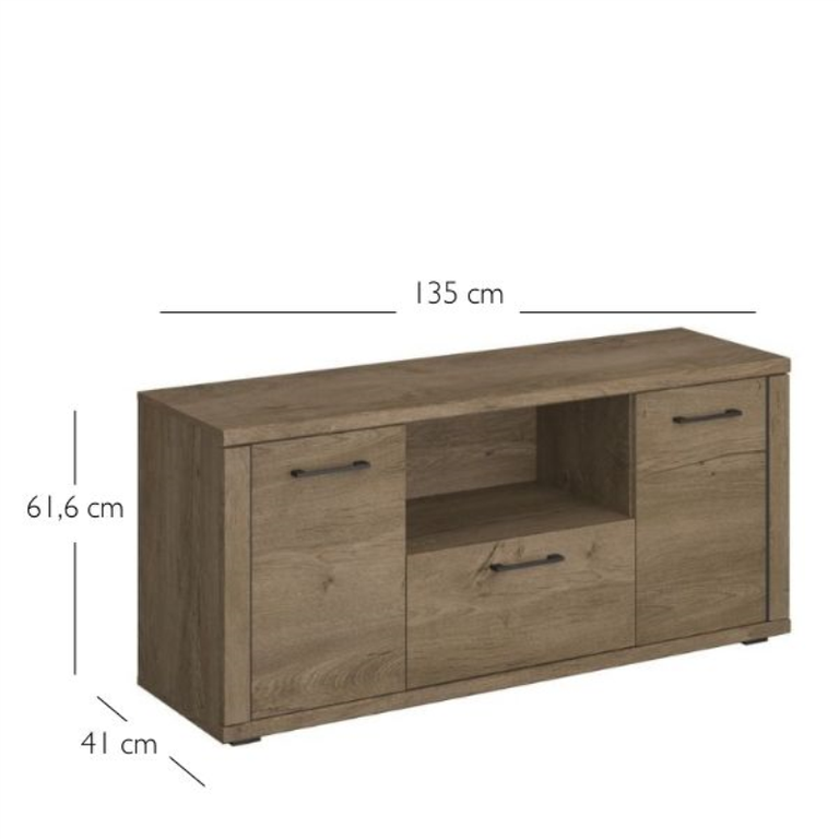 Televizoriaus staliukas su dviem į šonus atsidarančiomis durelėmis ir viduje esančia medžio drožlių lentyna. Centre, po viršumi, yra niša garso įrangai, o po ja – platus, erdvus stalčius ant viso ištraukimo rutulinių guolių bėgelių.