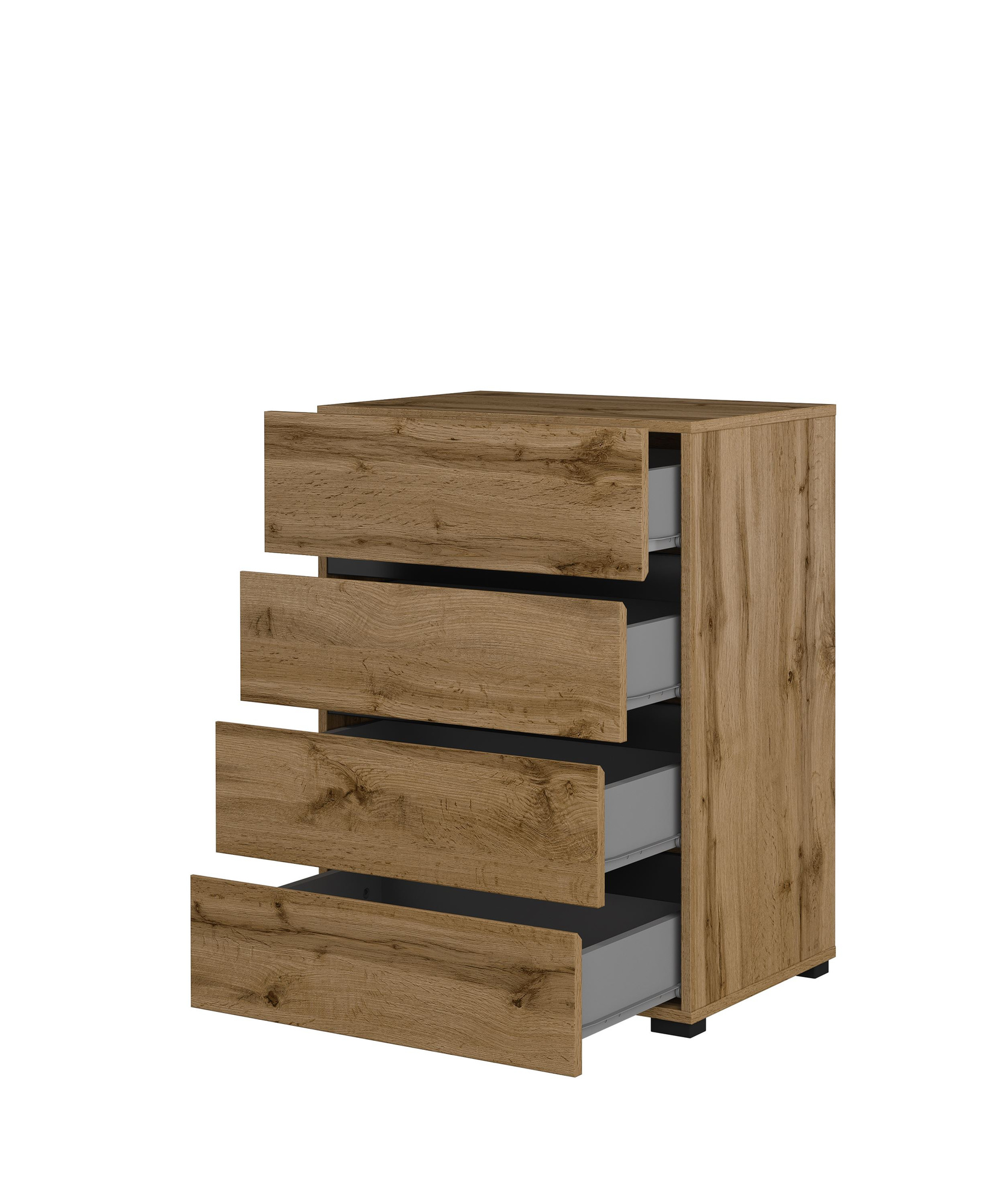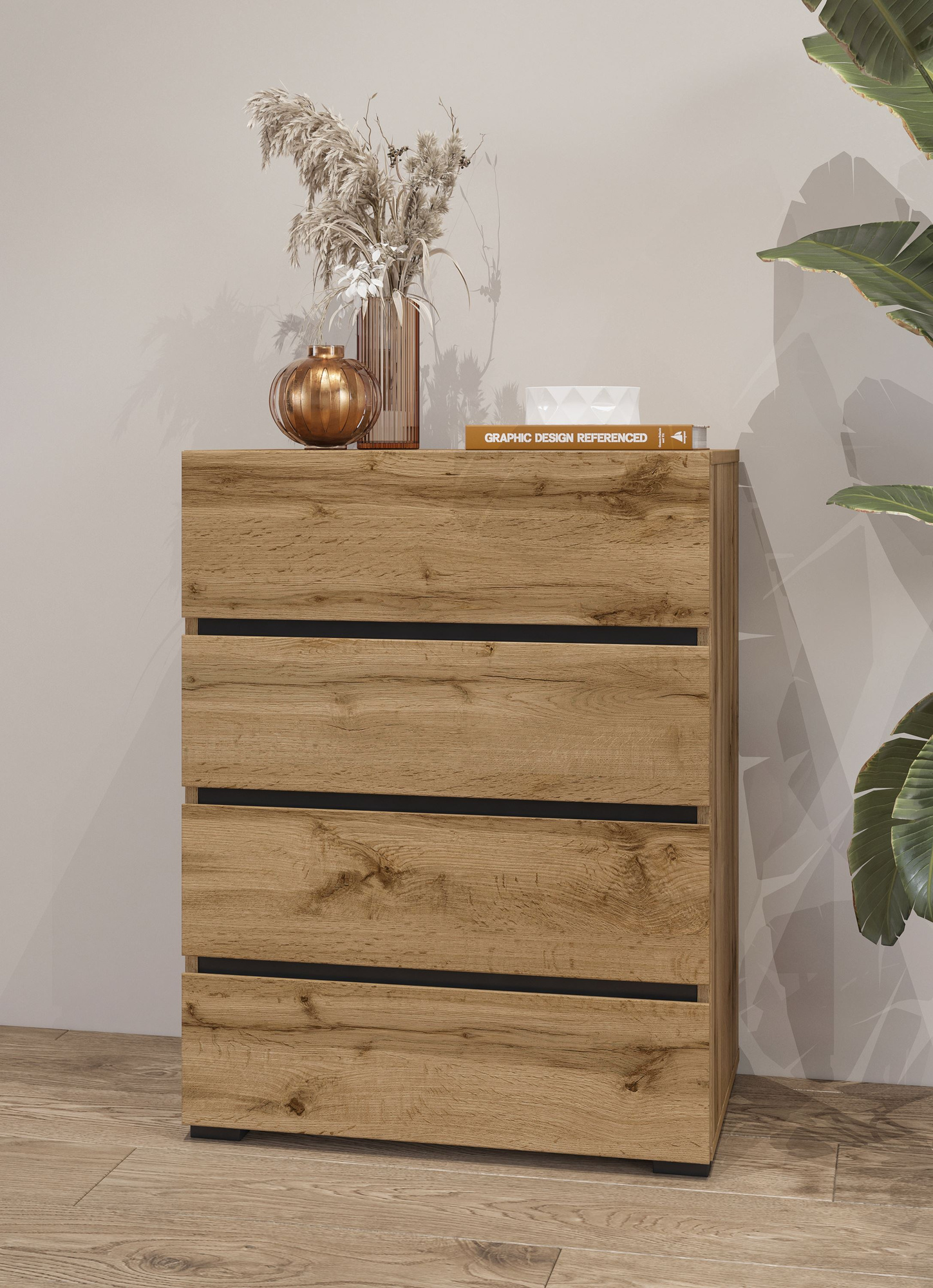 Atraskite ’Cross Hall“ komodą – tobulą elegancijos ir funkcionalumo derinį. Nesenstantis stilius, derinamas su modernia „Wotan“ ąžuolo ir matinės juodos spalvos apdaila, pavers ją ne tik praktišku baldu, bet ir unikalia bet kokio interjero puošmena. Dėl paprastų linijų ir prislopintų spalvų komoda puikiai derės prie įvairių interjerų – nuo minimalistinio iki klasikinio. Kiekvienas iš keturių „Cross Hall“ komodos stalčių buvo sukurtas galvojant apie maksimalų komfortą. Erdvūs skyriai suteikia puikią vietą laikyti smulkius daiktus, drabužius ar dokumentus, kurių visada reikia po ranka. Stalčiai sklandžiai juda ritininiais bėgeliais, užtikrindami komfortą ir paprastą naudojimą kiekvieną dieną, o subtilios rankenėlės suteikia elegancijos. Pagaminta iš aukštos kokybės laminuotos plokštės, komoda yra atspari pažeidimams ir lengvai valoma. Stilinga „Wotan“ ąžuolo mediena tikrai suteiks šilumos ir jaukumo jūsų interjerui. Kompaktiški matmenys – 60 cm pločio, 78 cm aukščio ir 40 cm gylio – daro ją puikiu sprendimu mažesnėms erdvėms, tokioms kaip koridorius, miegamasis ar svetainė.