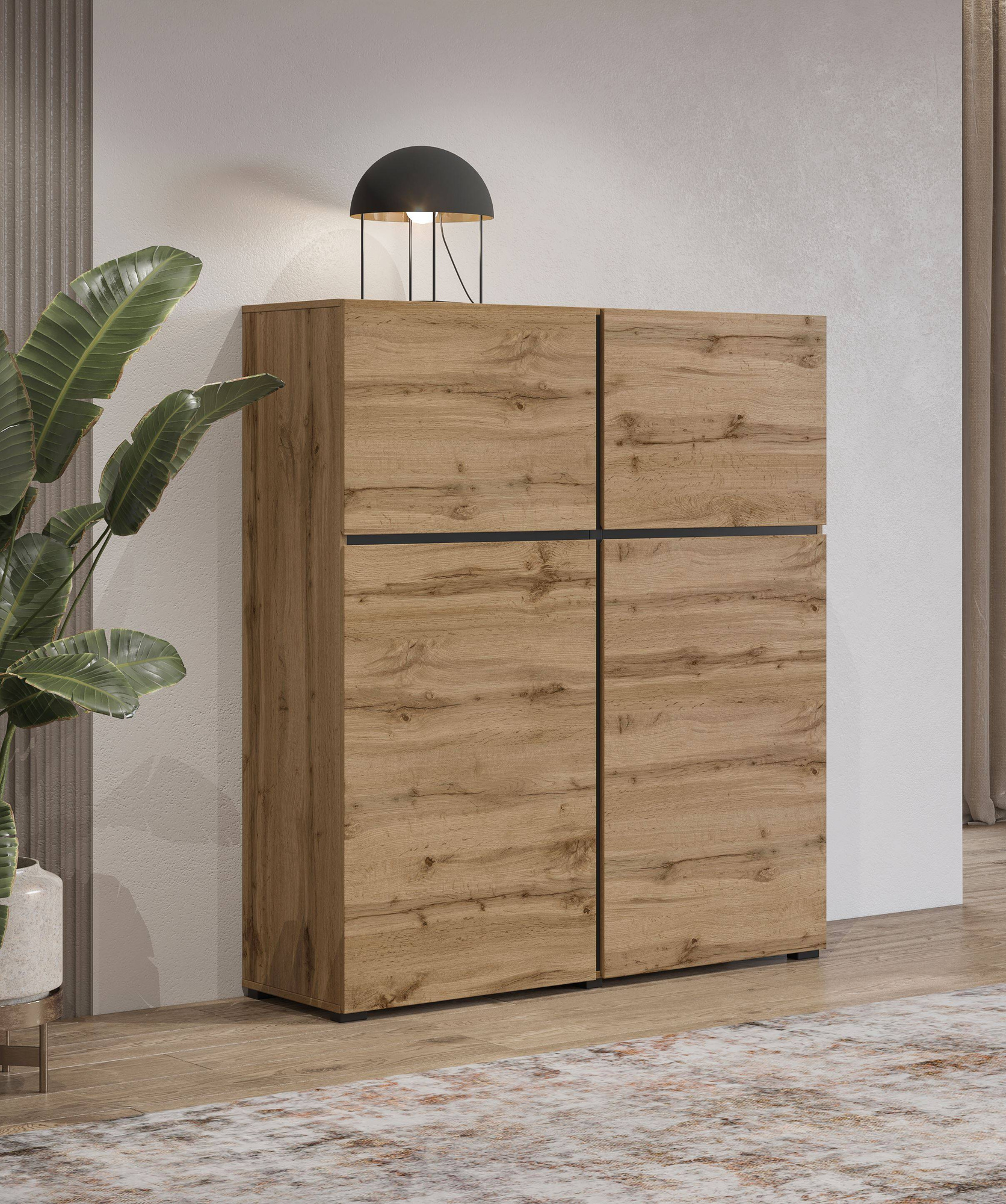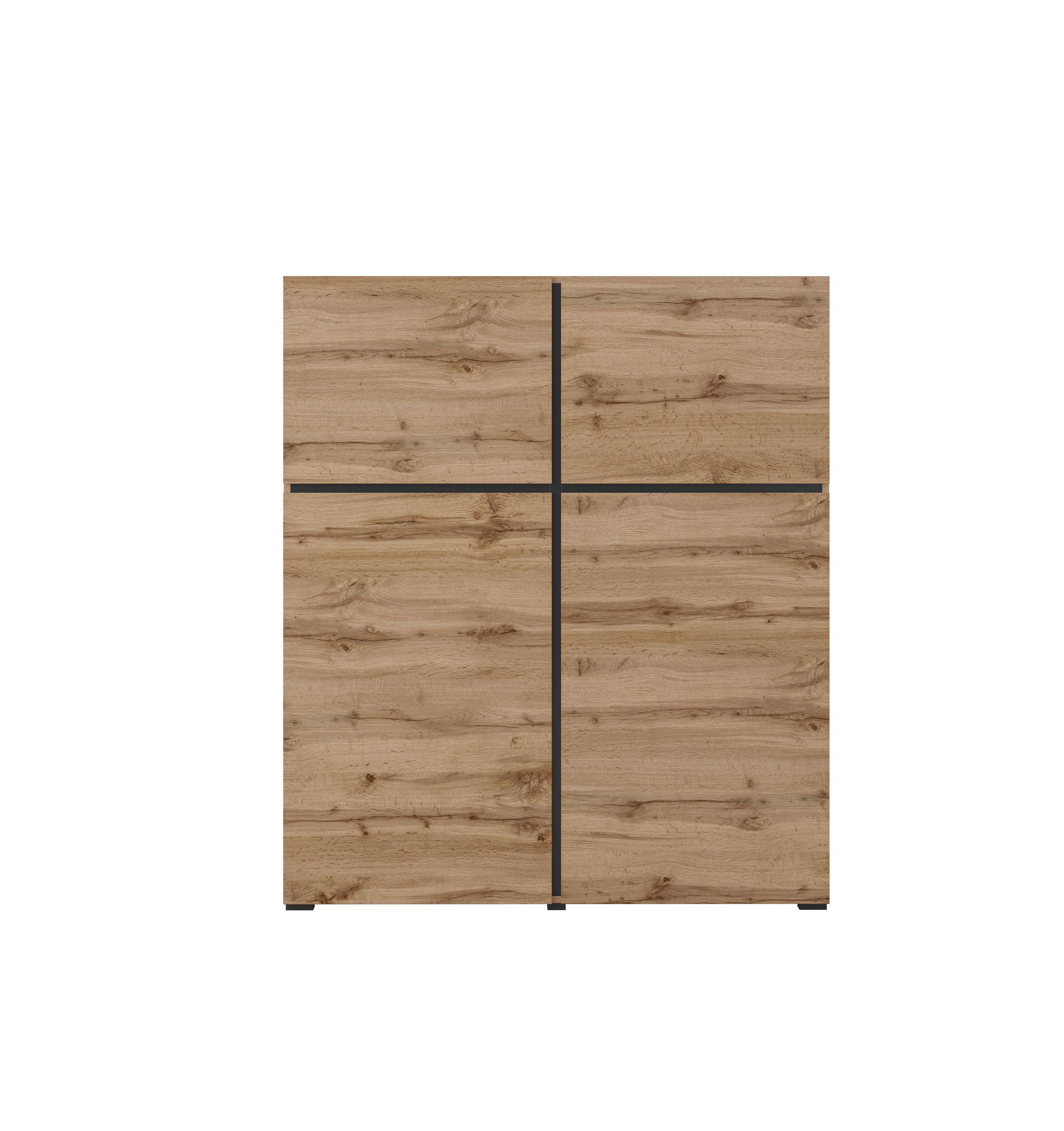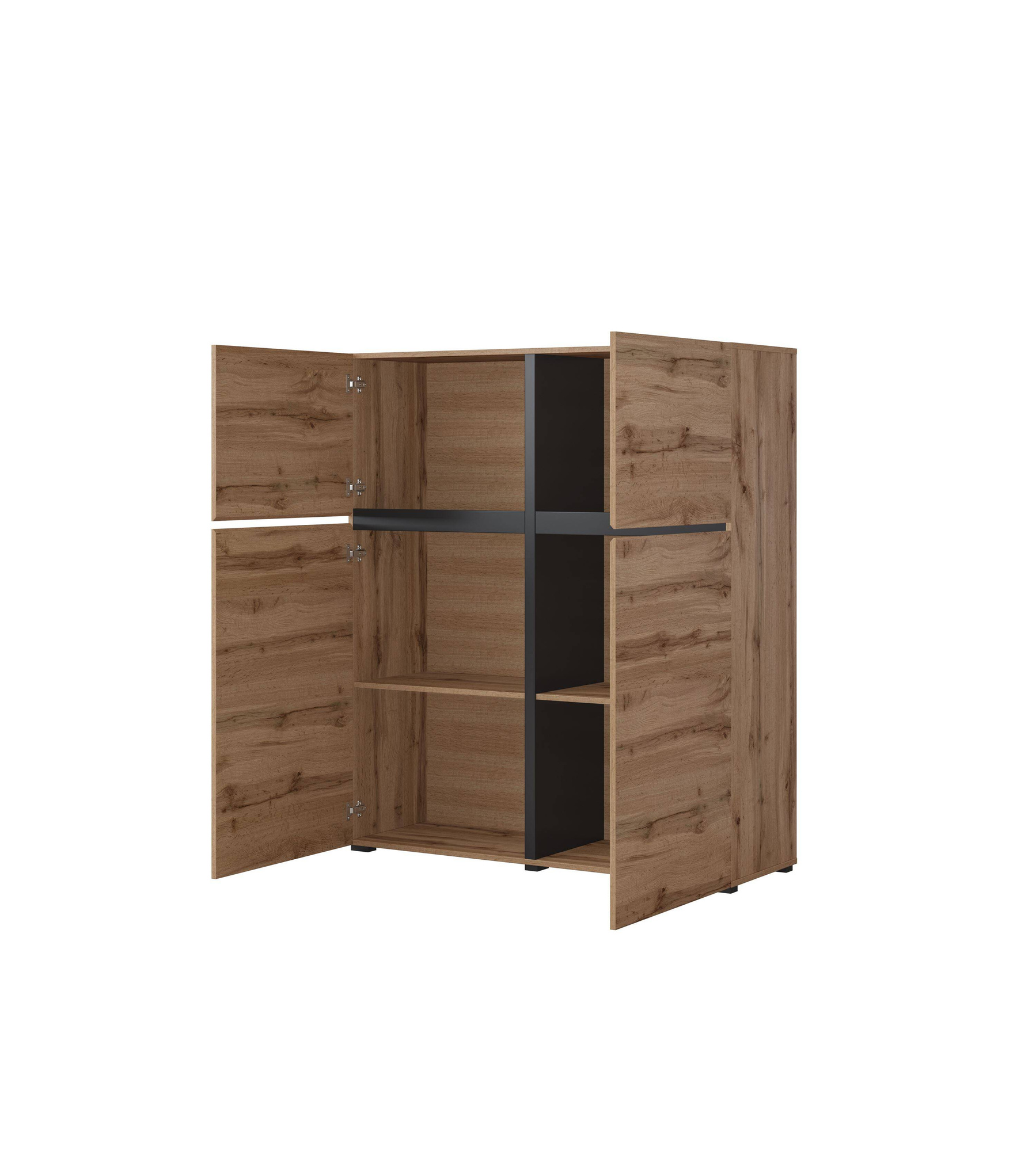 Atraskite aukštos „Cross“ komodos žavesį ir eleganciją – joje dera modernus dizainas ir natūralaus medžio šiluma. Unikalus „Wotan“ ąžuolo ir matinės juodos spalvos derinys suteikia jai subtilų akcentą, kuris puikiai papildo bet kokį interjerą. Ši komoda bet kurioje erdvėje sukuria jaukumo ir stiliaus pojūtį, o jos nesenstanti išvaizda patenkins net ir išrankiausius estetikos entuziastus. Šios komodos funkcionalumas transformuoja bet kurio kambario dizainą, derindamas eleganciją su praktiškumu, kad galėtumėte mėgautis harmonija ir tvarka savo aplinkoje. Aukšta forma ir keturios durelės suteikia daug vietos visiems jūsų reikalingiausiems daiktams susidėti. Nesvarbu, ar jums reikia laikyti knygas, dokumentus, ar kitus namų turtus, ši komoda pakels akis į progą. Pagaminta iš aukštos kokybės laminuotos plokštės, „Cross“ komoda garantuoja patvarumą ir tvirtumą. Jos konstrukcijoje naudojamos medžiagos užtikrina didelį atsparumą kasdieniam naudojimui, todėl tai idealus pasirinkimas tiems, kurie vertina kokybę, kuri tarnaus daugelį metų. Lengvai surenkama, todėl galite greitai pastatyti ją į vietą, kuri geriausiai papildys jūsų interjerą.