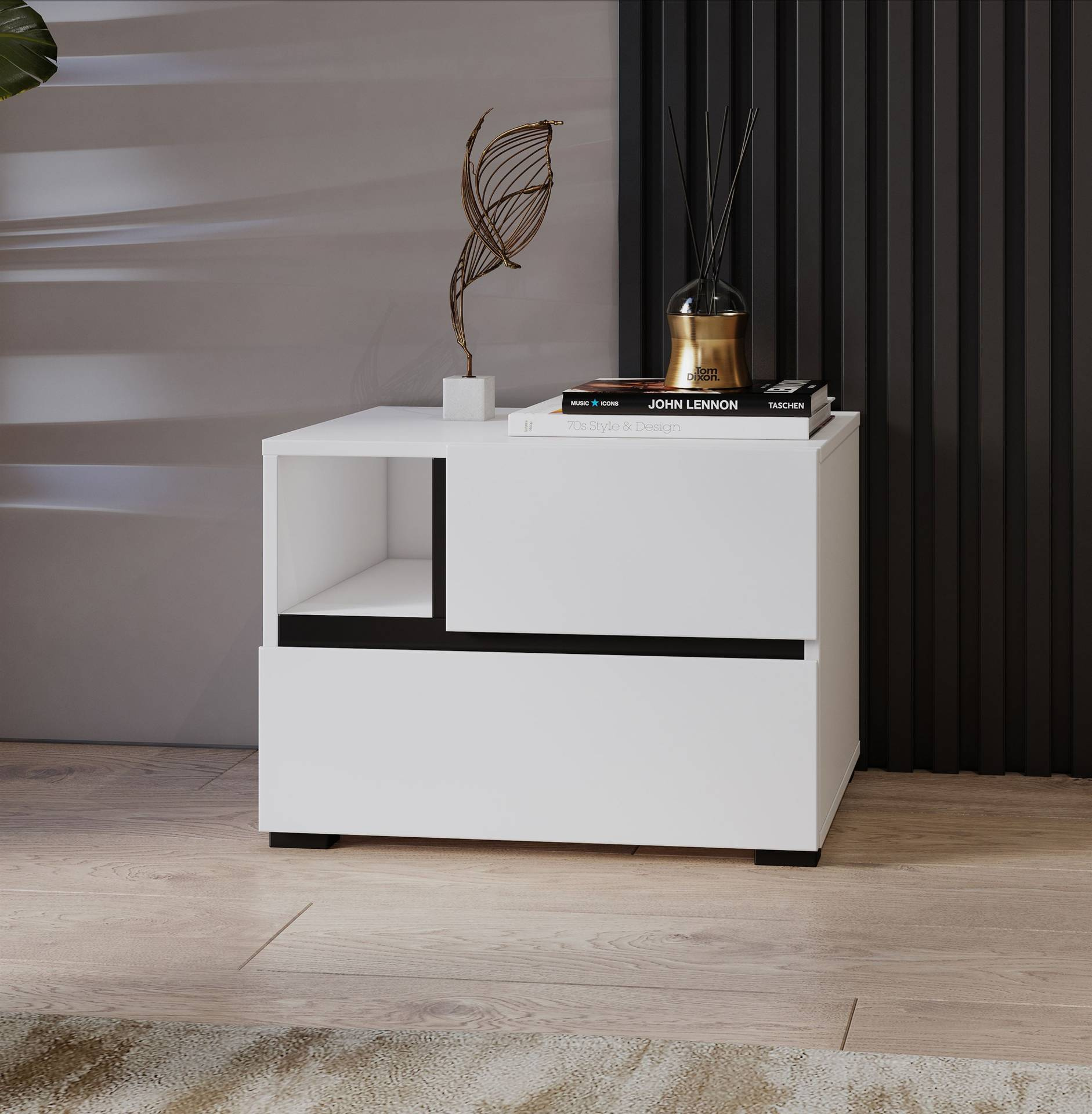 „Cross S“ – naktinis staliukas su 2 stalčiais, baltas, juodas, onikso spalvos, matinis