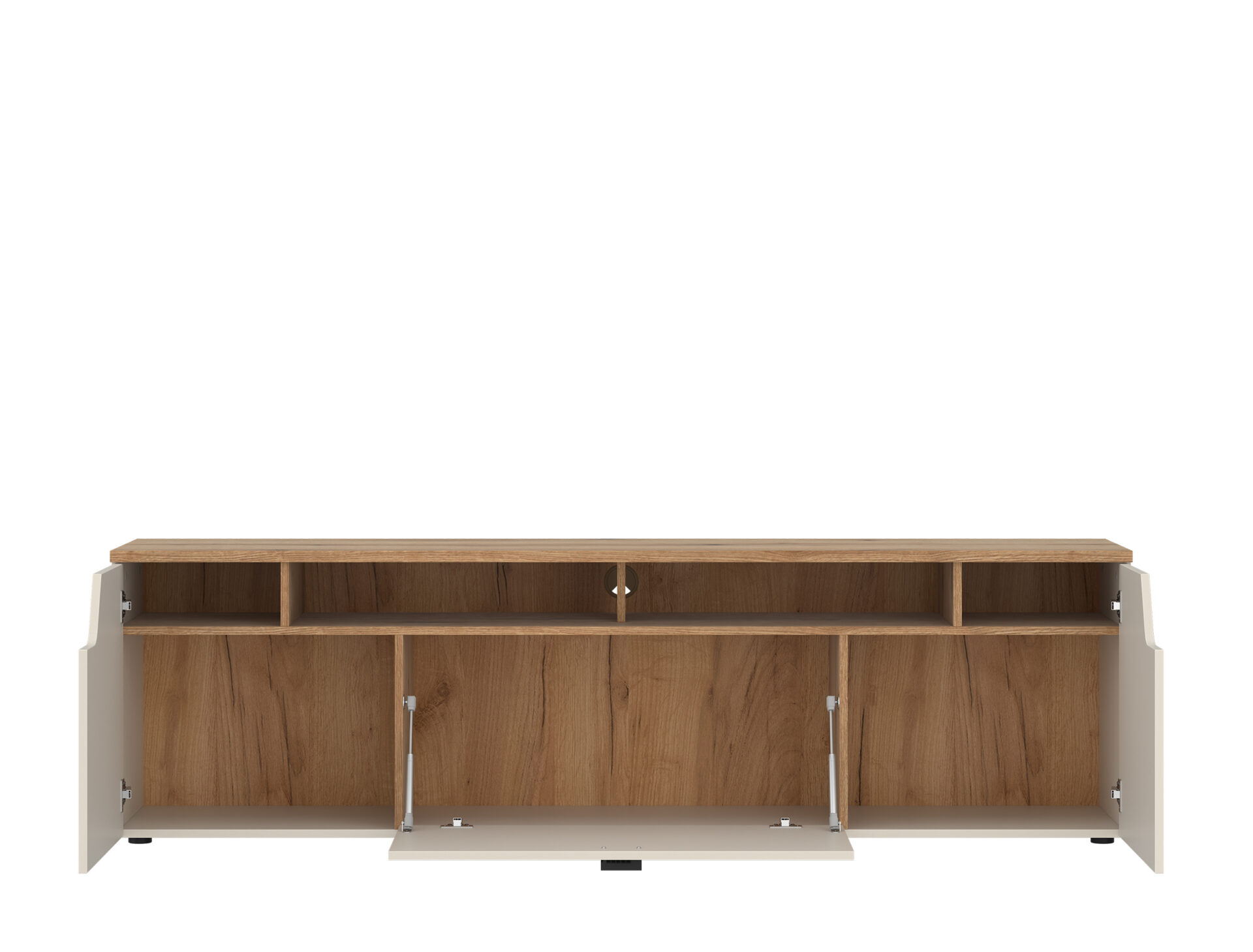 195 cm pločio, 56,5 cm aukščio ir 45 cm gylio CUT OUT spintelėje tilps visi svarbiausi televizoriaus priedai. Viduje lengvai sutalpinsite DVD diskus, nuotolinio valdymo pultelius, valdiklius ir kitus smulkius daiktus, kuriuos norite laikyti po ranka. Paslėpta laikymo vieta padeda tvarkingai laikyti daiktus, o tai labai svarbu bet kuriuose namuose.