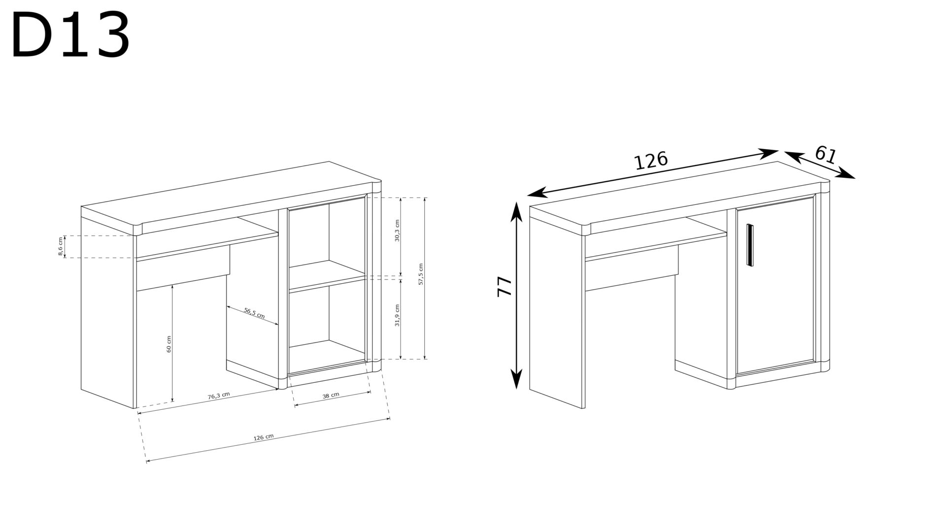 DALLAS-13 Sonoma ąžuolo rašomasis stalas įneš į jūsų interjerą natūralaus medžio šilumos. Minimalistinis dizainas ir elegantiškos linijos puikiai papildys tiek modernų, tiek klasikinį interjerą. Su gražiomis juodomis dekoratyvinėmis apvadais stalas tampa ne tik baldu, bet ir stilingu dekoratyviniu elementu. Dirbant iš namų ar mokantis, mums reikia gerai suprojektuotos erdvės, kuri skatintų produktyvumą. DALLAS-13 rašomasis stalas siūlo ne tik erdvų darbinį paviršių, bet ir ištraukiamą klaviatūros lentyną, leidžiančią optimizuoti stalo erdvę. Įmontuota spintelė su lentyna leidžia lengvai susitvarkyti dokumentus ir priedus, todėl kasdienės užduotys tampa daug lengvesnės. Stalo konstrukcija sukurta atsižvelgiant į stabilumą ir ilgaamžiškumą, užtikrinant patogų darbą ilgus metus. Jo matmenys – 126 cm pločio, 77 cm aukščio ir 61 cm gylio – siūlo tobulą erdvės ir funkcionalumo pusiausvyrą, todėl jis tinka net ir mažoms erdvėms. Stalas yra dviejų spalvų, todėl galite jį pritaikyti pagal savo individualius pageidavimus.