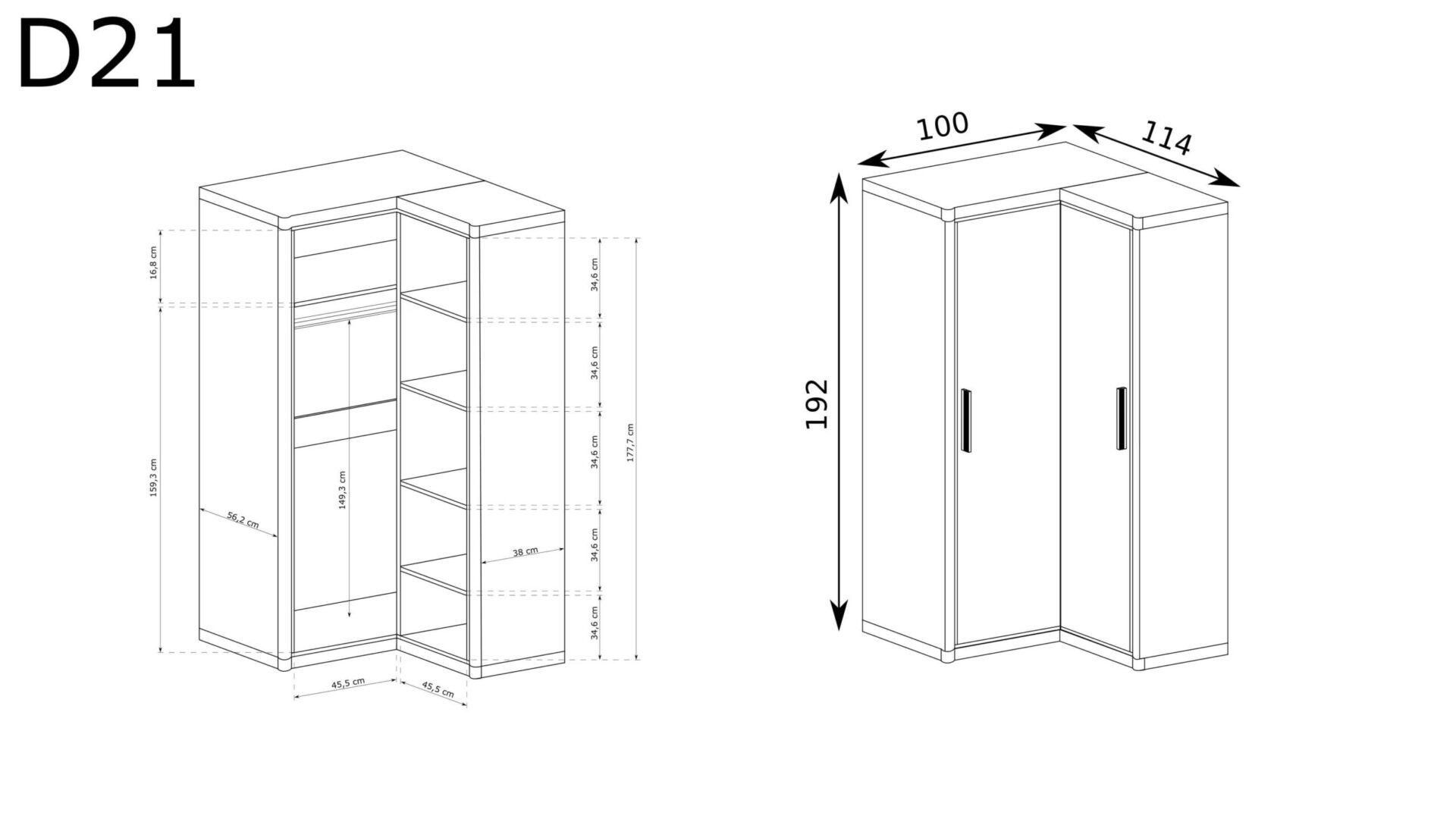 Pristatome DALLAS-21 kampinę spintą iš Sonoma Oak medienos, kuri unikaliai derina funkcionalumą ir eleganciją. Kompaktiški matmenys leidžia jai puikiai įsilieti į bet kurį jūsų buto, biuro ar darbo kambario kampelį. Modernus dizainas ir subtili spalva paverčia ją ne tik praktišku baldu, bet ir stilingu akcentu jūsų erdvėje. Spinta pasižymi dviejų durų konstrukcija, užtikrinančia lengvą prieigą prie vidaus. Vidus kruopščiai suplanuotas atsižvelgiant į jūsų poreikius daiktams laikyti. Ji leidžia patogiai pakabinti drabužius ant strypo, o papildoma lentyna virš jos puikiai tinka aksesuarams ar mažesniems daiktams laikyti. Kitoje pusėje yra praktiška erdvė su keturiomis lentynomis, leidžiančiomis tvarkingai susidėti knygas, dokumentus ir kasdienius daiktus. Pabrėždama modernų stilių, DALLAS-21 spinta taip pat žavi savo detalėmis. Juodos metalinės rankenos dera su visa konstrukcija, o juodos dekoratyvinės juostelės suteikia elegancijos. Šis derinys neabejotinai suteiks jūsų interjerui unikalų charakterį ir taps erdve, kuria norėsite pasigirti savo svečiams.