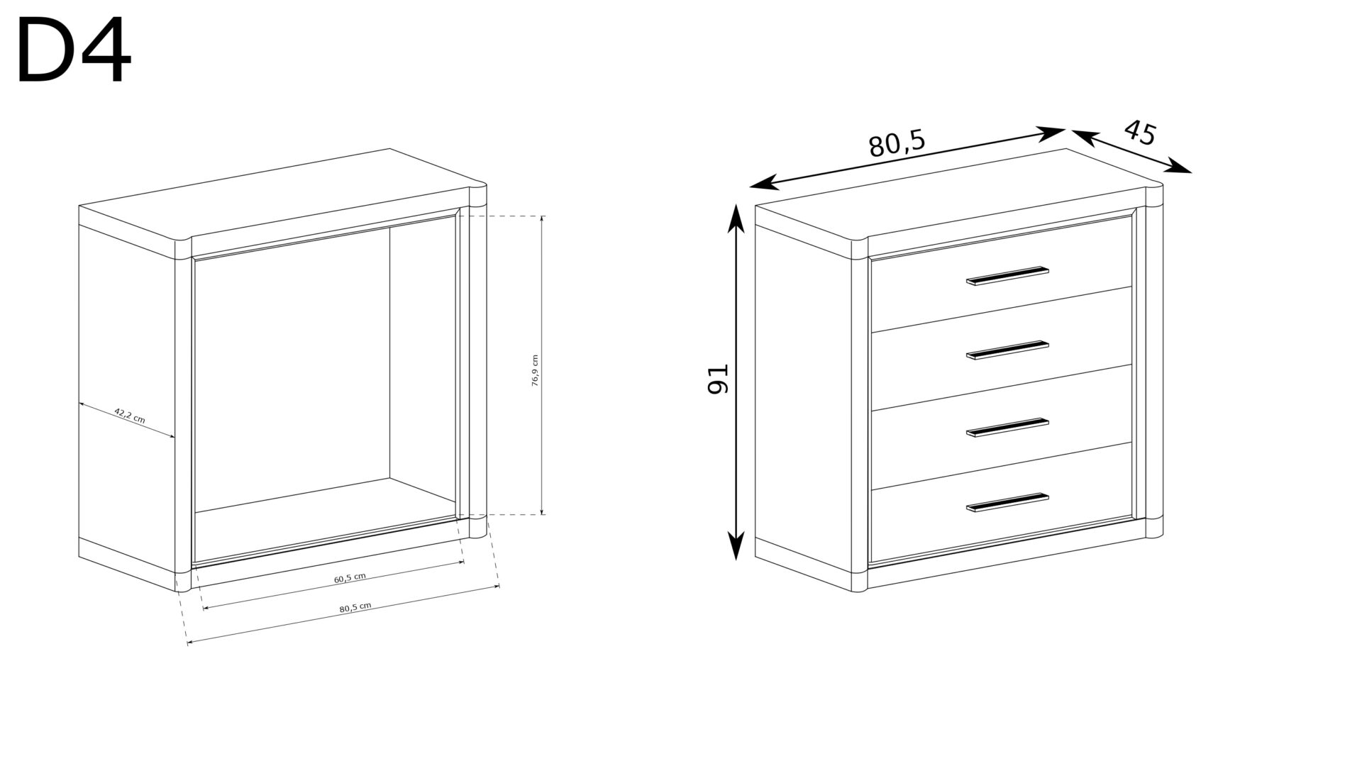 Komoda ’Dallas-4“ derina estetiką ir funkcionalumą. Pagaminta iš aukštos kokybės medžiagų, pasižyminčių elegantišku triufelių ąžuolo atspalviu, ji puikiai dera su moderniomis interjero dizaino tendencijomis. Minimalistinį dizainą papildo subtilios juodos rankenėlės, kurios ne tik traukia akį, bet ir suteikia charakterio, laužydamos tipiškų baldų šablonus. Ši komoda pasižymi keturiais erdviais stalčiais, kurie leidžia efektyviai organizuoti daiktus. Jei pavargote nuo netvarkos ir ieškote praktiško būdo laikyti drabužius ir aksesuarus, komoda „Dallas-4“ yra puikus sprendimas. Nesvarbu, ar ją pastatysite miegamajame, prieškambaryje, ar svetainėje, ji taps ne tik funkcionaliu elementu, bet ir estetiniu kambario papildymu. Aukštos kokybės komodos gamyba užtikrina ilgalaikį naudojimą, o naudojamos medžiagos, tokios kaip laminuota plokštė, garantuoja atsparumą pažeidimams ir lengvą kasdienę priežiūrą. Tai reiškia, kad galite mėgautis jos žavesiu daugelį metų, nesijaudindami dėl estetinės vertės praradimo. Metaliniai bėgeliai suteikia komforto ir neribojamą stalčių atidarymą – tai, ką tikrai įvertinsite kiekvieną dieną.