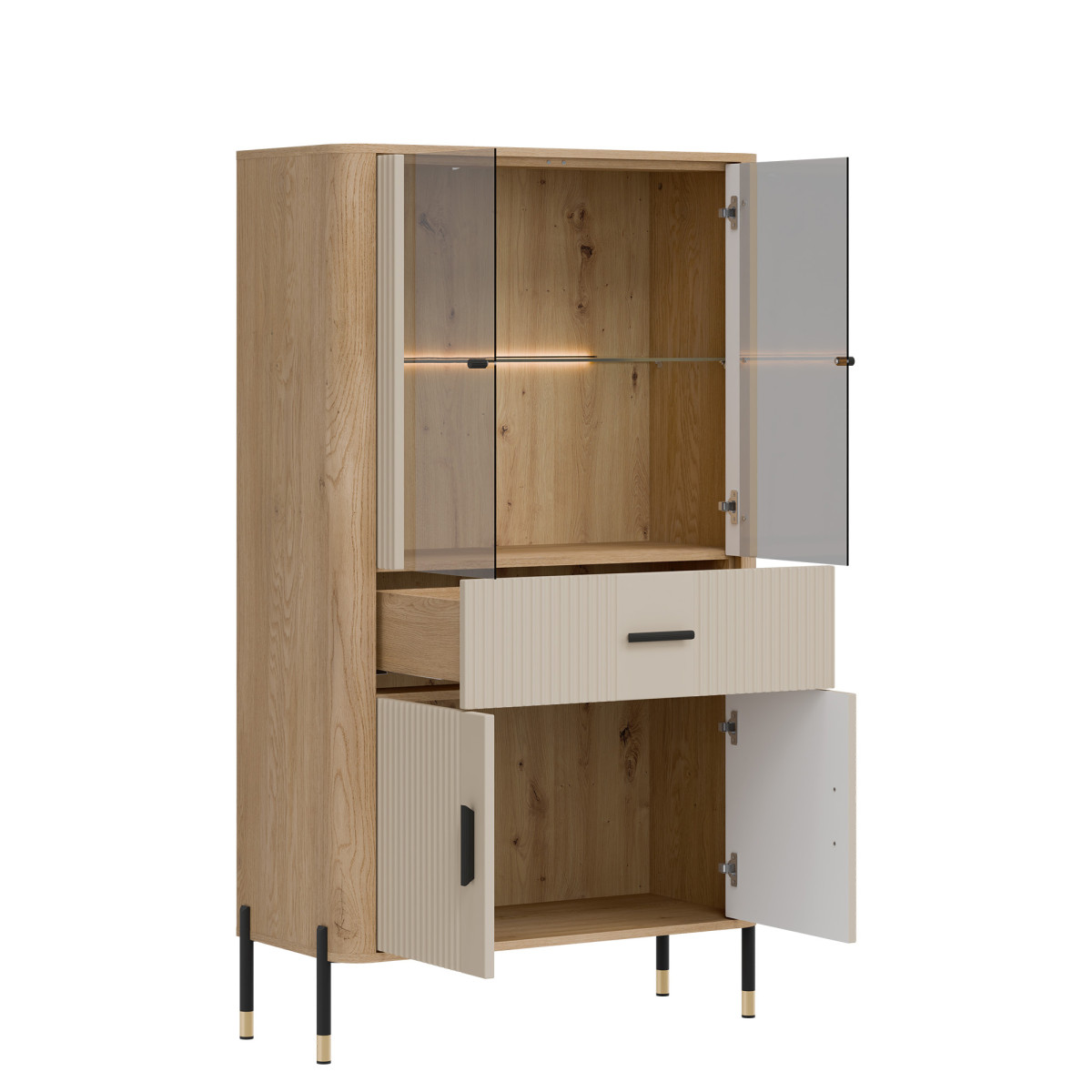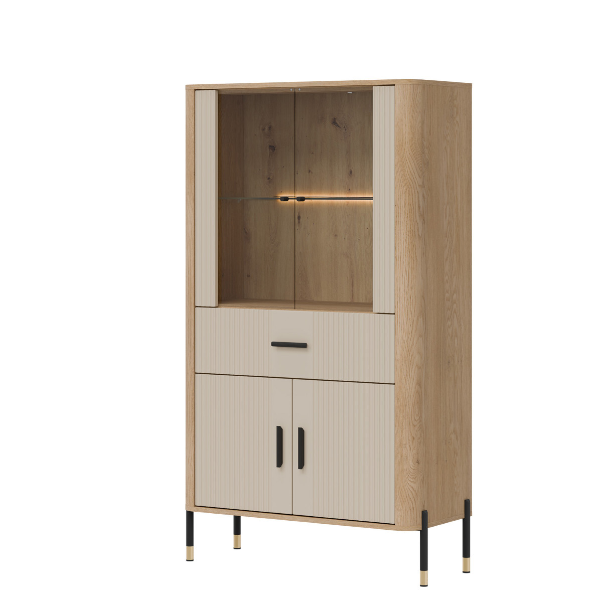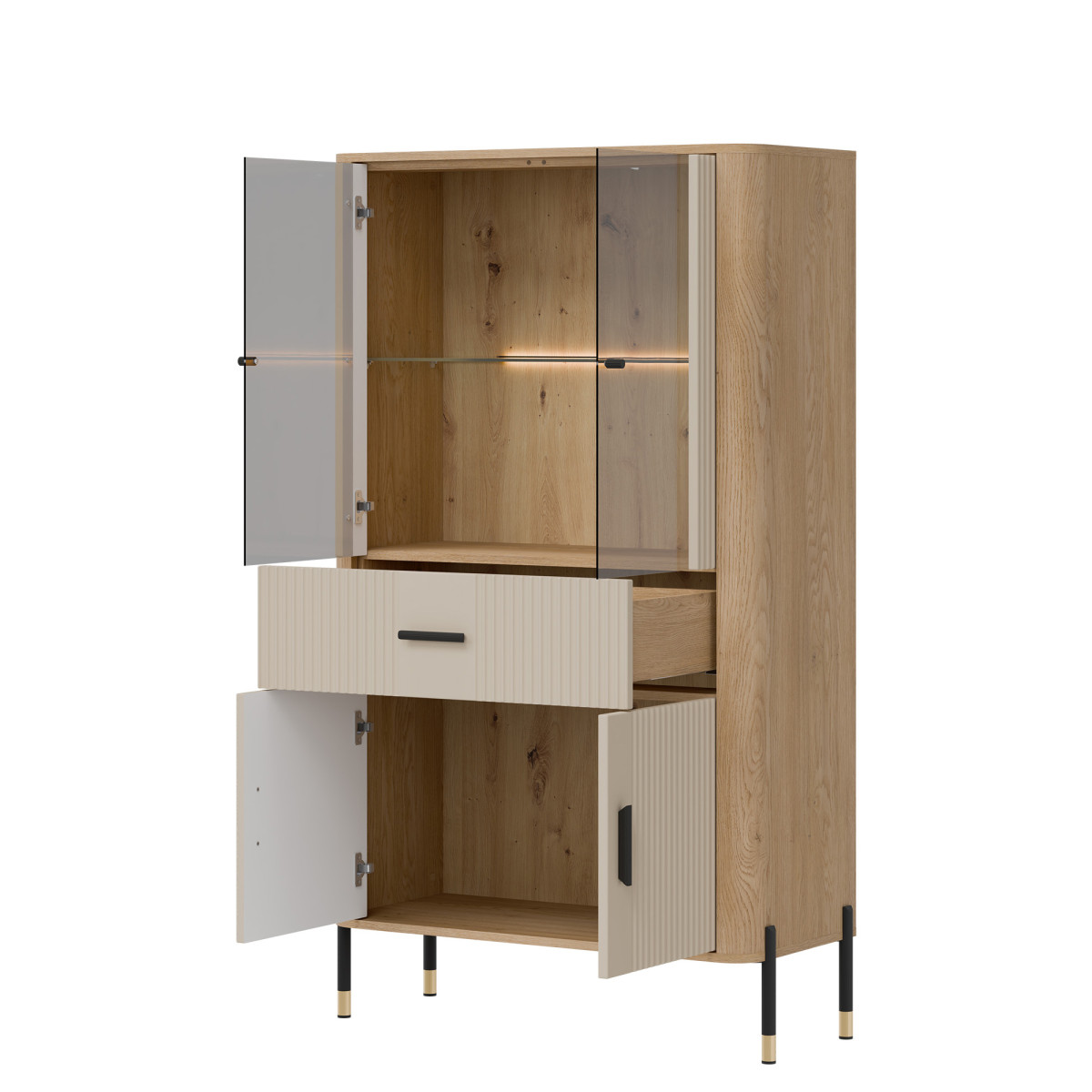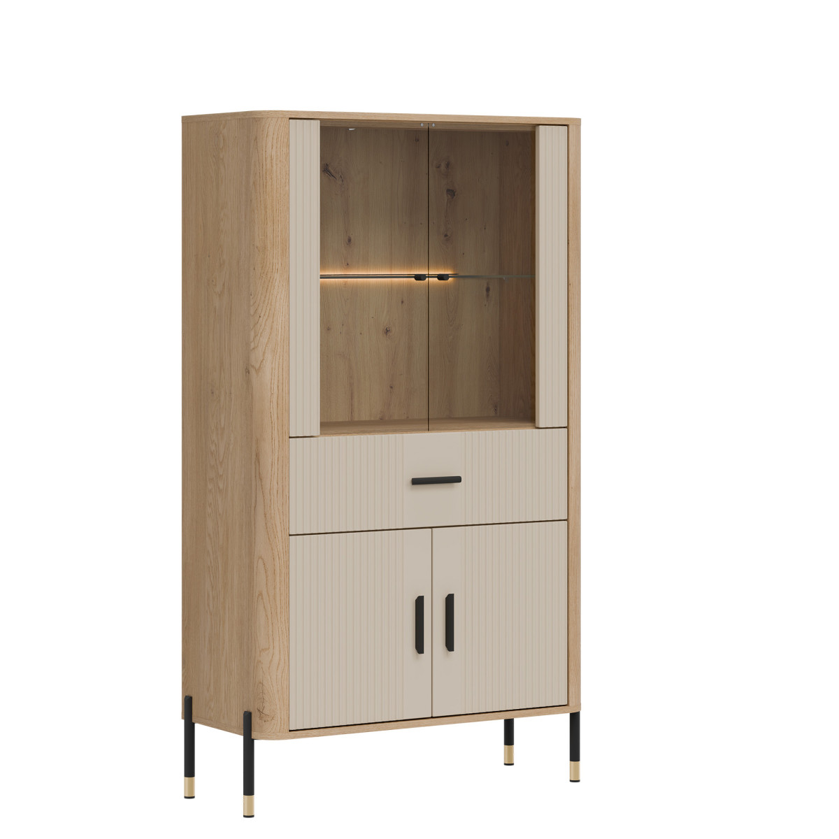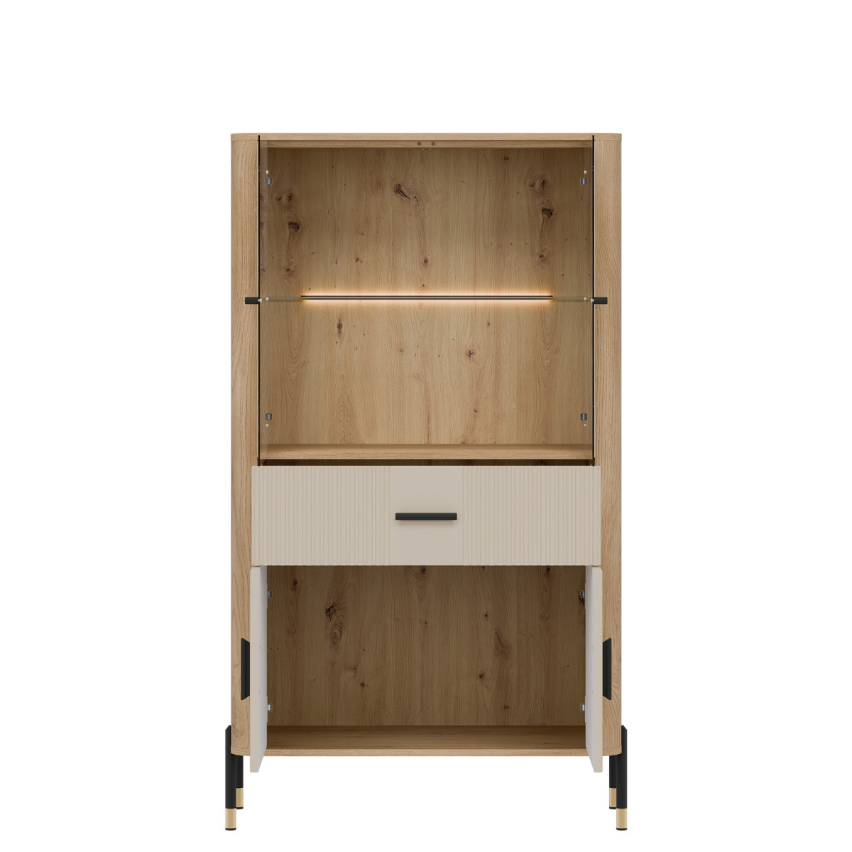 „Dante DT12“ vitrina – elegantiška ekspozicija ir funkcionalus daiktų laikymas. „Dante DT12“ derina modernų stilių, funkcionalumą ir subtilų rafinuotumą. Ši elegantiška vitrina sukurta tiems, kurie nori dekoratyvioje aplinkoje pademonstruoti gražiausius savo interjero elementus – porcelianą, stiklo dirbinius, kolekcinius daiktus ar suvenyrus. Viršutinė spintelės dalis yra stiklinė su pasirenkamu subtiliu LED apšvietimu, kuris subtiliai išryškina ir paryškina viduje esančius daiktus. Natūralaus medžio dekoras suteikia visam baldui šiltą, jaukų pojūtį ir puikiai kontrastuoja su matine fasadų spalva, kurią galima rinktis iš penkių spalvų. Tai erdvė, kuri sukuria atmosferą – tiek svetainėje, tiek valgomajame. Apatinėje spintelės dalyje yra praktiškas stalčius ir erdvi dvidurė spintelė, kurioje yra daug vietos kasdieniams daiktams laikyti – nuo staltiesių iki dokumentų ir stalo įrankių. Auksinės arba juodos rankenėlės ir elegantiškos juodos bei auksinės metalinės kojelės suteikia lengvumo ir išskirtinumo, todėl DT12 vitrina tampa tikru bet kokio interjero akcentu. „Dante“ vitrina – eksponuokite vertingiausius savo daiktus. Paslėpkite būtiniausius daiktus. Rinkitės vitriną, kurioje dera rafinuota estetika ir kasdienis funkcionalumas. „Dante DT12“ – tai baldas, kuris suteiks charakterio ir tvarkos bet kuriai erdvei – nepriklausomai nuo jūsų interjero stiliaus.