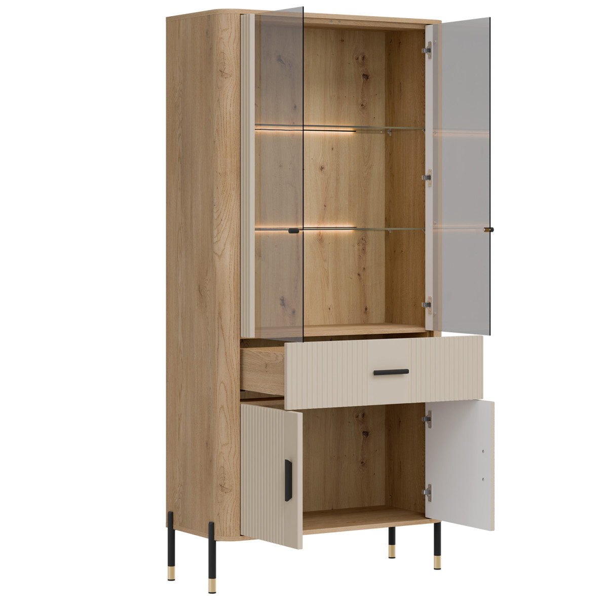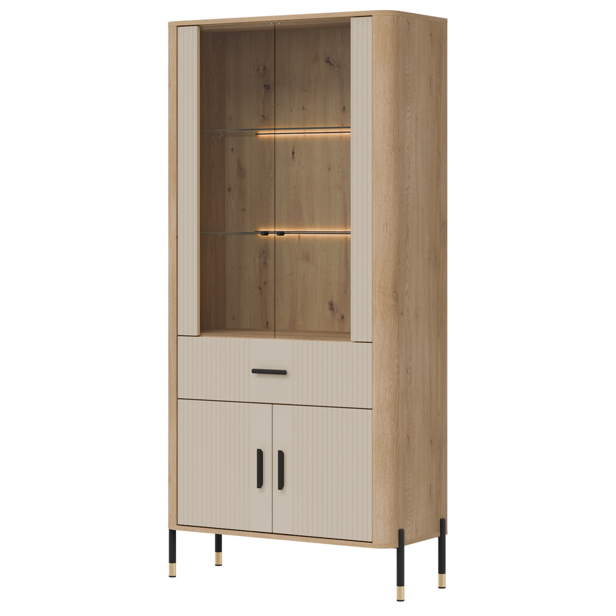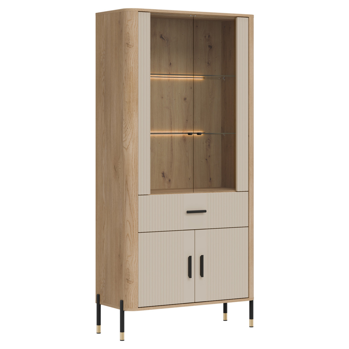 „Dante DT14“ vitrina – tai išskirtinio stiliaus ekspozicijos erdvė. „Dante DT14“ – tai tobulas elegancijos, modernaus dizaino ir funkcionalumo derinys. Sukurta interjerams, kuriuose svarbi kiekviena detalė, ji puikiai tinka svetainei, valgomajam ar namų biurui – bet kur, kur norite derinti estetiką su praktišku daiktų laikymu. Viršutinė spintelės dalis yra stiklinė vitrina su pasirenkamu LED foniniu apšvietimu, kurioje demonstruojami brangiausi jūsų daiktai – nuo šeimos relikvijų, stiklo ir keramikos iki dizainerių sukurtų aksesuarų. Šilta šviesa išryškina natūralią medienos tekstūrą ir suteikia interjerui jaukią atmosferą. Apatinėje dalyje yra praktiškas stalčius ir erdvi dvidurė spintelė, kuri padės jums tvarkingai laikyti daiktus ir paslėpti mažiau svarbius daiktus. Vitrina išsiskiria unikaliu spalvų deriniu – matiniai fasadai, kuriuos galima įsigyti penkių spalvų, kartu su meniško ąžuolo dekoru sukuria elegantišką, tačiau nesenstantį kontrastą. Auksinių arba juodų rankenėlių ir kojelių detalių pasirinkimas užbaigia išvaizdą, suteikdamas subtilų prabangos akcentą. DT14 – vitrina, kuri sustiprins jūsų interjero charakterį. Leiskite estetikai ir funkcionalumui susijungti viename – rinkitės DT14 AZ ir sukurkite erdvę, kuri įkvepia kiekvieną dieną.