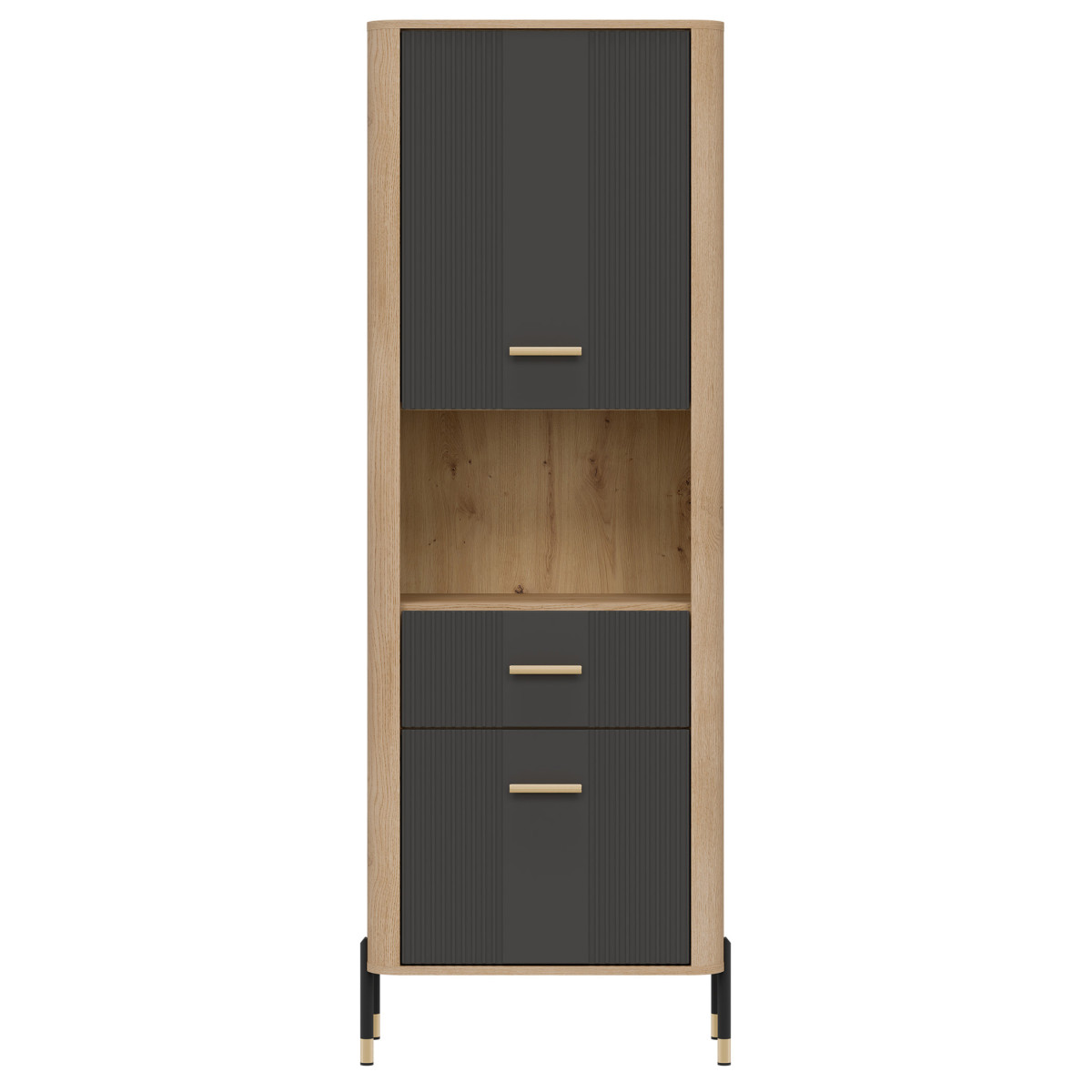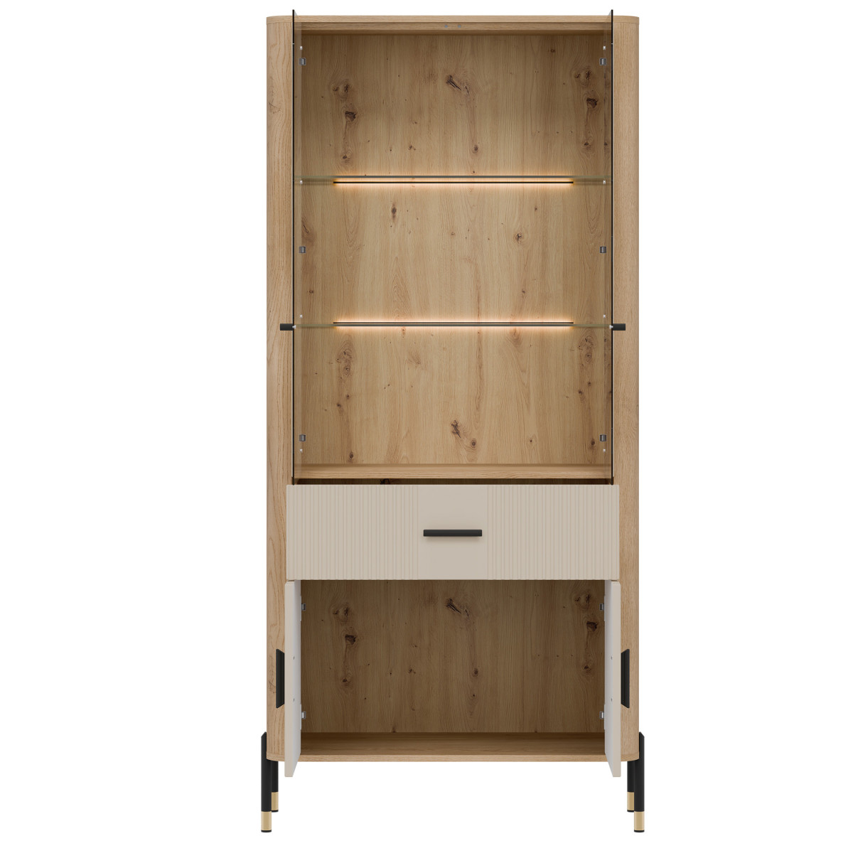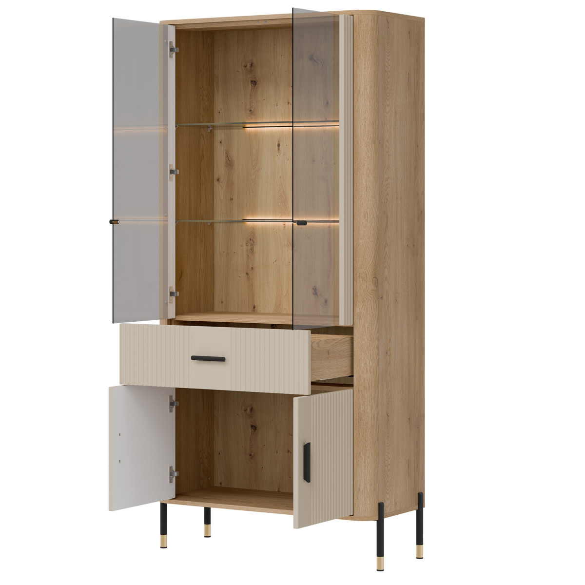 „Dante DT14“ vitrina – tai išskirtinio stiliaus ekspozicijos erdvė. „Dante DT14“ – tai tobulas elegancijos, modernaus dizaino ir funkcionalumo derinys. Sukurta interjerams, kuriuose svarbi kiekviena detalė, ji puikiai tinka svetainei, valgomajam ar namų biurui – bet kur, kur norite derinti estetiką su praktišku daiktų laikymu. Viršutinė spintelės dalis yra stiklinė vitrina su pasirenkamu LED foniniu apšvietimu, kurioje demonstruojami brangiausi jūsų daiktai – nuo šeimos relikvijų, stiklo ir keramikos iki dizainerių sukurtų aksesuarų. Šilta šviesa išryškina natūralią medienos tekstūrą ir suteikia interjerui jaukią atmosferą. Apatinėje dalyje yra praktiškas stalčius ir erdvi dvidurė spintelė, kuri padės jums tvarkingai laikyti daiktus ir paslėpti mažiau svarbius daiktus. Vitrina išsiskiria unikaliu spalvų deriniu – matiniai fasadai, kuriuos galima įsigyti penkių spalvų, kartu su meniško ąžuolo dekoru sukuria elegantišką, tačiau nesenstantį kontrastą. Auksinių arba juodų rankenėlių ir kojelių detalių pasirinkimas užbaigia išvaizdą, suteikdamas subtilų prabangos akcentą. DT14 – vitrina, kuri sustiprins jūsų interjero charakterį. Leiskite estetikai ir funkcionalumui susijungti viename – rinkitės DT14 AZ ir sukurkite erdvę, kuri įkvepia kiekvieną dieną.