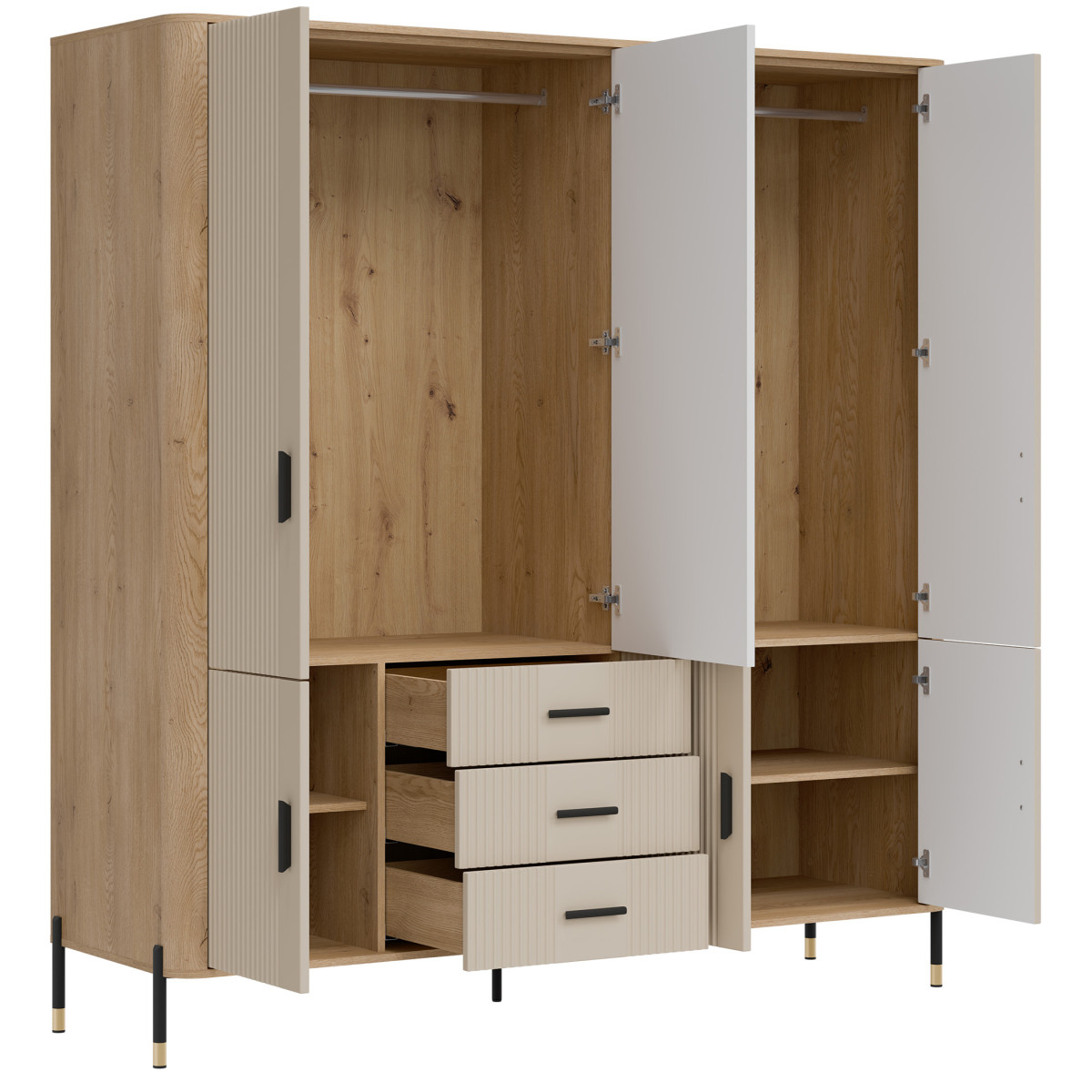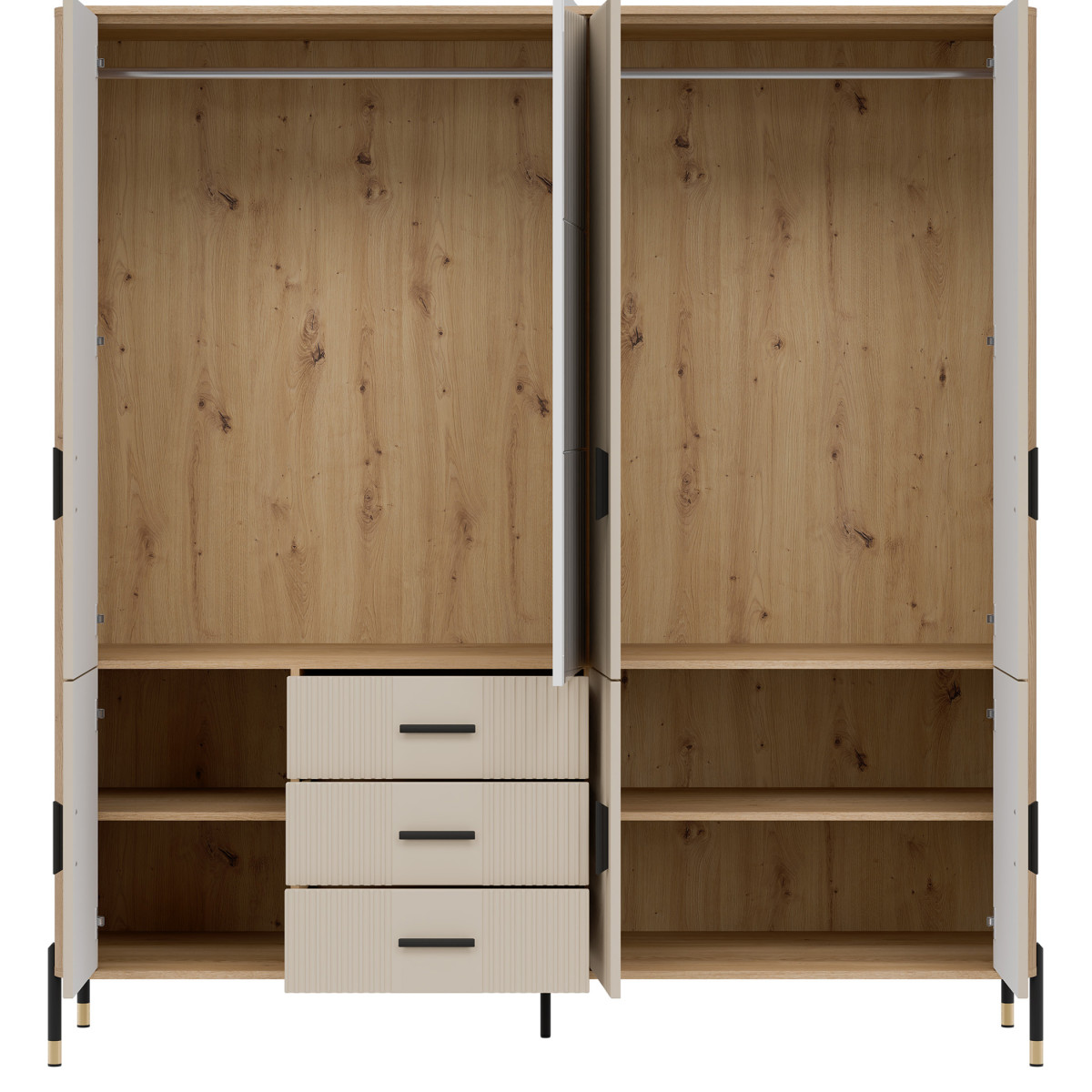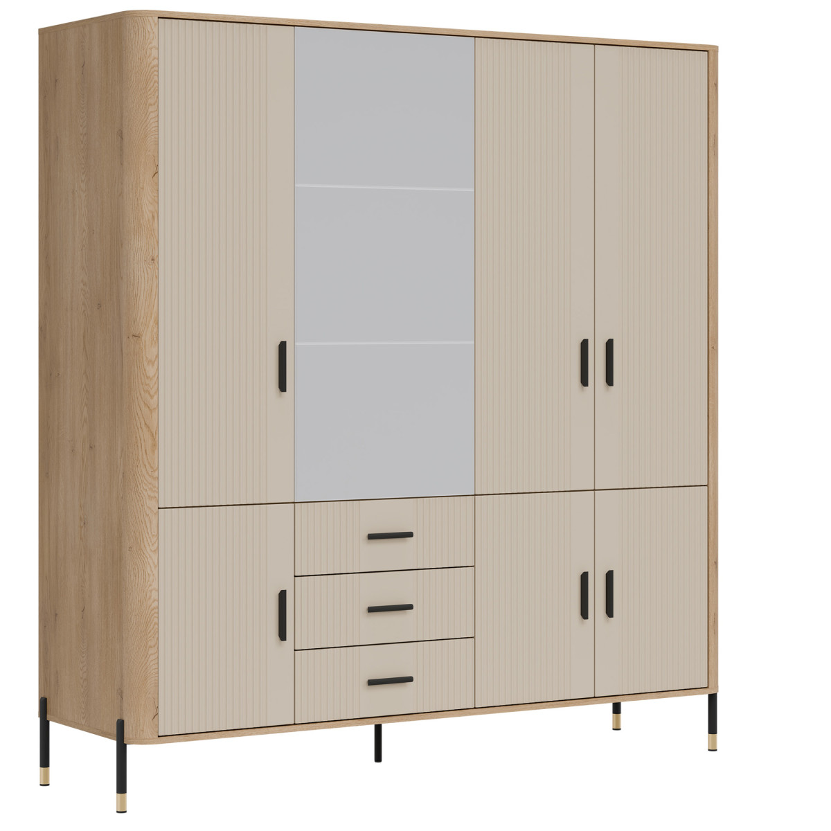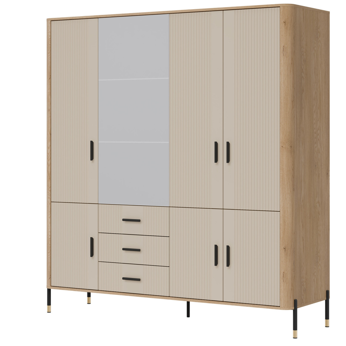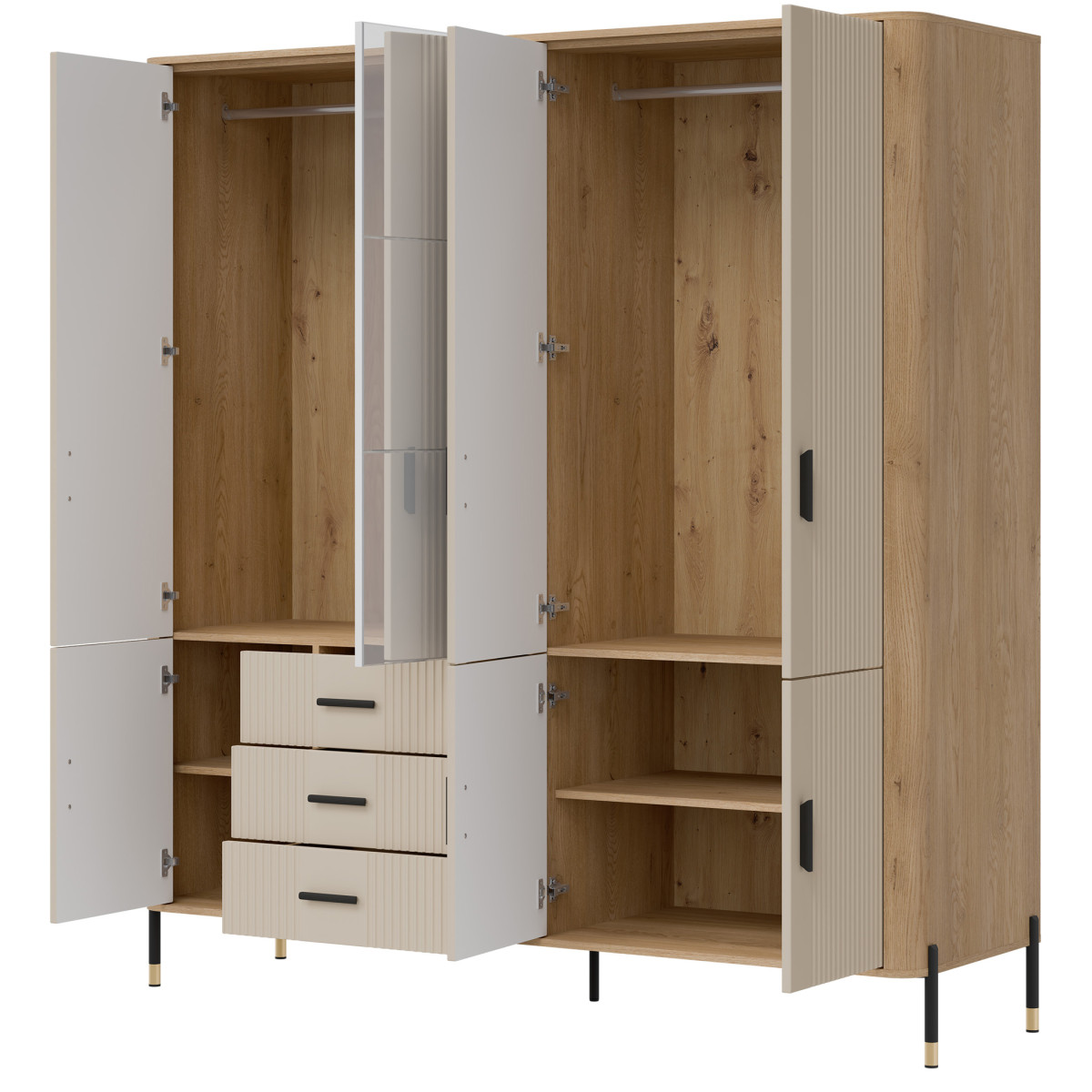7D DT17 spinta – įspūdinga forma, nesenstantis stilius. „Dante DT17“ – tai baldas, kuris ne tik traukia akį elegantišku dizainu, bet ir žavi funkcionalumu. Ši erdvi spinta – idealus pasirinkimas tiems, kurie vertina aukštą meistriškumo kokybę, apgalvotą erdvės organizavimą ir modernų dizainą. Centrinę spintos dalį užima keturios didelės durys, užtikrinančios puikų patekimą į praktišką ir erdvų vidų. Durys su dideliu veidrodžiu suteikia baldui lengvumo ir elegancijos. Apatinėje dalyje yra keturi praktiški stalčiai, kuriuose lengva susidėti smulkius aksesuarus. Baldai dekoruoti madinga spalvų gama: matinės apdailos, kurią galima pasirinkti iš penkių atspalvių, ir ąžuolo medienos dekoro derinys sukuria harmoningą ir prabangų kontrastą. Visuma užbaigiama plonomis auksinėmis arba juodomis rankenėlėmis ir metalinėmis kojelėmis, kurios pabrėžia modernų, tačiau šiltą baldo charakterį. „Dante 7D“ spinta – stiliaus ir funkcionalumo centras jūsų interjere. Šis modelis puikiai tinka svetainei, valgomajam ar biurui – visur, kur svarbiausia estetika ir tobula organizuotumas. DT17 spinta sukurs charakteringą erdvę.
