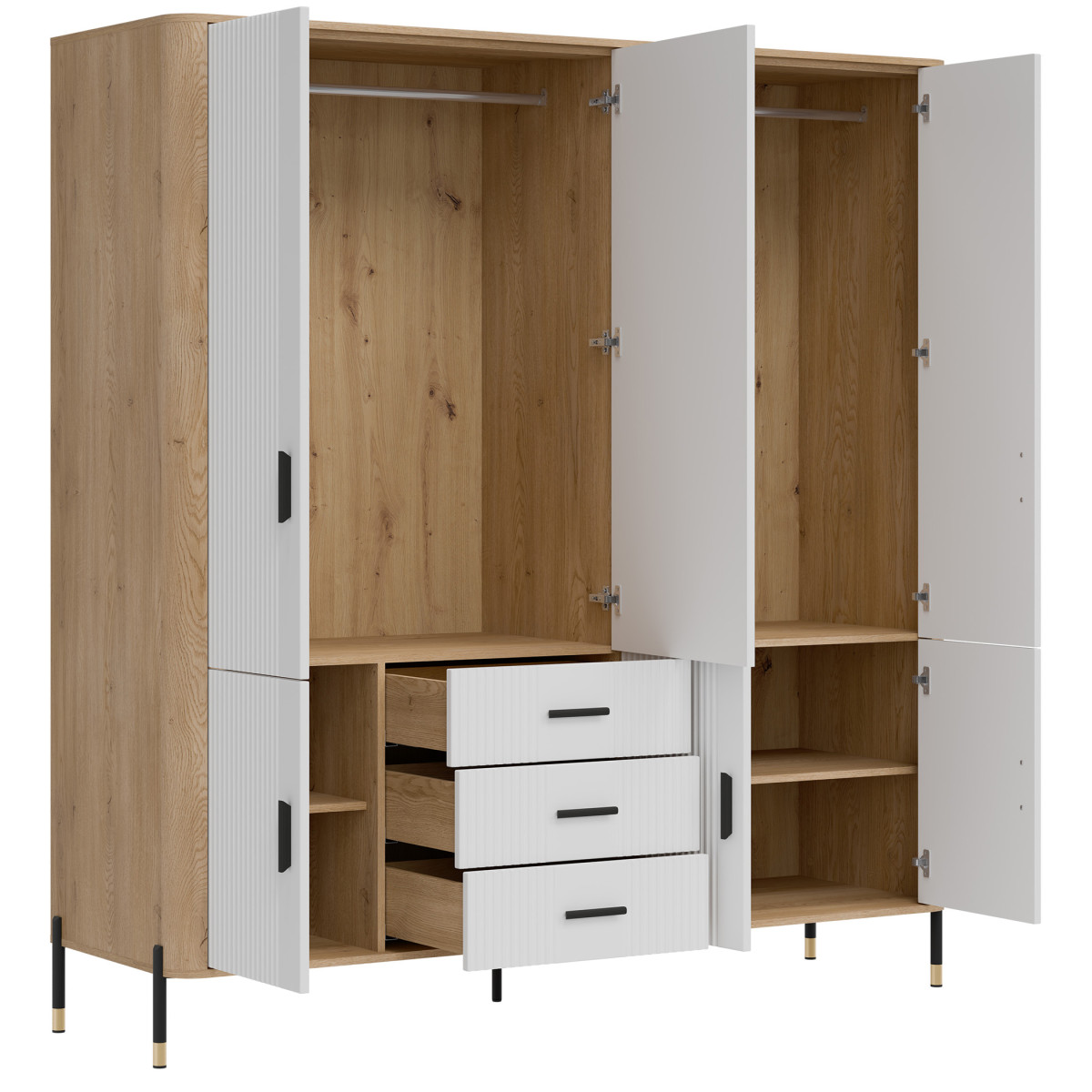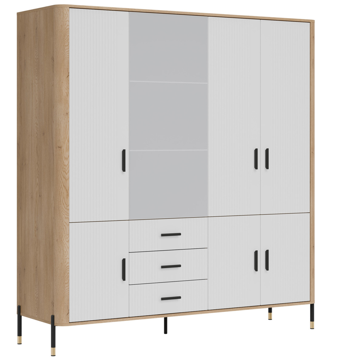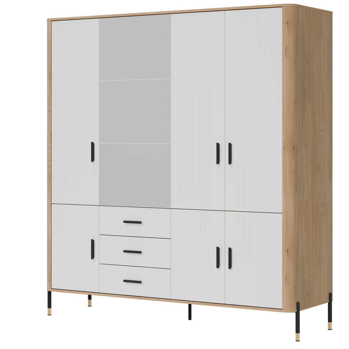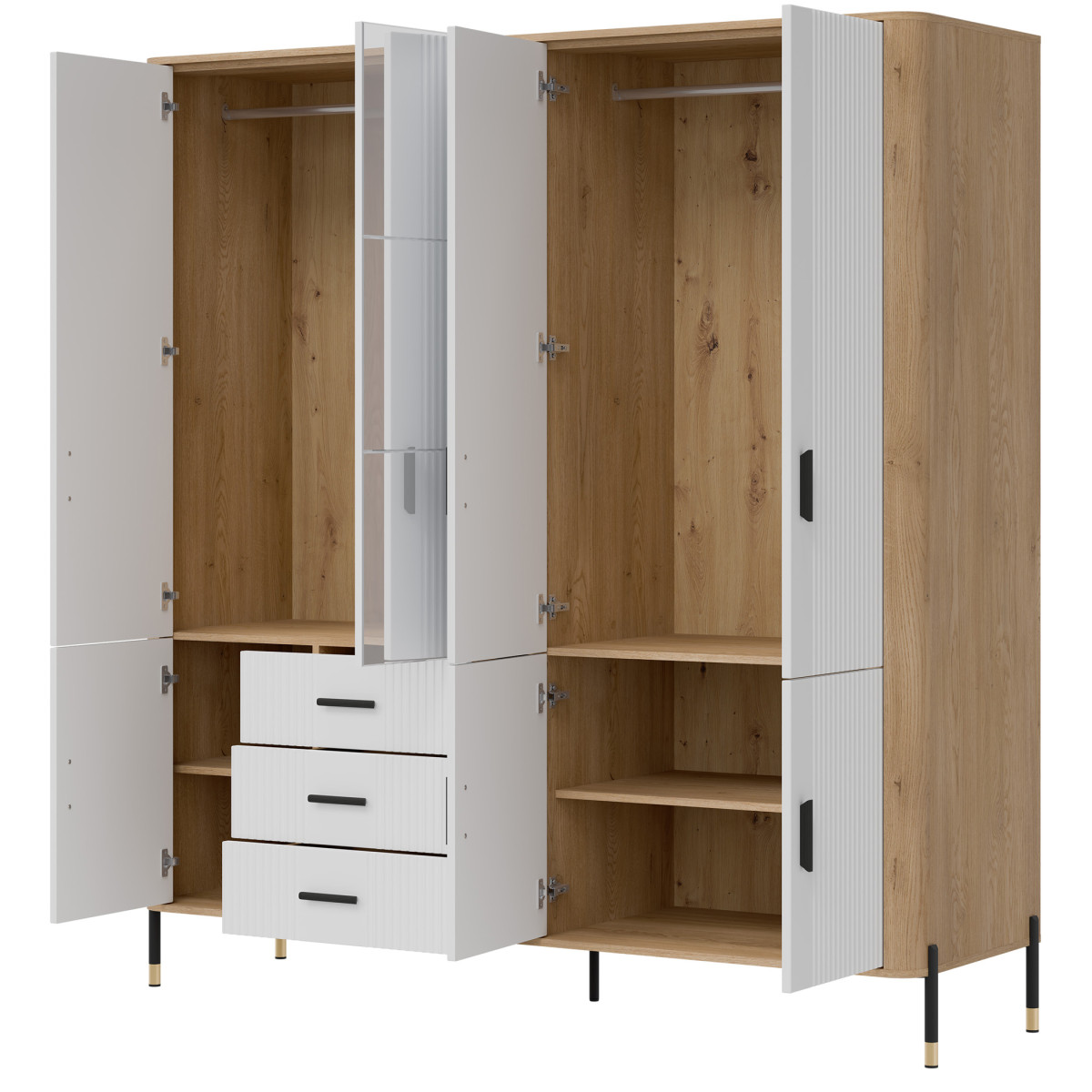 7D DT17 spinta – įspūdinga forma, nesenstantis stilius. „Dante DT17“ – tai baldas, kuris ne tik traukia akį elegantišku dizainu, bet ir žavi funkcionalumu. Ši erdvi spinta – idealus pasirinkimas tiems, kurie vertina aukštą meistriškumo kokybę, apgalvotą erdvės organizavimą ir modernų dizainą. Centrinę spintos dalį užima keturios didelės durys, užtikrinančios puikų patekimą į praktišką ir erdvų vidų. Durys su dideliu veidrodžiu suteikia baldui lengvumo ir elegancijos. Apatinėje dalyje yra keturi praktiški stalčiai, kuriuose lengva susidėti smulkius aksesuarus. Baldai dekoruoti madinga spalvų gama: matinės apdailos, kurią galima pasirinkti iš penkių atspalvių, ir ąžuolo medienos dekoro derinys sukuria harmoningą ir prabangų kontrastą. Visuma užbaigiama plonomis auksinėmis arba juodomis rankenėlėmis ir metalinėmis kojelėmis, kurios pabrėžia modernų, tačiau šiltą baldo charakterį. „Dante 7D“ spinta – stiliaus ir funkcionalumo centras jūsų interjere. Šis modelis puikiai tinka svetainei, valgomajam ar biurui – visur, kur svarbiausia estetika ir tobula organizuotumas. DT17 spinta sukurs charakteringą erdvę.