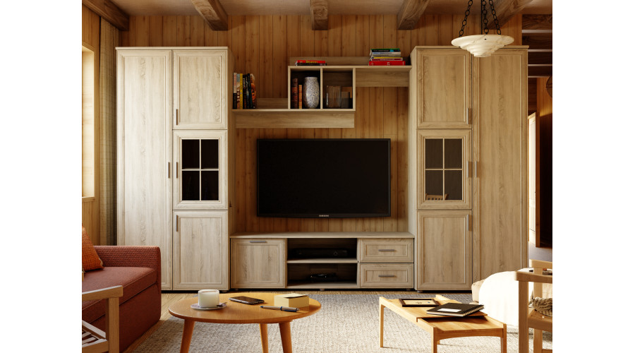 Centrinėje komplekto dalyje yra elektronikos zona. Multimedijos bloke yra atvira erdvė televizoriui ir nišos elektronikai bei priedams, leidžiančios estetiškai sutvarkyti prietaisus. Prie sienos tvirtinama viršutinė lentyna užbaigia vaizdą, puikiai tinkanti knygoms ar dekoratyviniams daiktams.