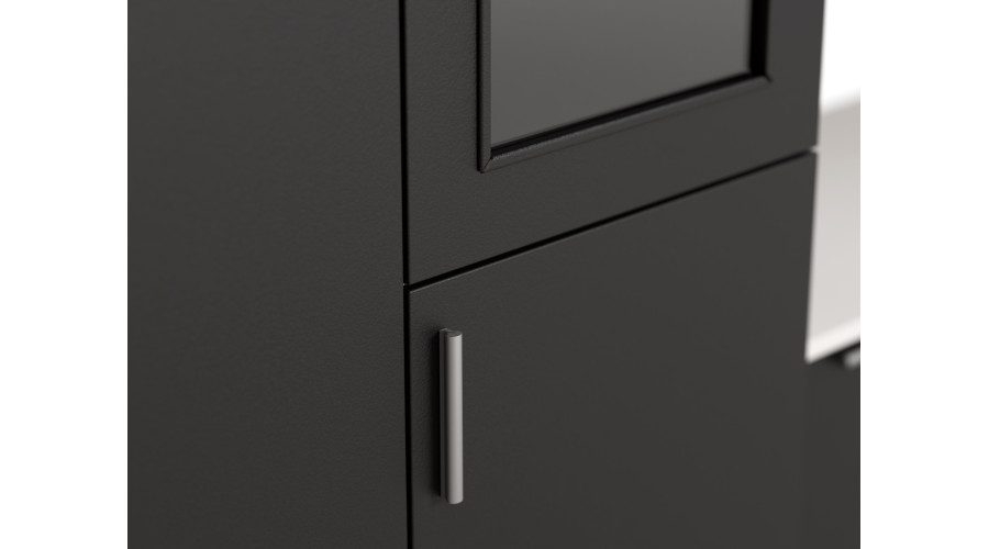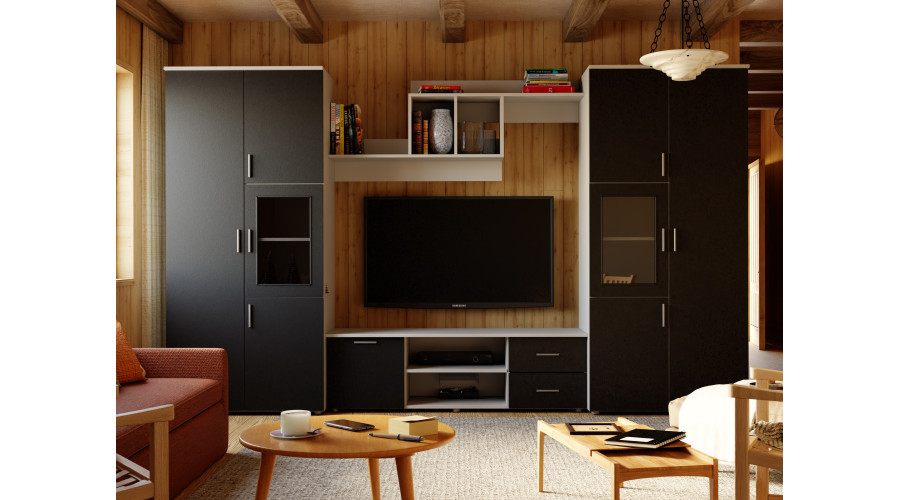 Šviesiai pilka spalvų gama su juodais fasadais suteikia sieninei spintelei modernų ir išskirtinį charakterį. Šviesus pagrindas praskaidrina interjerą, o juodi akcentai sutvarko struktūrą ir pabrėžia jos formą, todėl komplektas puikiai dera prie šiuolaikinio, minimalistinio interjero.