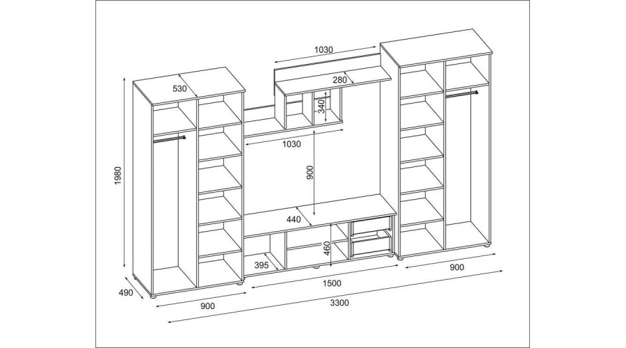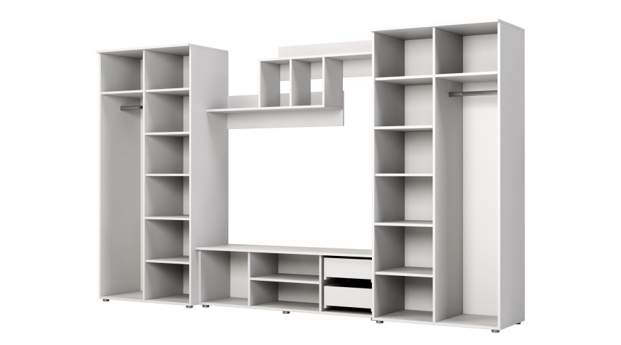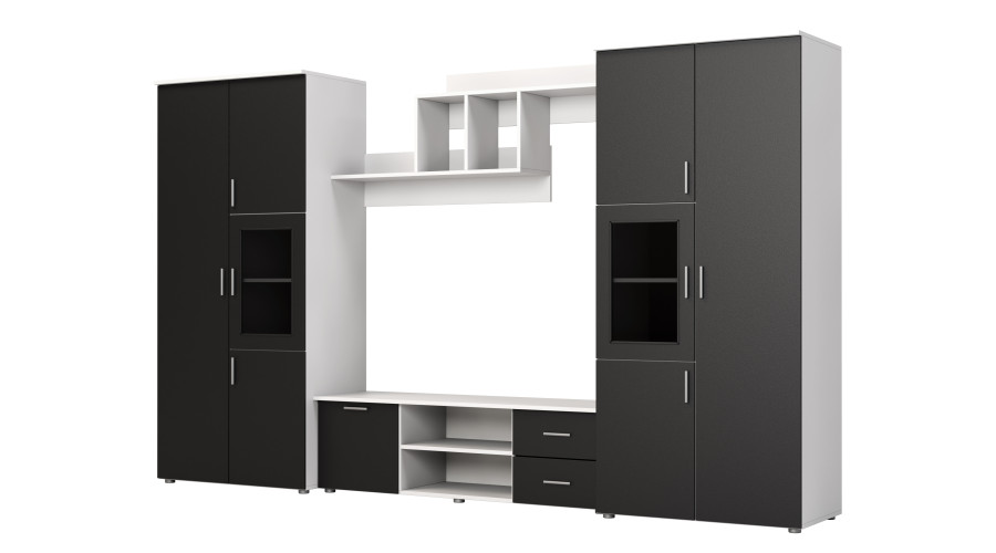 330 x 200 cm dydžio JOWISZ komplektas yra praktiškas sprendimas interjerui, kuriame būtina suderinti drabužių laikymą su funkcionalia multimedijos zona. Sieninės spintelės išdėstymas leidžia organizuoti gyvenamąją erdvę vienoje, darnioje sieninėje spintelėje.