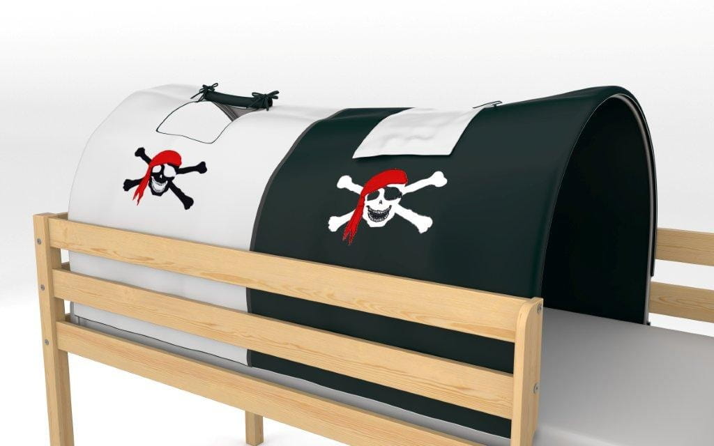 The large, black and white Pirate Tunnel is a perfect toy for children. It’s versatile, protecting the upper part of a bunk bed from light, for example. It can also serve as a great base or hiding place for children’s play. Especially since the tunnel features decorative pirate motifs, it will transport your child to the world of fairy tales in a flash. The tunnel has two windows on the roof that can be closed at any time. It’s made of cotton. The toy is also available in a slightly smaller version. It also fits the Pirate Tower and the curtain for the lower bunk. Color: white/black