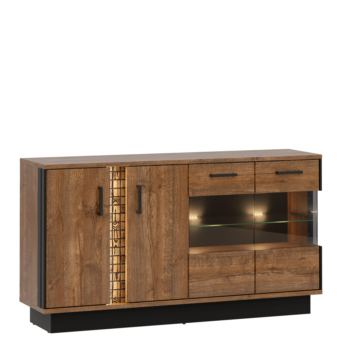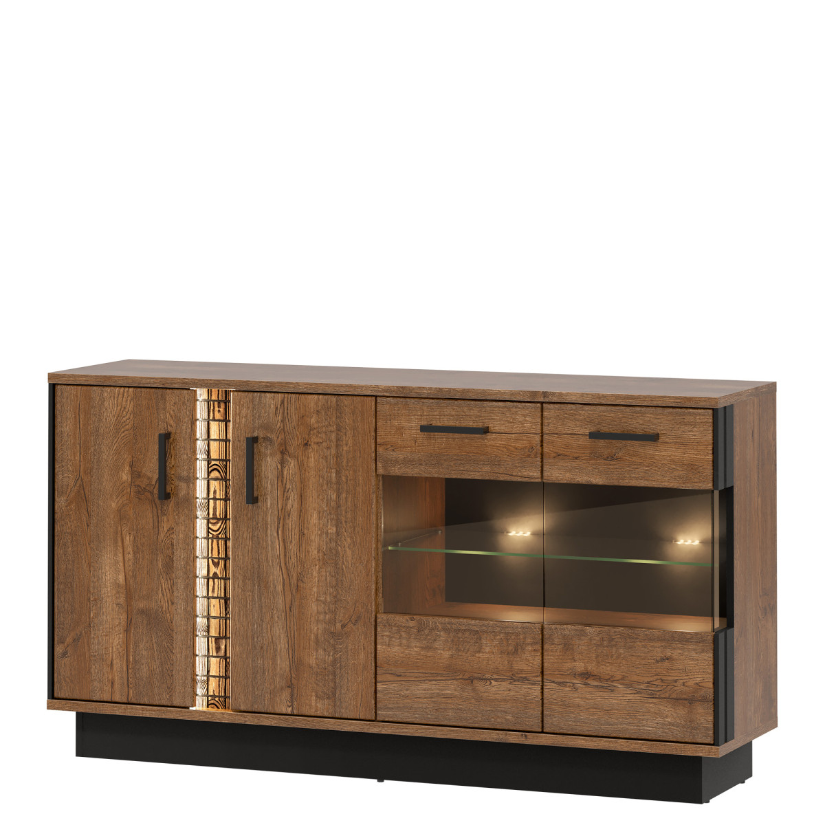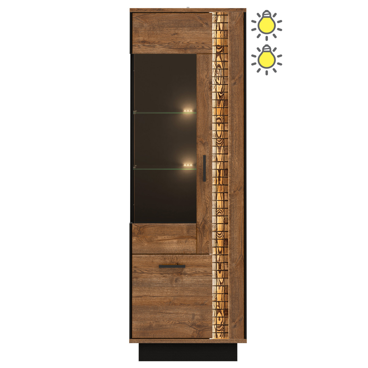DORIAN DN04 indauja puikiai tinka kaip funkcionalus ir eksponuojamas elementas svetainėje, svetainėje ar valgomajame. Viduje yra šešios erdvios, rakinamos nišos, kuriose yra daug vietos daiktams susidėti. Už iš dalies įstiklintų fasadų yra stiklinė lentyna, kurią galima dar labiau paryškinti LED apšvietimu. Šis sprendimas palengvina dekoracijų ir aksesuarų, taip pat šventinių stalo įrankių eksponavimą. „April Oak“ spalvų gamą papildo juodos spalvos akcentai, pabrėžiantys bendrą indaujai būdingą stilių. Natūralaus medžio juostelė su LED apšvietimu suteikia dar daugiau žavesio. Šiltos indaujai būdingos spalvos ir minimalistinė forma sukurs patrauklų, modernų interjerą ir jaukią atmosferą. Indauja idealiai tinka derinti su kitais DORIAN serijos baldais arba naudoti kaip atskiras baldas, leidžiantis pritaikyti ją prie savo kambario interjero.