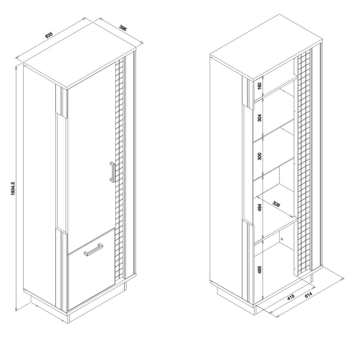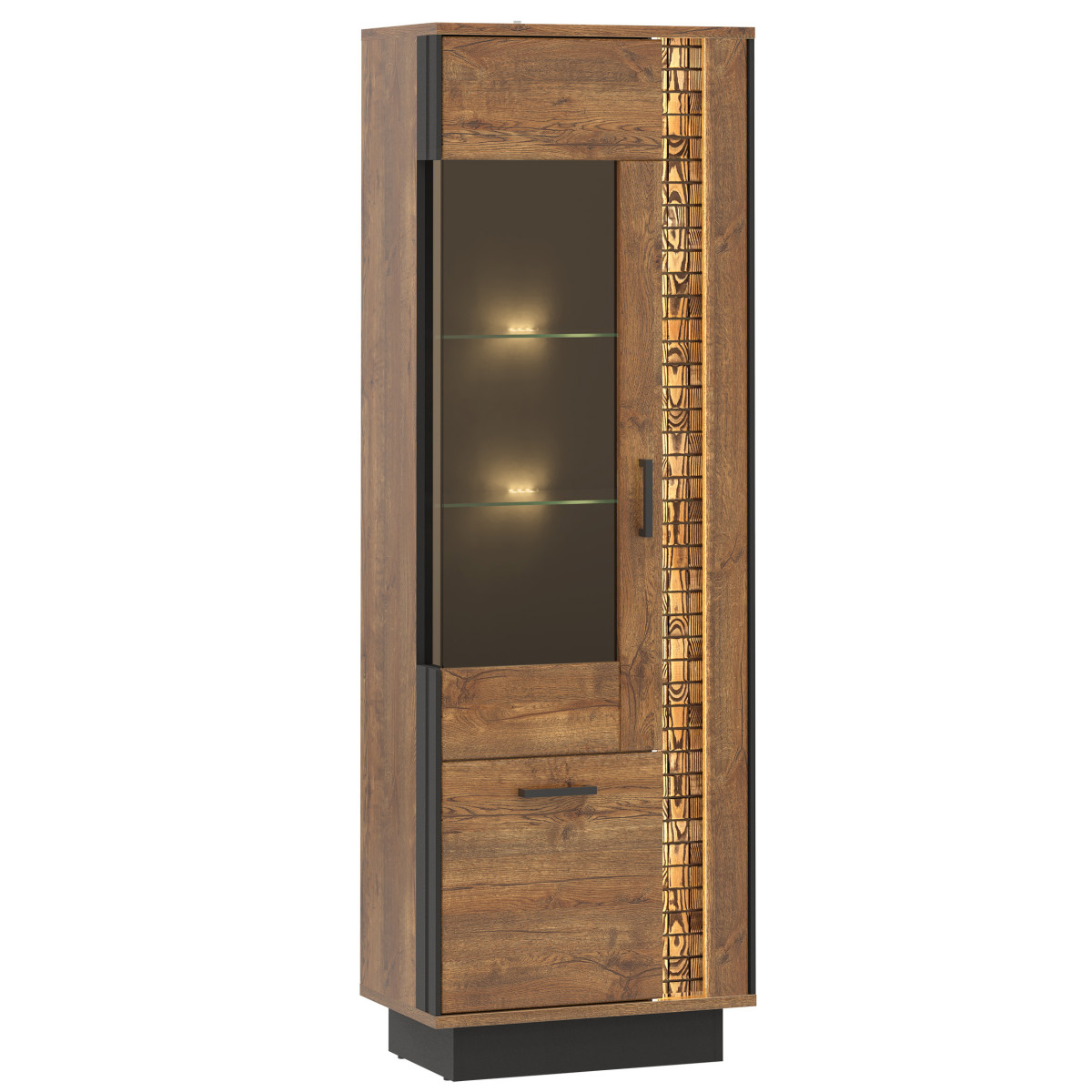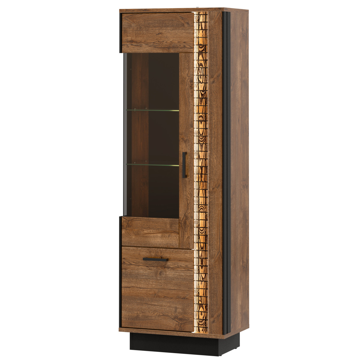 Kairinė vitrina DORIAN DN06 puikiai tinka svetainei arba darbo kambariui. Tai baldas, kuris suteiks jūsų svetainei elegancijos ir stiliaus. Joje įrengtos penkios praktiškos nišos daiktams susidėti. Pagrindinis spintelės bruožas – stiklinės lentynos, esančios už stiklinio fasado. Stiklas leidžia eksponuoti dekoratyvinius daiktus, o galimybė įsigyti LED apšvietimą suteiks jiems elegantišką išvaizdą. Apatinėje spintelės dalyje yra vietos kitiems daiktams. „April Oak“ spalvų gamą skaido juodos spalvos akcentai, pabrėžiantys bendrą spintelės dizainą. Natūralaus medžio juostelė su LED apšvietimu suteikia papildomo žavesio. Šiltos spintelės spalvos ir minimalistinė forma sukurs įdomų, modernų interjerą ir jaukią atmosferą. Spintelė idealiai tinka derinti su kitais DORIAN serijos baldais arba naudoti kaip atskiras baldas, leidžiantis pritaikyti ją prie savo kambario interjero.