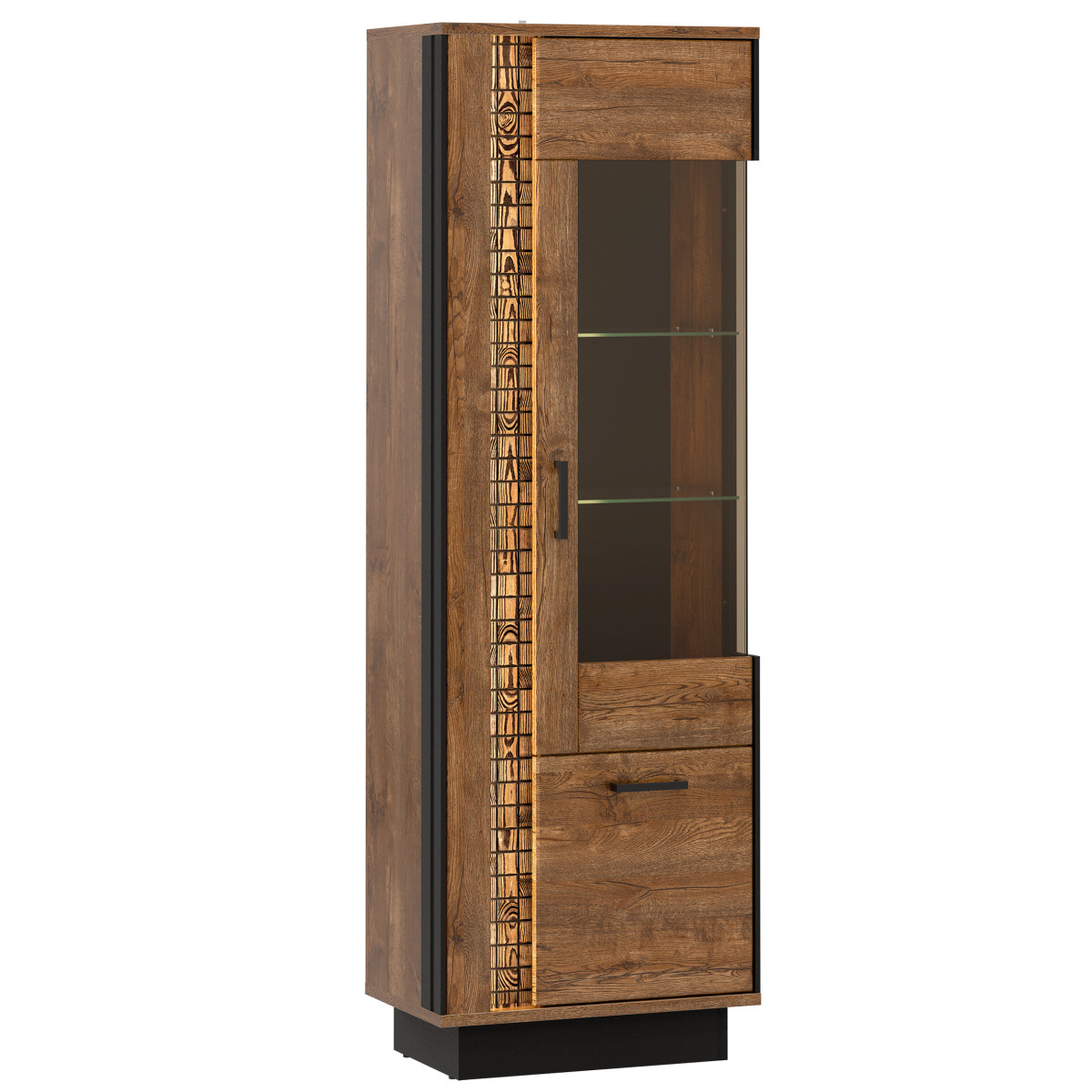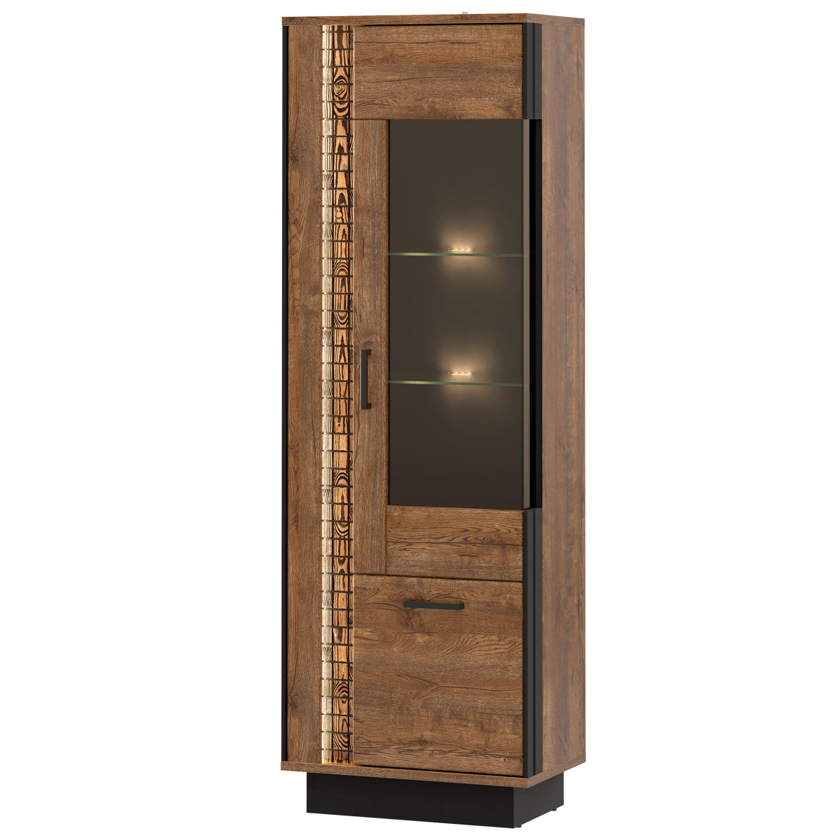 Dešinės pusės vitrina DORIAN DN07 puikiai tinka svetainei arba darbo kambariui. Šis baldas suteiks jūsų svetainei elegancijos ir stiliaus. Joje yra penkios praktiškos nišos daiktams susidėti. Pagrindinis spintelės bruožas – stiklinės lentynos už stiklinio priekio. Stiklas leidžia eksponuoti dekoratyvinius daiktus, o galimybė įsigyti LED apšvietimą sustiprins jūsų dekoro eleganciją. Apatinėje spintelės dalyje yra vietos kitiems daiktams. „April Oak“ spalvų gamą papildo juodos spalvos akcentai, pabrėžiantys bendrą spintelės dizainą. Natūralaus medžio juostelė su LED apšvietimu suteikia dar daugiau žavesio. Šiltos spintelės spalvos ir minimalistinė forma sukurs patrauklų, modernų interjerą ir jaukią atmosferą. Spintelė idealiai tinka derinti su kitais DORIAN serijos baldais arba naudoti kaip atskiras vienetas, leidžiantis pritaikyti ją prie savo kambario interjero.