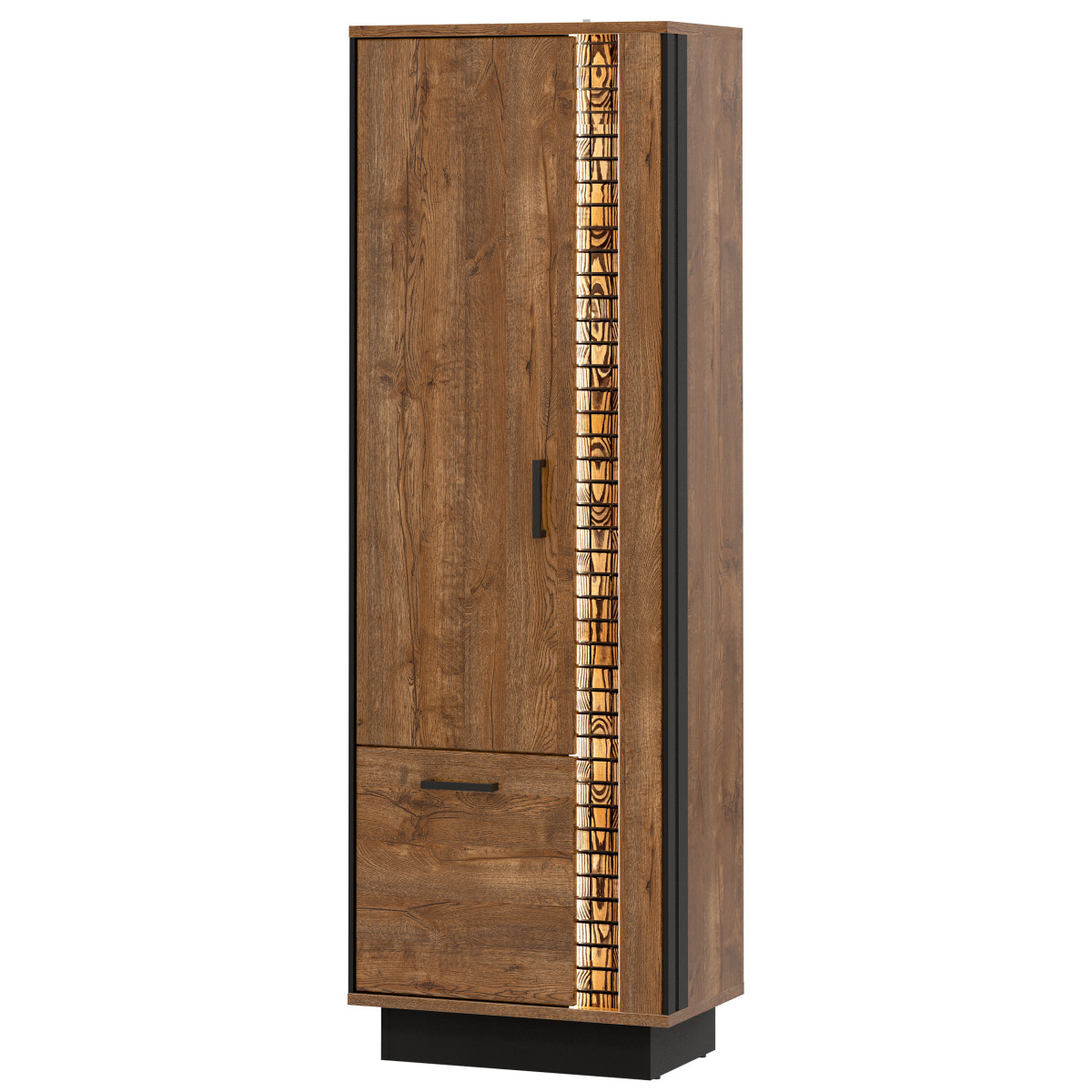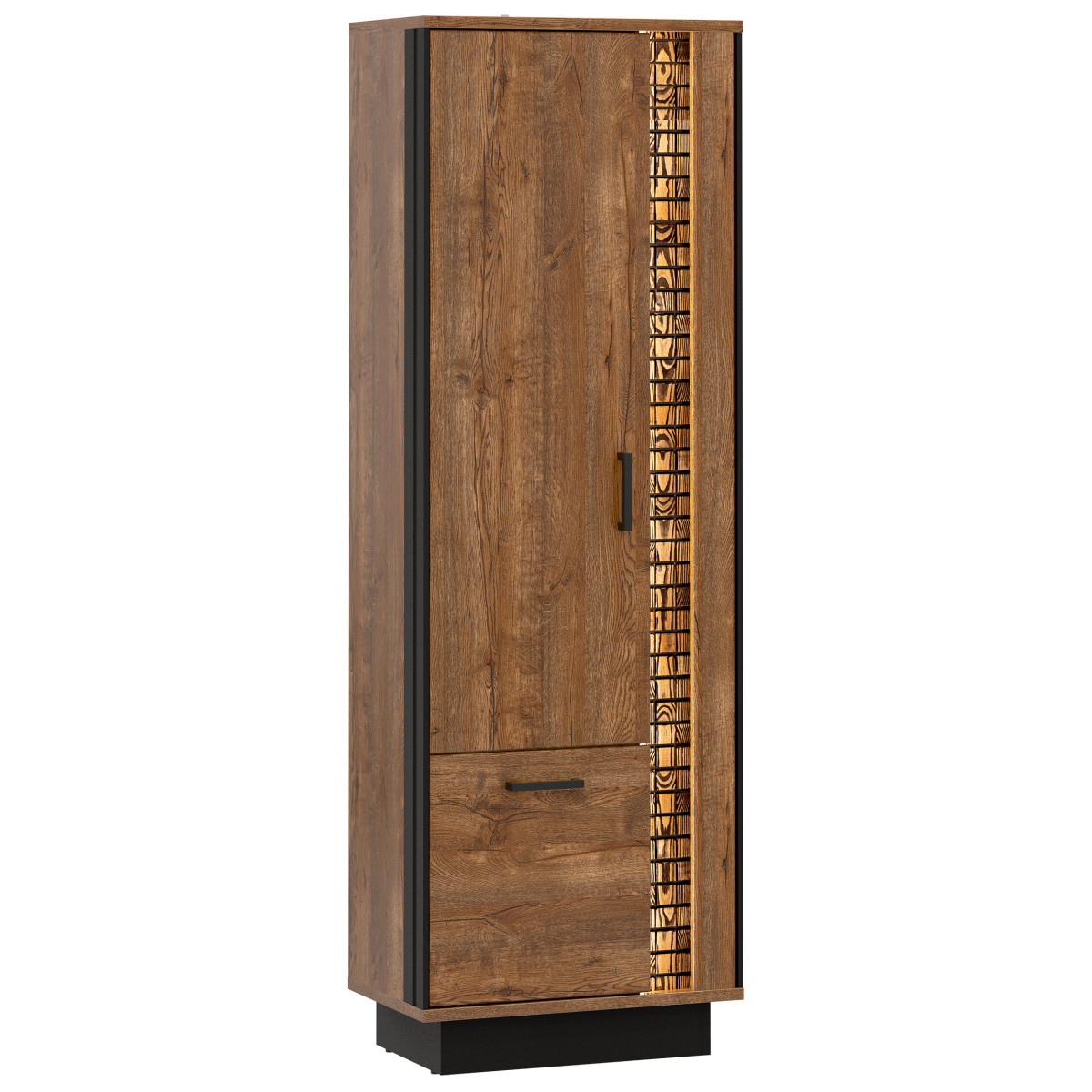 DORIAN DN08 L/R komoda – tai baldas, puikiai tinkantis svetainėms ir darbo erdvėms. Ji pasižymi standartiniu išplanavimu su penkiais erdviais skyriais. Ji puikiai tinka tvarkingai susidėti ir susitvarkyti būtiniausius daiktus bei drabužius. Komoda yra universali, ją galima atidaryti iš kairės arba dešinės. ’April Oak“ spalvų gamą papildo juodos spalvos akcentai, pabrėžiantys bendrą spintelės stilių. Natūralaus medžio juostelė su LED apšvietimu suteikia papildomo žavesio. Šiltos komodos spalvos ir minimalistinis dizainas sukurs patrauklų, modernų interjerą ir jaukią atmosferą. Komoda idealiai dera su kitais DORIAN serijos baldais arba yra atskiras baldas, leidžiantis ją pritaikyti prie savo kambario interjero.