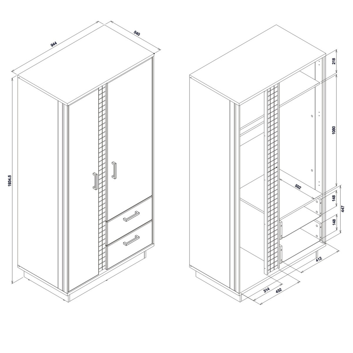 Plotis 94,5 cm Gylis 54 cm Aukštis 192 cm Produkto svoris su pakuote 87,90 kg Gamintojo kodas / simbolis DN09 Kolekcijos pavadinimas DORIAN Pavadinimas b2b sistemoje DORIAN DN-9 balandžio ąžuolo/juodos spalvos SPINTELĖ 2D komplektas Produkto pakuočių skaičius 3 Stilius Modernus Įranga Surinkimo instrukcijos / surinkimo priedai Surinkimas Savarankiškam surinkimui Korpuso spalva April Oak / Juoda Korpuso medžiaga / tipas / storis 16 mm baldų plokštė / Juostelė 16 mm MDF baldų plokštė Viršutinio korpuso medžiaga / tipas / storis 22 mm baldų plokštė Apatinio korpuso medžiaga / tipas / storis 22 mm baldų plokštė Pagrindo korpuso medžiaga / tipas / storis 16 mm baldų plokštė Lentynos spalva April Oak Lentynos medžiaga / tipas / storis 16 mm baldų plokštė Karūnėlės tipo lentynų kiekis 1 Galinės sienelės medžiaga / tipas / storis 2,5 mm Baldų plokštė Galinės sienelės spalva Juoda Priekinės spalvos April Oak Priekinės medžiagos / tipas / storis 18 mm Baldų plokštė MDF Priekinis vyris ⌀ 35 mm, reguliuojamas trijose plokštumose Priekinė rankena / medžiaga / spalva Plastikas / juoda Apšvietimas Išorinis apšvietimas Standartiškai Išorinis Apšvietimo spalva Šiltai balta Išorinis apšvietimas Energijos klasė A++ Švelnaus uždarymo durų sistema Standartiškai Pilnai ištraukiamos stalčių bėgelės Kojelė / apdaila / spalva Nereguliuojama / Baldų bėgelis / plastikinė / juoda Durelių skaičius 2 Stalčių skaičius 2 Uždarų nišų skaičius 2 Korpuso įranga Standartiškai 1 pakabinimo karnizas