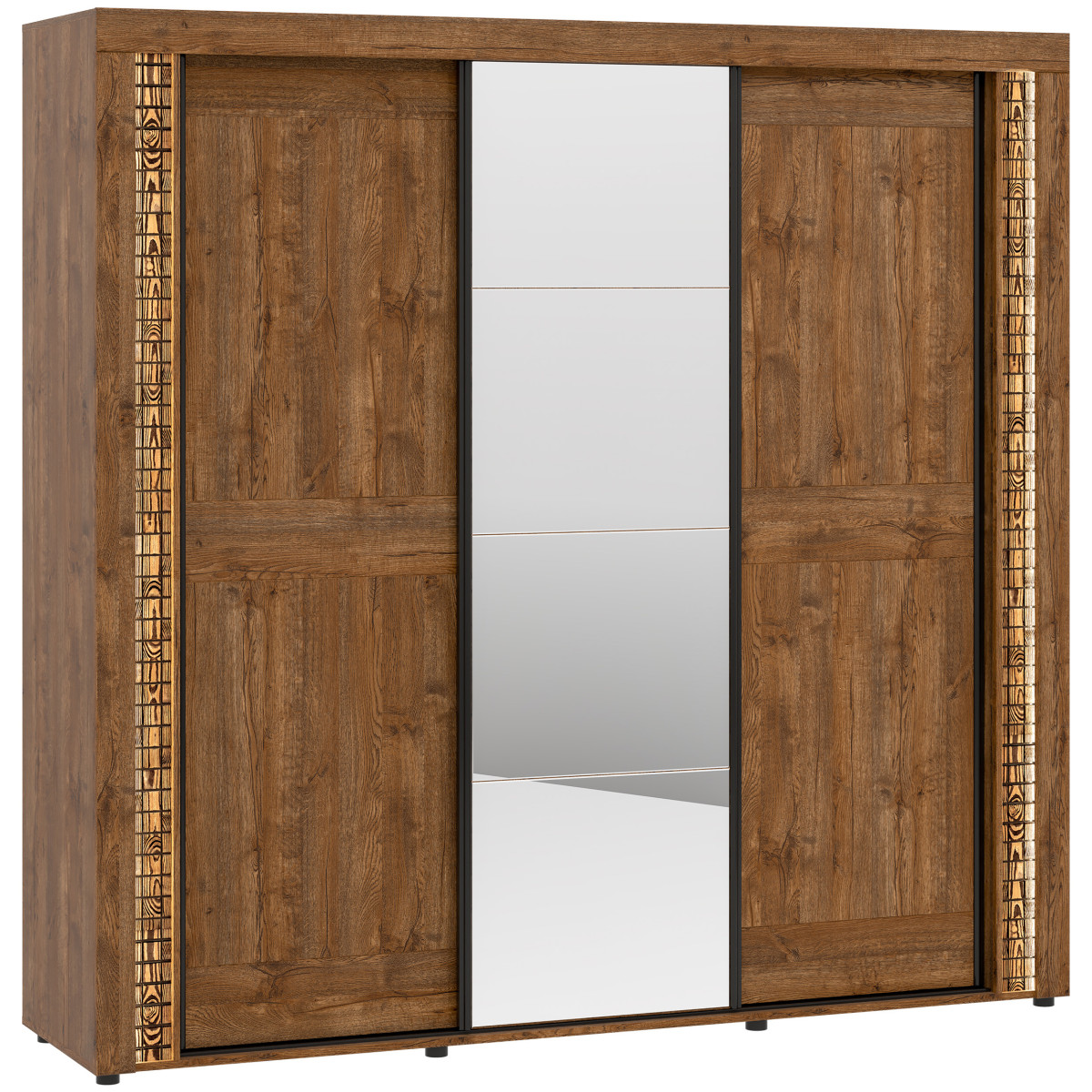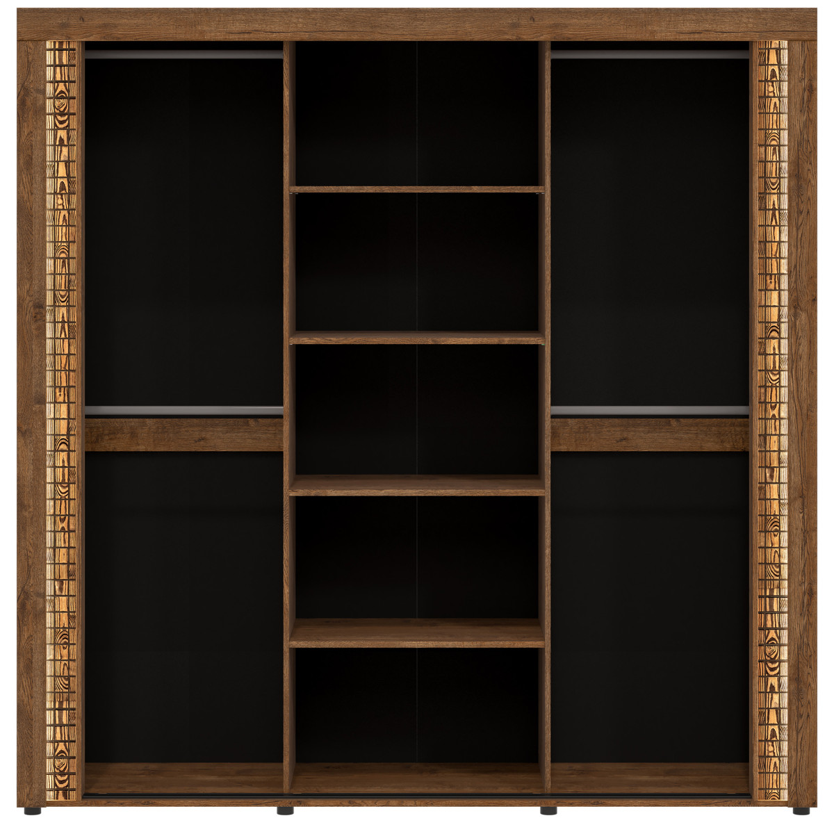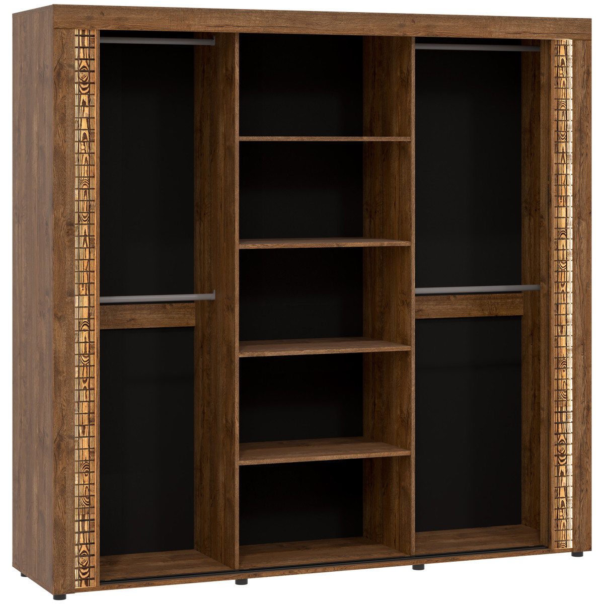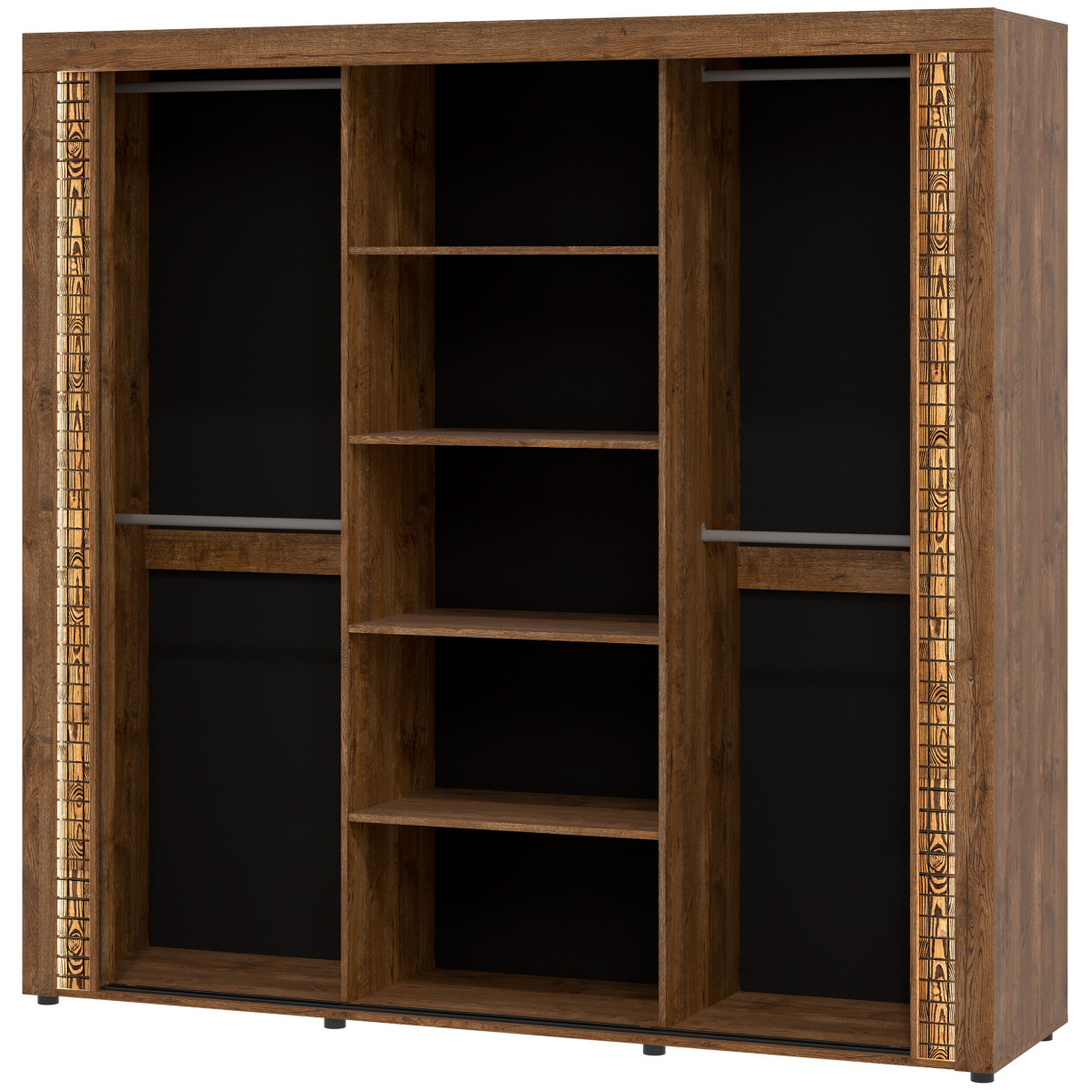Stumdoma spinta DORIAN DN13 – puikus sprendimas jūsų miegamajam arba kaip bendra rūbinė visiems šeimos nariams. Spinta turi stumdomų durų sistemą, kuri nevaržo erdvės. Patogios ir erdvios nišos tilps sulankstytuose drabužiuose, aksesuaruose ar batų dėžėse, o keturios pakabos sutvarkys likusią spintos dalį. Vidurinėse spintos duryse yra veidrodis, kuris vizualiai dar labiau padidins kambarį. „April Oak“ spalvų gamą papildo juodos spalvos akcentai, pabrėžiantys bendrą spintos stilių. Natūralaus medžio juostelė su LED apšvietimu suteikia papildomo žavesio. Šiltos spintos spalvos ir minimalistinė forma sukurs patrauklų, modernų interjerą ir jaukią atmosferą. Spinta idealiai tinka derinti su kitais DORIAN serijos baldais arba naudoti kaip atskiras baldas, leidžiantis ją pritaikyti prie savo kambario interjero.