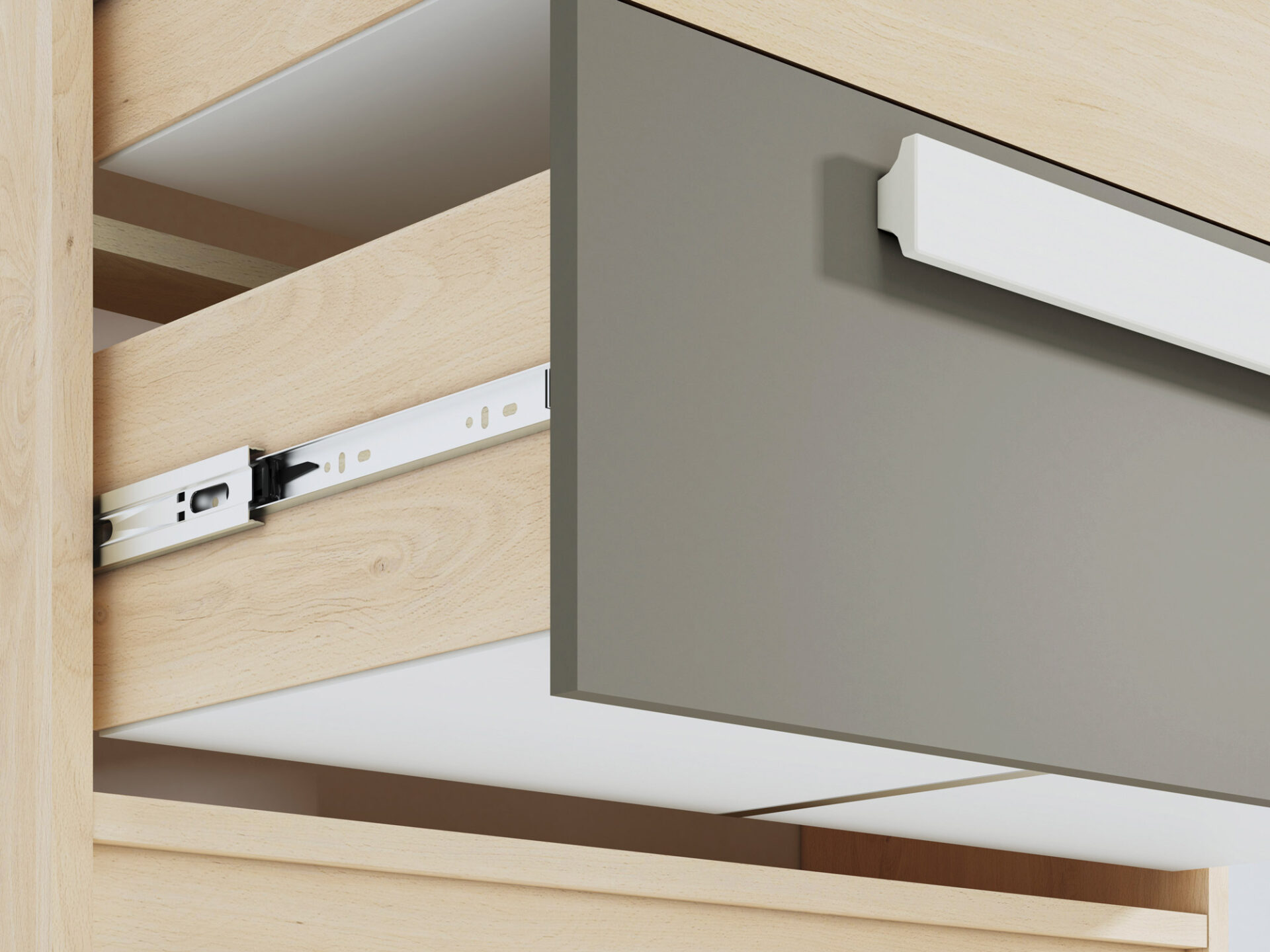 Kiekvienoje vaikiškoje sistemoje turi būti erdvi komoda, kurioje tilps visi mūsų mažylių lobiai – nuo drabužių iki visiškai netradicinių įvairių formų daiktų. Mūsų DROP 08 komodos stalčių sistema turi pilną ištraukimą ir papildomai sutvirtintą dugną, todėl net ir didelius daiktus bus lengva sudėti. Stalčių talpa ir atsparus įbrėžimams fiordo buko stalviršis yra tik keli mūsų dizaino privalumai. Be to, kiekviena komoda yra visiškai subalansuota ir pritaikyta vaikams.