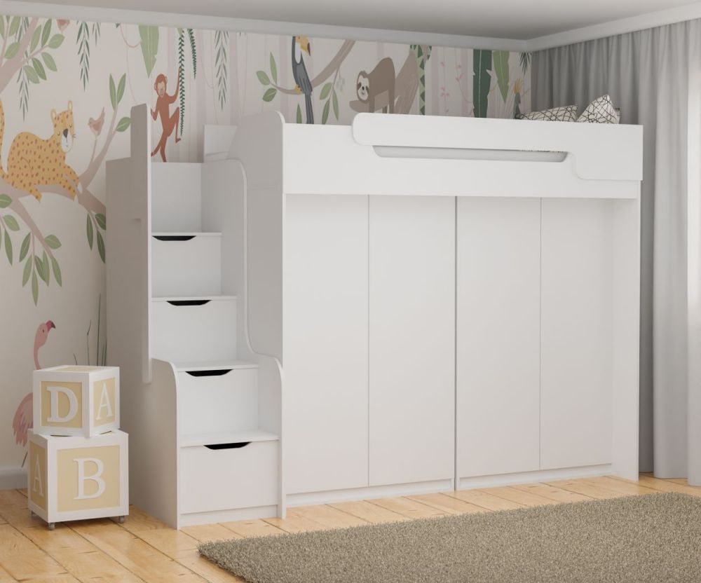 Sistema leidžia po lova pastatyti papildomus elementus: drabužių spintą, stalą arba dviaukštę lovą 90 × 200 cm čiužiniui – paieškos juostoje įveskite „Dorian“ (ši parinktis apima dvi spintas).