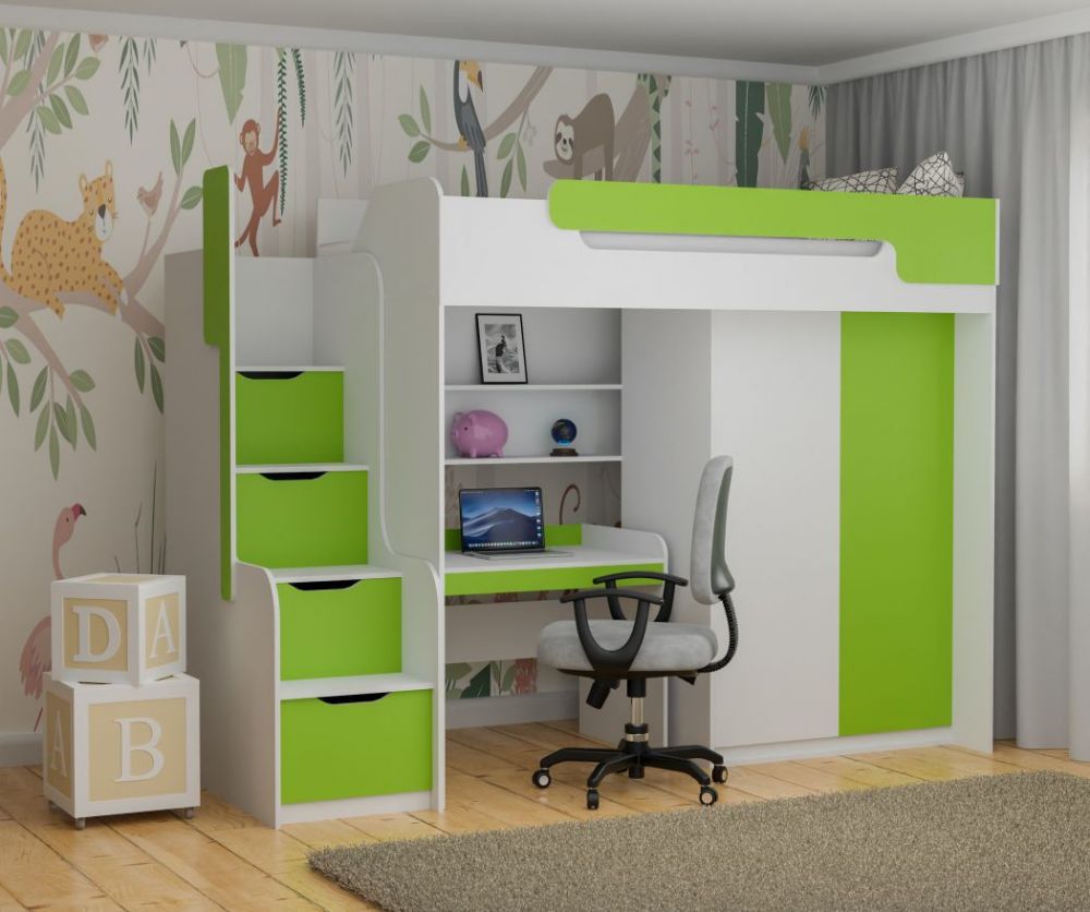 Sistema leidžia po lova pastatyti papildomus elementus: drabužių spintą, stalą arba dviaukštę lovą 90×200 cm čiužiniui – paieškos juostoje įveskite „Dorian“ (ši parinktis apima stalą + drabužių spintą + lentyną).