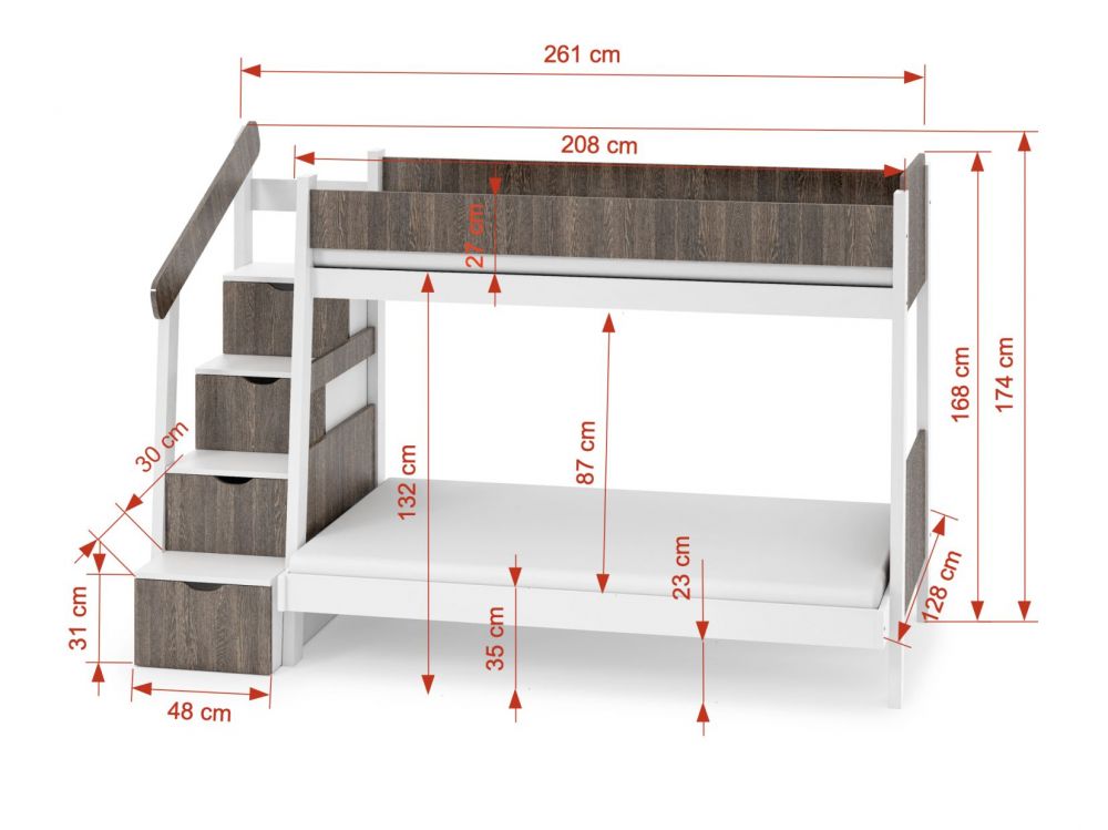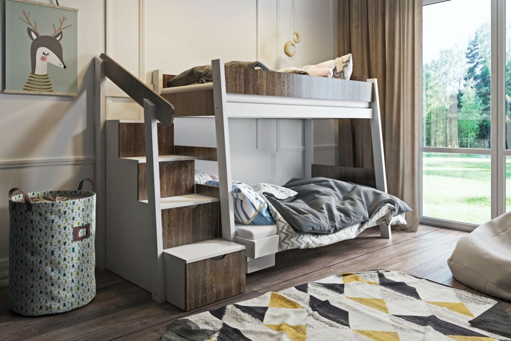 Dviaukštė lova su laiptais ir daiktadėžėmis PARYS 3 asmenims 90×200 cm