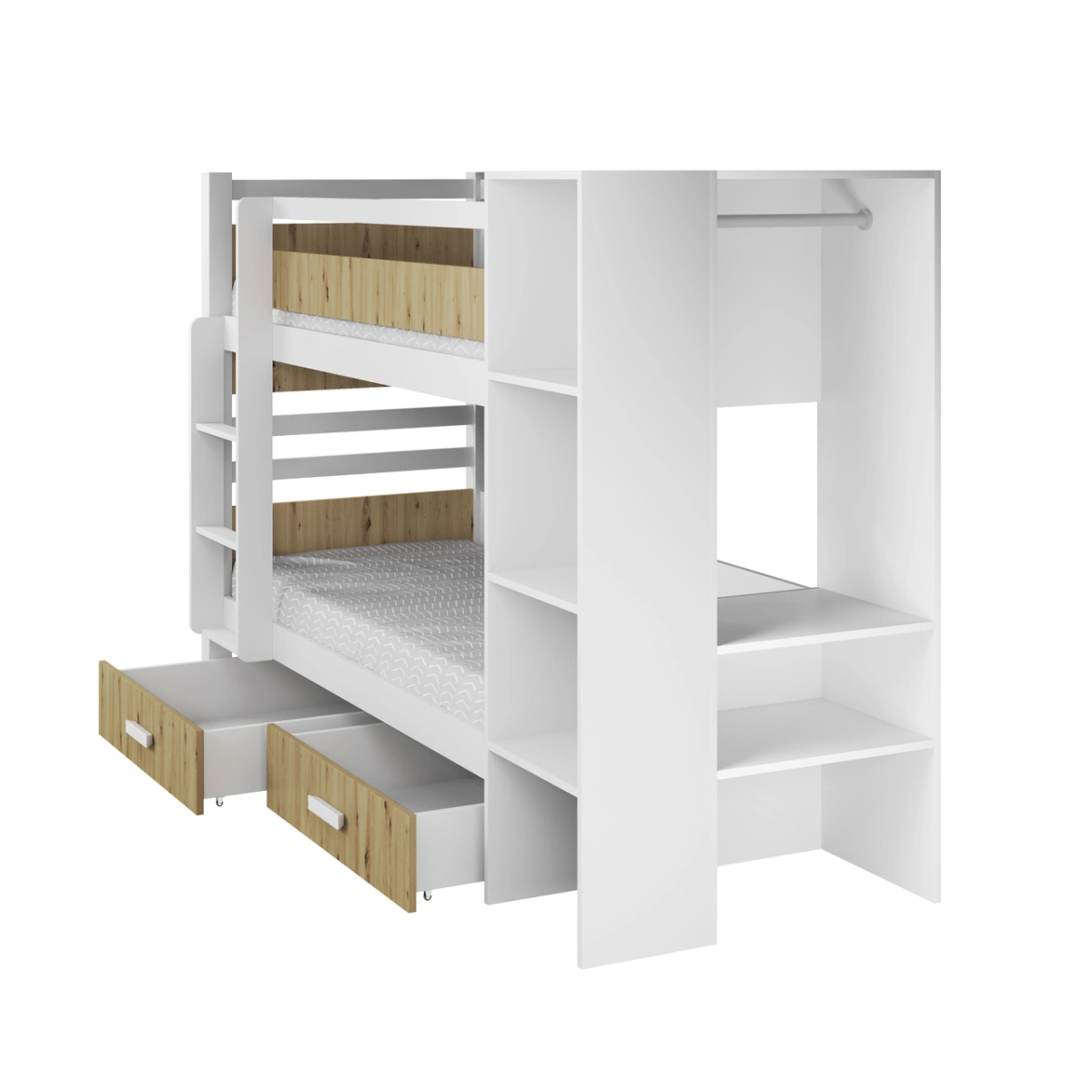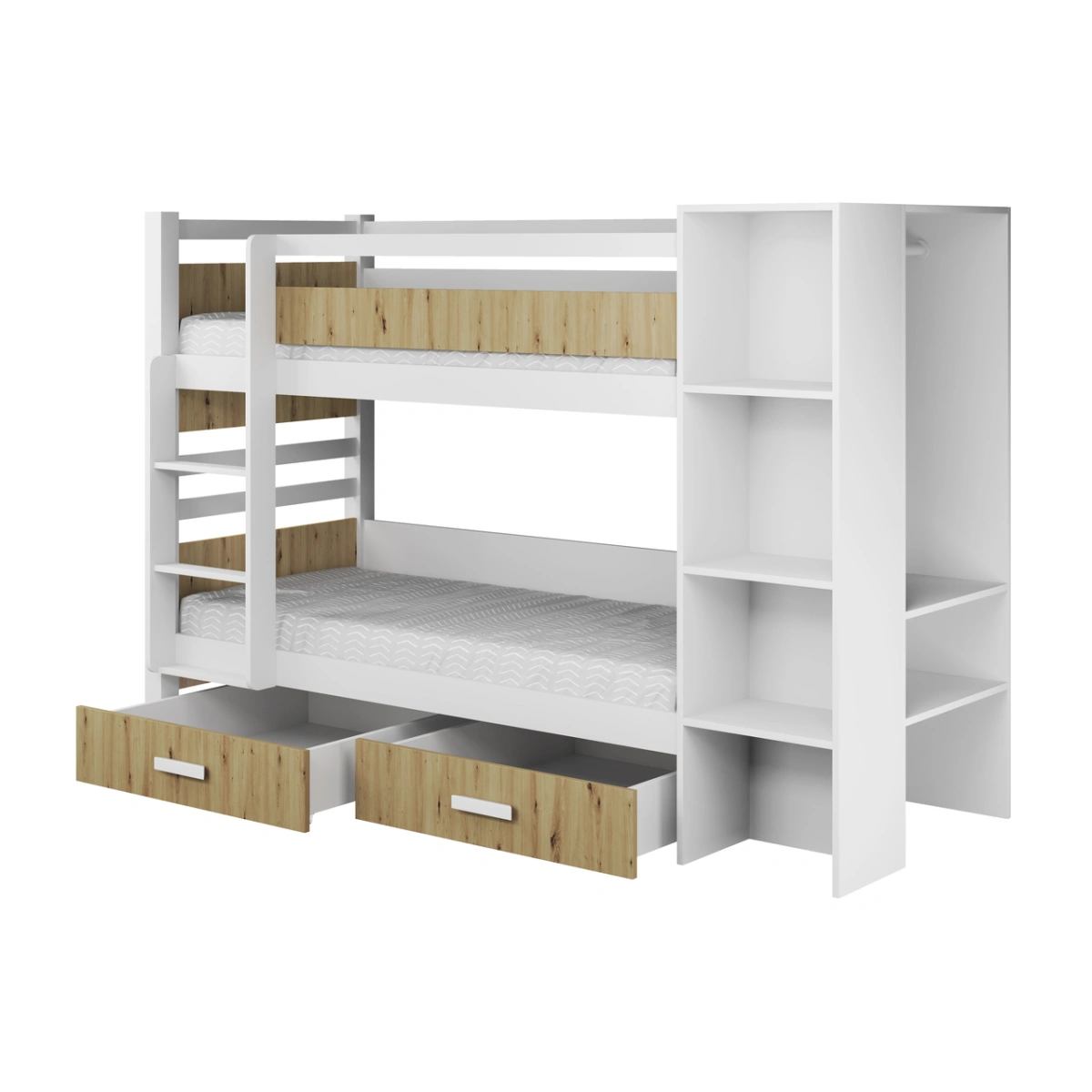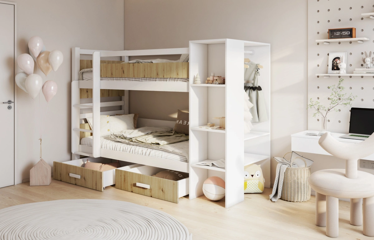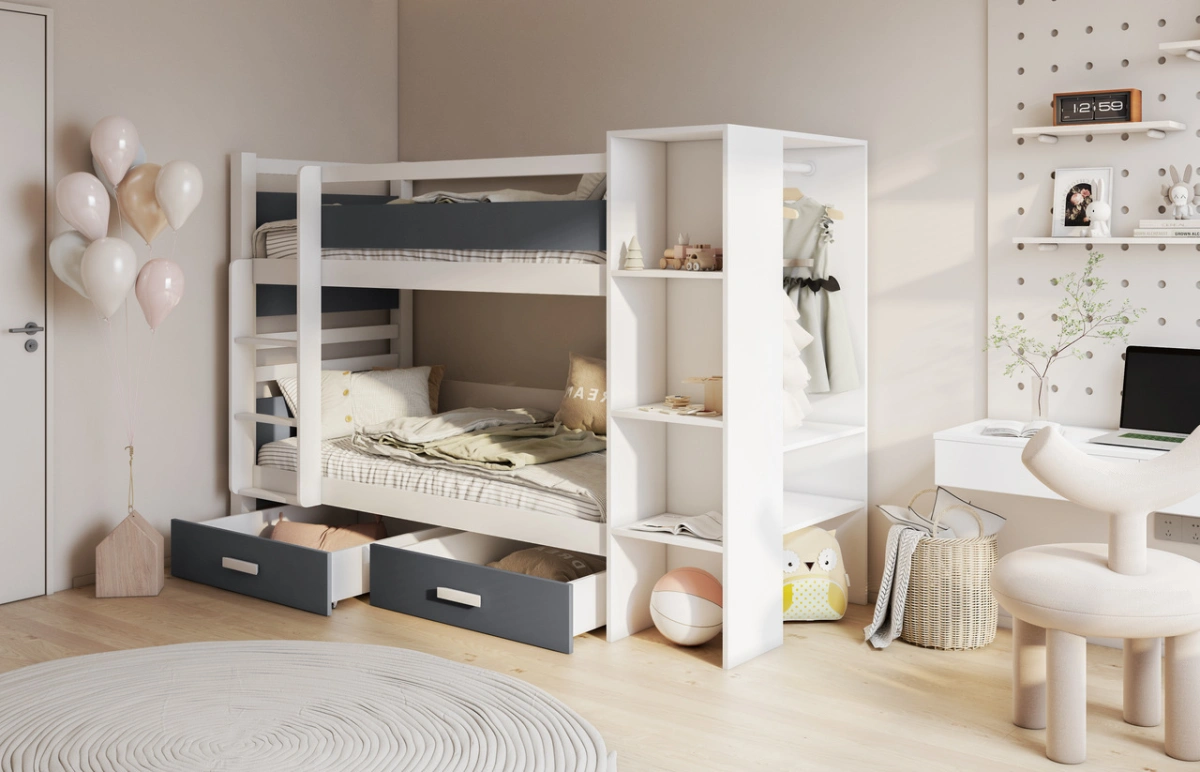 Dviaukštė lova su stalčiais ir lentyna APOLLO 2 asmenims 90×200 cm