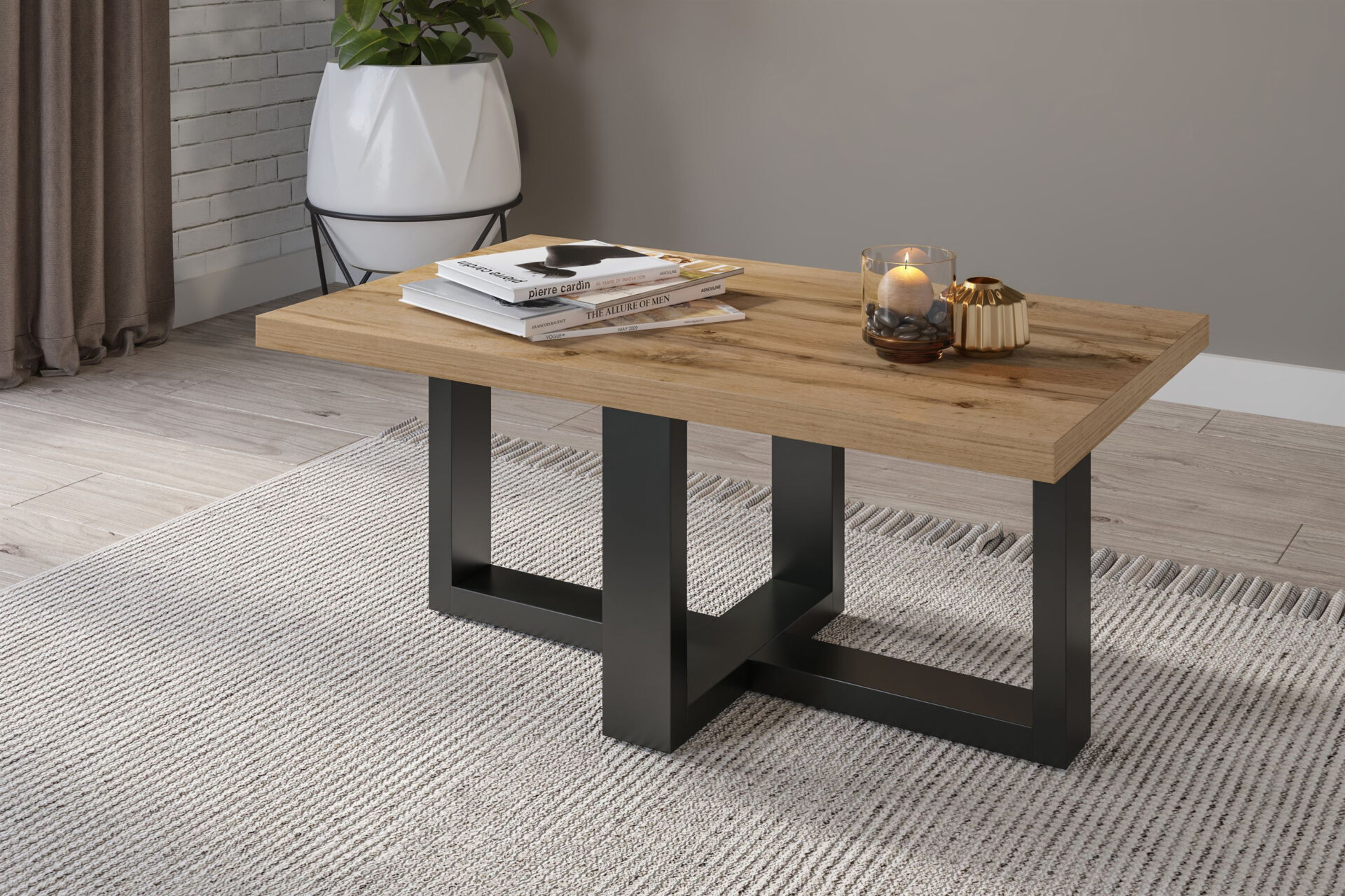 Stalviršis pagamintas iš šilto Wotan ąžuolo atspalvio laminuotos plokštės, suteikiančios jam natūralaus žavesio. Lygus, lengvai valomas paviršius – puikus sprendimas tiems, kurie vertina ir estetiką, ir praktiškumą. Stalo kojos, pagamintos iš tvirto metalo elegantiško juodo onikso spalvos, ne tik suteikia stabilumo, bet ir modernumo. Šis neapdoroto metalo ir šiltos medienos kontrastas yra tikra akių šventė. Stalo matmenys – 102 cm pločio, 44 cm aukščio ir 60 cm gylio – puikiai tinka tiek mažoms, tiek didelėms erdvėms. Ant jo lengvai telpa ne tik puodelis kavos, bet ir knygos, laikraščiai ir net dekoracijos. Dėl minimalistinio dizaino jis lengvai derės prie jūsų dabartinio interjero dizaino, o universalumas užtikrina, kad jis tarnaus ilgus metus, nepaisant mados ar spalvų gamos pokyčių.
