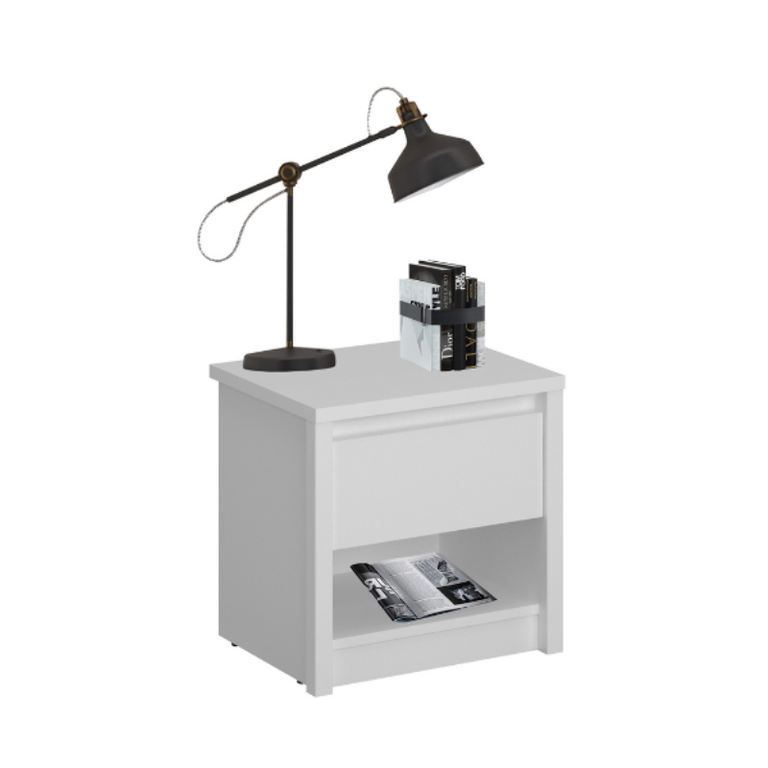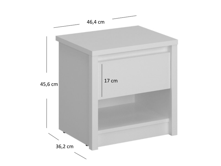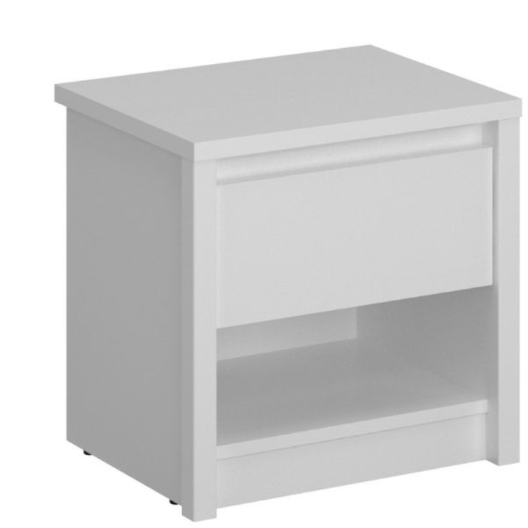 Kolekcija: Erden Surinkti baldai: Ne Plotis: 46,4 Aukštis: 45,6 Gylis: 36,2 Stalčių skaičius: 1 EREDEN Naktinis staliukas, 1 vnt., baltas