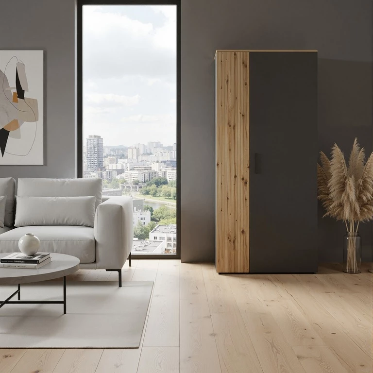 Stilinga ir funkcionali grafito / „Evok Oak“ spalvos ESTEBAN spinta – puikus sprendimas tiems, kurie vertina modernų dizainą ir tvarkingus namus. Elegantiškos grafito ir šiltos ąžuolo spalvos derinys suteikia interjerui jaukumo ir modernumo.