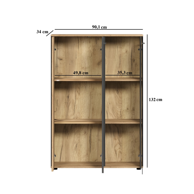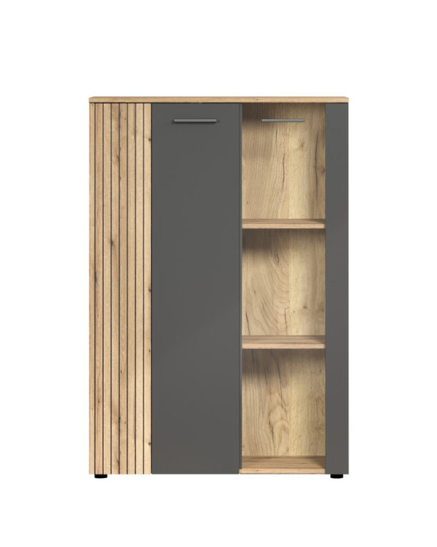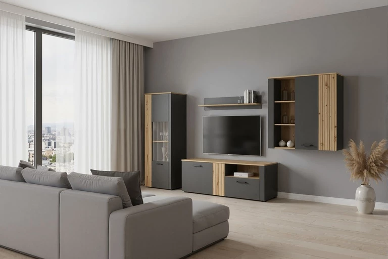 Žema grafito/evok ąžuolo spalvos vitrina ESTEBAN 2-D1W derina modernų eleganciją ir funkcionalumą, puikiai papildydama svetainės, valgomojo ar darbo kambario interjerą. Tamsaus grafito ir šilto evok ąžuolo atspalvio kontrastas sukuria harmoningą kompoziciją, suteikiančią interjerui jaukumo ir stilingumo.