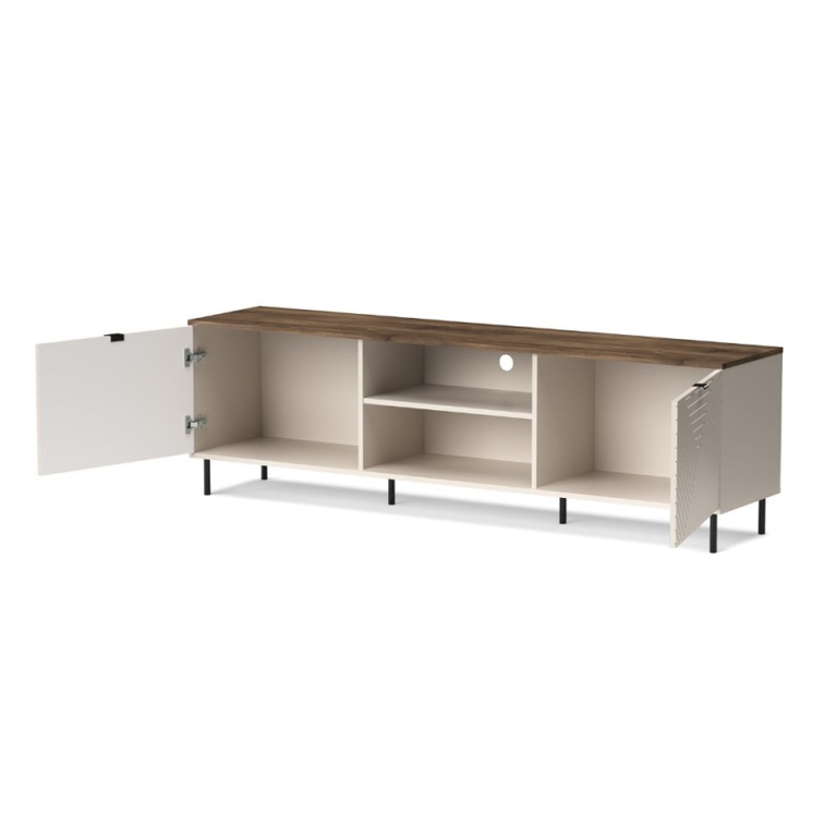 Aukštos metalinės kojelės ne tik suteikia stovui lengvumo pojūtį, bet, svarbiausia, leidžia lengvai pasiekti robotą dulkių siurblį, užtikrinant, kad jūsų namai būtų švarūs. Atvira lentyna ir dvi uždaros ertmės su dekoratyviniu, grioveliuotu kašmyro priekiu suteikia daug vietos garso ir vaizdo įrangai, žaidimų konsolėms, knygoms ir dekoracijoms. Tokiu būdu viskas, ko jums reikia, visada bus ranka pasiekiama.