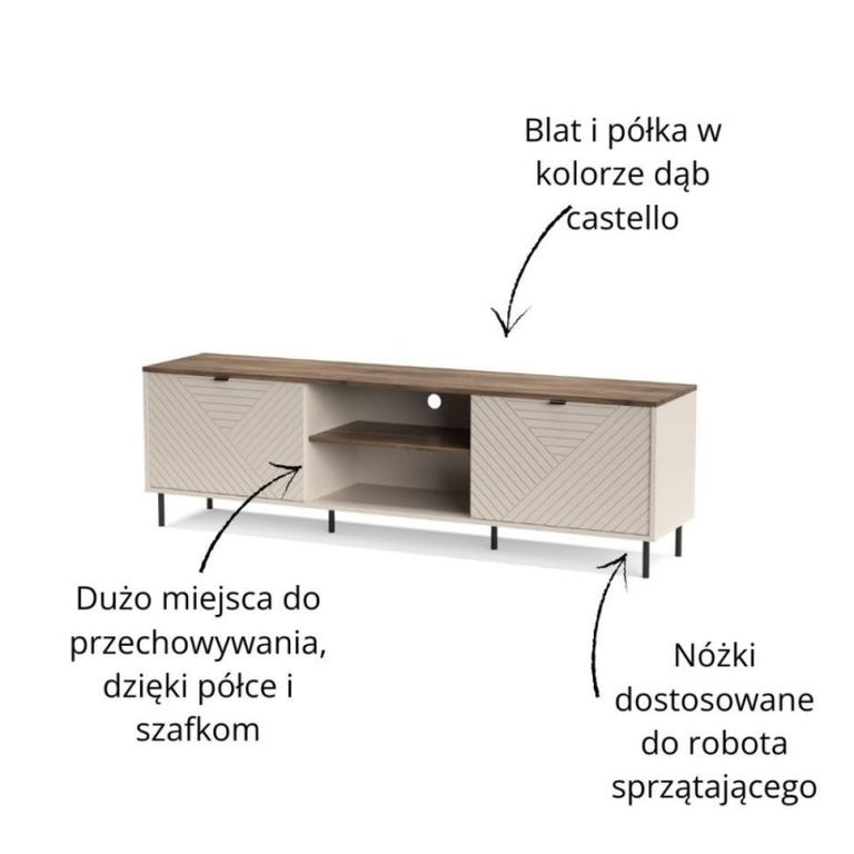 Šis televizoriaus staliukas – ne šiaip baldas, tai jūsų svetainės širdis. Šis EVO kolekcijos televizoriaus staliukas pasižymi moderniu dizainu, įkvėptu naujausių interjero dizaino tendencijų, suteikiančiu kambariui unikalų charakterį. Šilto kašmyro atspalvio ir elegantiško „Castello“ ąžuolo stalviršio derinys sukuria harmoningą kompoziciją, kuri puikiai dera su įvairiais stiliais.