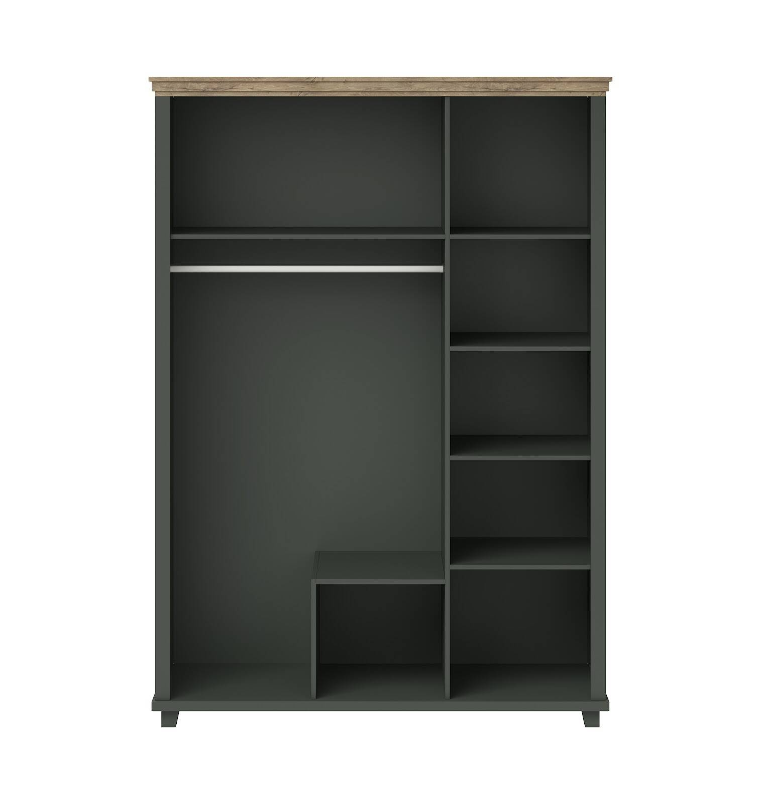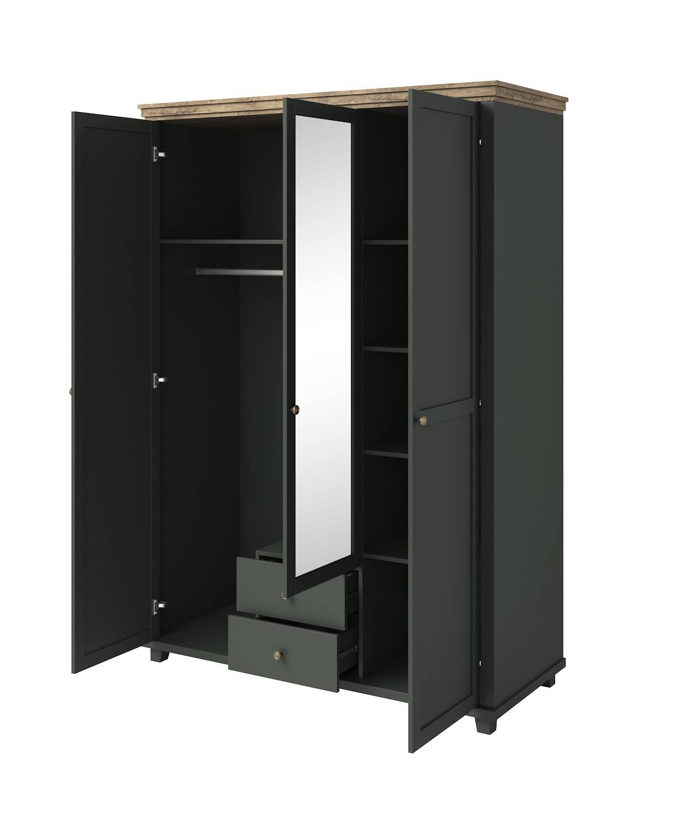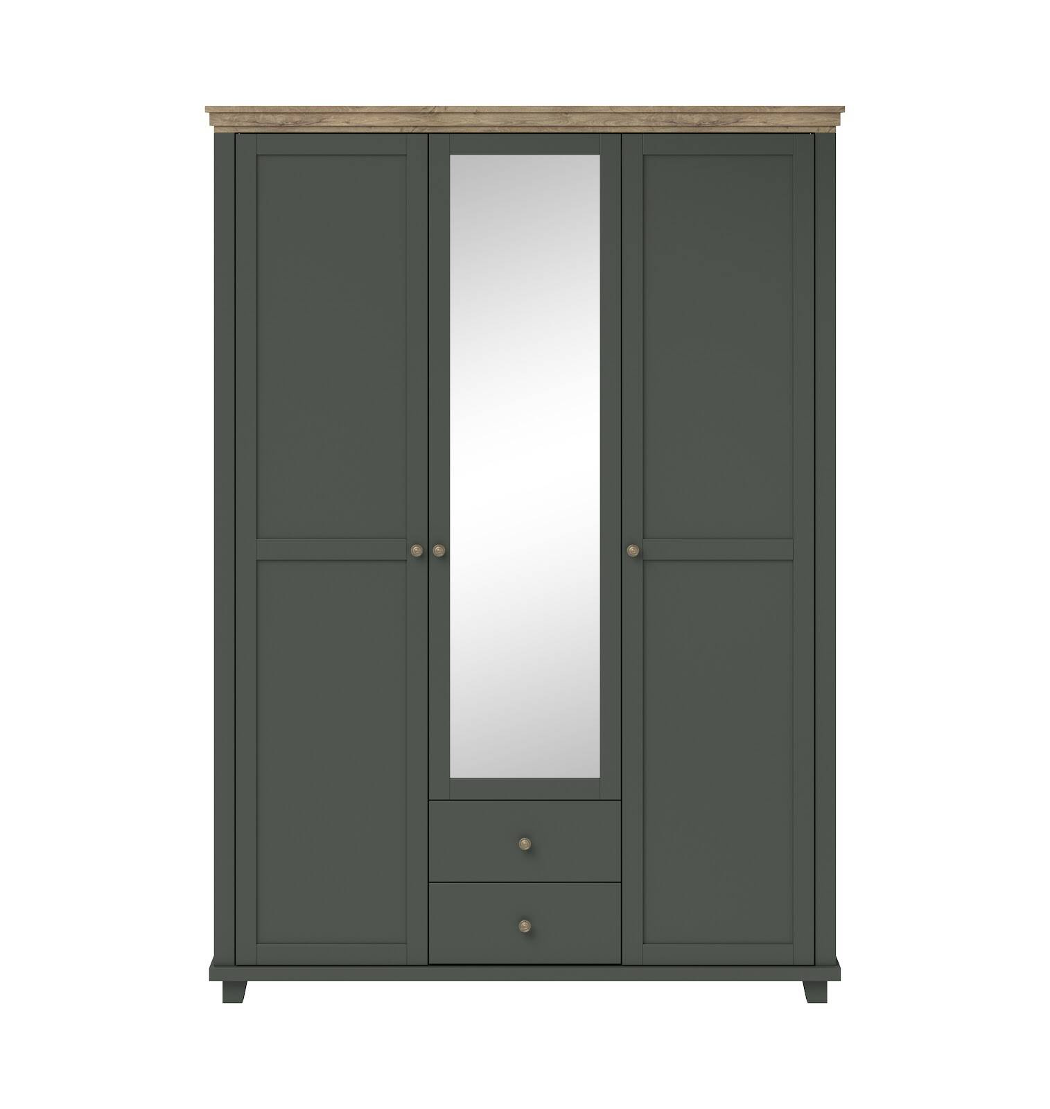 „Evora S 3D2S“ spinta su veidrodžiu žalios/Lefkas ąžuolo spalvos – elegantiškas ir funkcionalus garsaus „Helvetia“ prekės ženklo pasirinkimas, puikiai tinkantis miegamiesiems ir erdvioms drabužinėms. Sukurta tiems, kurie vertina modernų dizainą ir maksimalų praktiškumą, žalios spalvos ir Lefkas ąžuolo atspalvio derinys suteikia spintai unikalų, stilingą charakterį, todėl ji taps jūsų interjero traukos centru. Pagaminta iš aukštos kokybės laminuotos baldinės plokštės, spinta yra ne tik patvari, bet ir lengvai valoma. Gerai apgalvotas dizainas siūlo įspūdingą daiktų laikymo erdvę. Spinta turi tris erdvias duris ir du stalčius, leidžiančius tvarkingai susidėti tiek drabužius, tiek kitus daiktus. Penkios lentynos viduje leidžia patogiai susitvarkyti drabužius, o karnizas puikiai tinka pakabinti marškinius ar sukneles. Papildomas privalumas – viso ūgio veidrodis, kuris ne tik vizualiai padidina erdvę, bet ir yra praktiškas kasdienio naudojimo priedas.