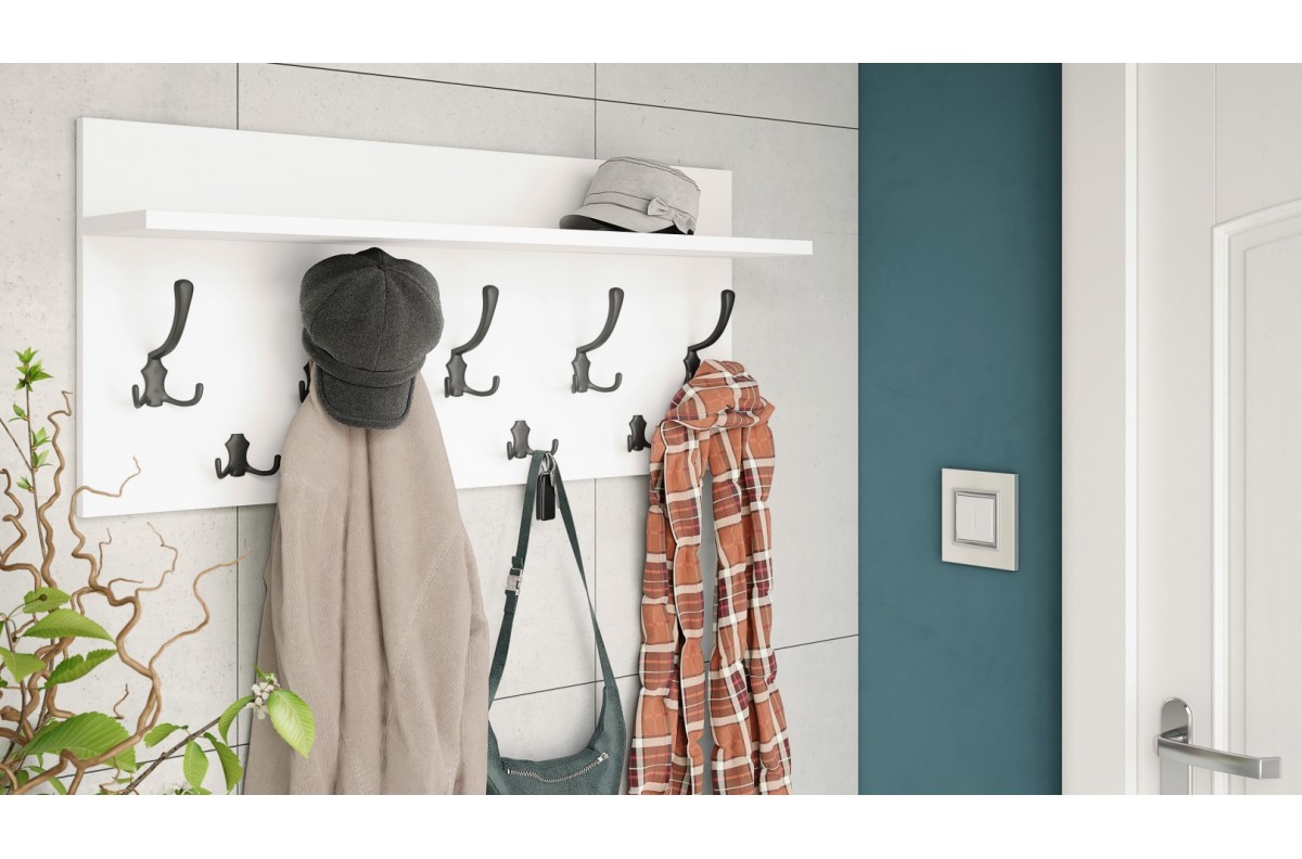 FINLO matinės baltos/matinės juodos rankenėlės – MODERNUS SIENINIS PAKABINIMAS SU LENTYNA PRIEŠKORIUI 90 ir 70 cm