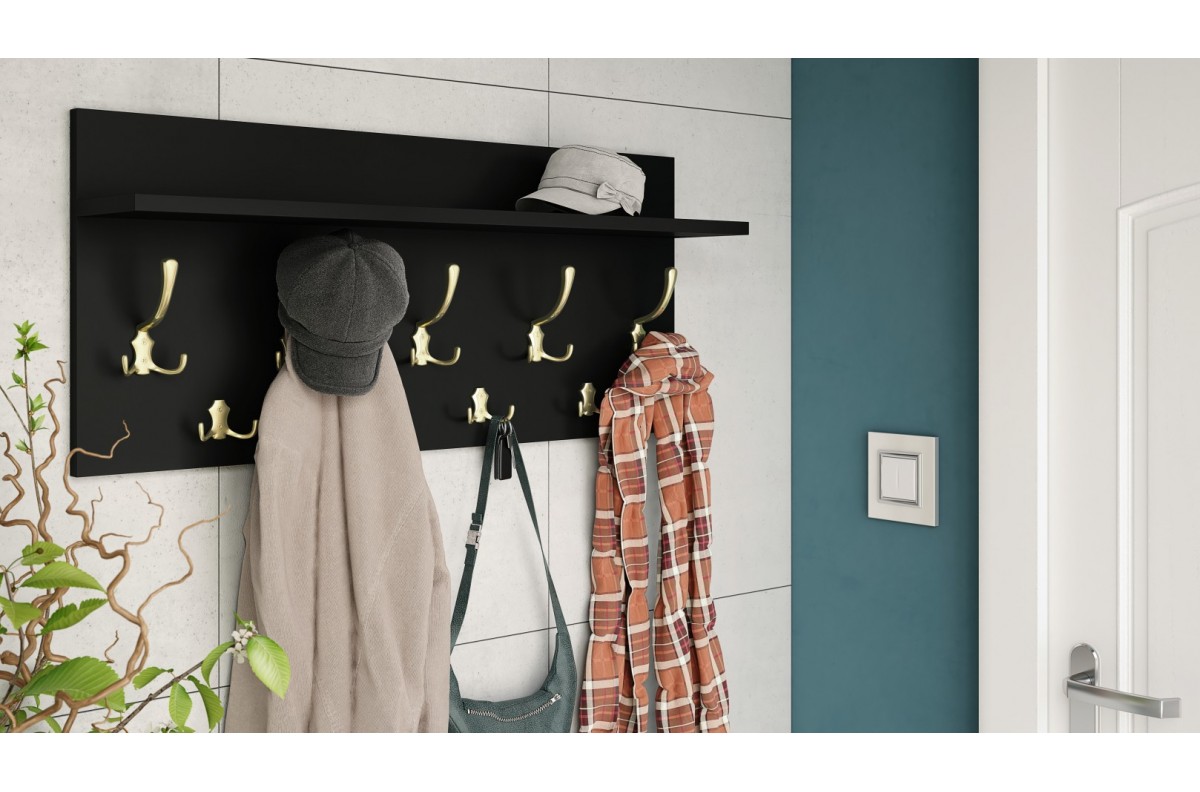 FINLO matinės juodos/auksinės blizgios rankenėlės – MODERNUS SIENINIS PAKABINIMAS SU LENTYNA PRIEŠKORIUI 90 ir 70 cm