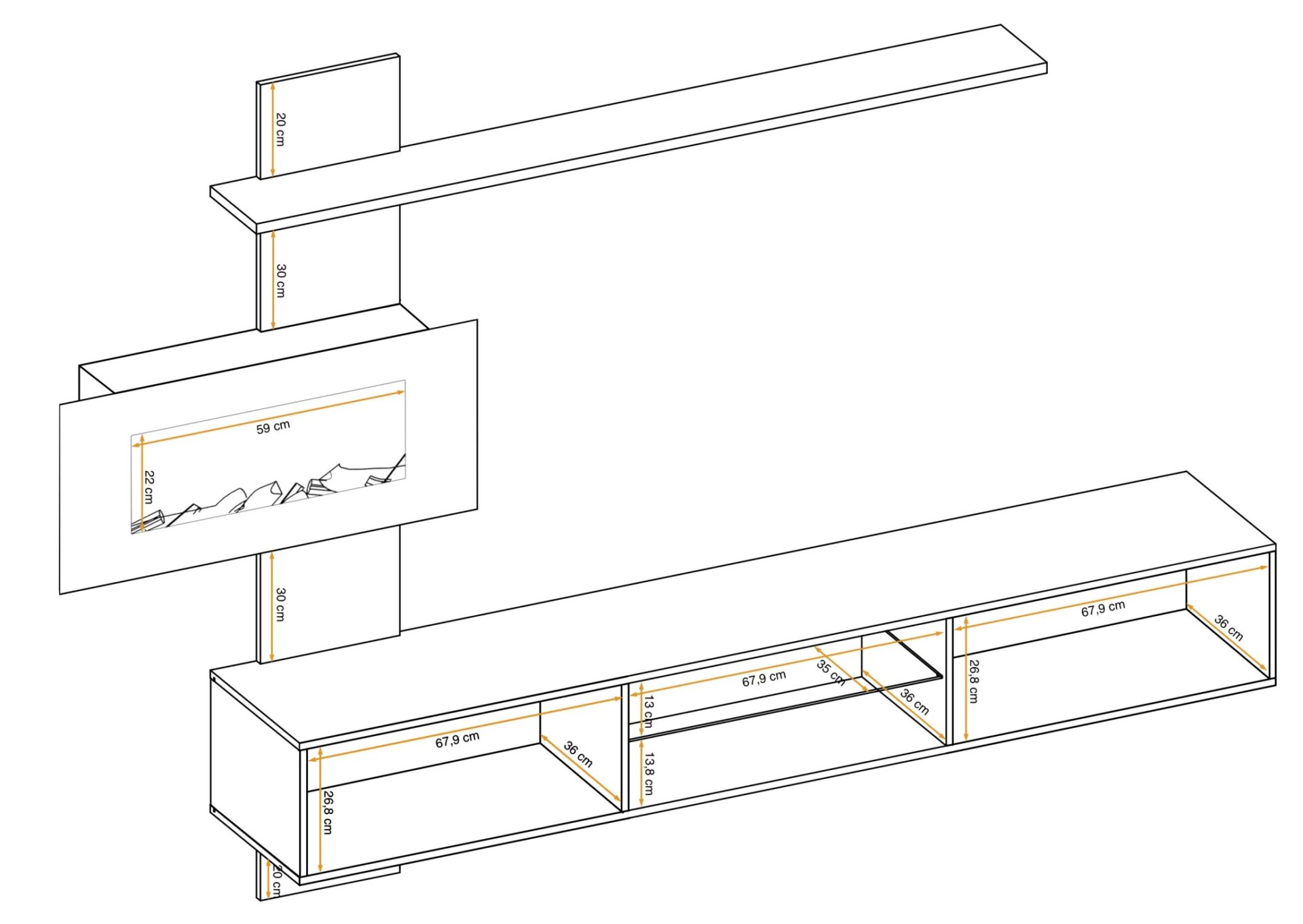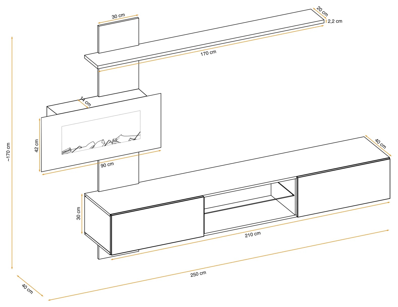 Sieninė panelė su lentyna, elektriniu židiniu ir ant jos pritvirtintu televizoriaus stalčiumi. Televizoriaus staliukas turi atvartus dešinėje ir kairėje, o už kiekvieno atvarto yra po vieną skyrių. Centre yra atvira erdvė, padalinta stikline lentyna, apšviesta baltu LED apšvietimu. Atidarymo sistema su spragtelėjimu.