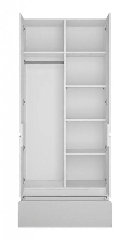 Pristatome Jums flagmaną – namų erdvėms skirtą baldą – „Flexi FLXS02 2D1S“ spintą, kurios atspalvis – nekaltai baltas, ir kuri sėkmingai patenkins visus Jūsų drabužių laikymo poreikius. Dėl idealių matmenų (plotis: 84 cm, aukštis: 193,4 cm, gylis: 59,6 cm) ji lengvai randa vietą miegamajame, persirengimo kambaryje ar prieškambaryje. Šio elegantiško sprendimo vidus garantuoja maksimalų funkcionalumą ir estetiką. Spintos ilgaamžiškumą garantuoja aukščiausios kokybės medžiagos: laminuotos medžio drožlių plokštės korpusas ir fasadai, dekoruoti MDF plokštėmis, padengtomis PVC plėvele, kurios ne tik užtikrina ilgalaikį naudojimą, bet ir palengvina valymą. Modernus dizainas pasižymi paprasta, tačiau rafinuota forma, kuriai būdingas minimalizmas ir elegancija. Funkcionaliame spintos interjere yra šešios atskiros dalys ir praktiška drabužių pakaba, leidžianti patogiai susisteminti turinį ir greitai bei lengvai pasiekti reikiamus daiktus. Pilno ištraukimo stalčiai ant patvarių rutulinių guolių bėgelių palengvina prieigą prie mažesnių daiktų ar aksesuarų, pabrėždami baldo praktiškumą. Ši išmani sistema paverčia spintą išskirtinai praktišku ir geidžiamu bet kokio interjero papildymu.