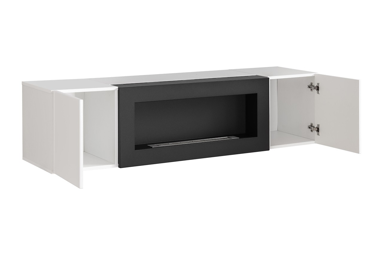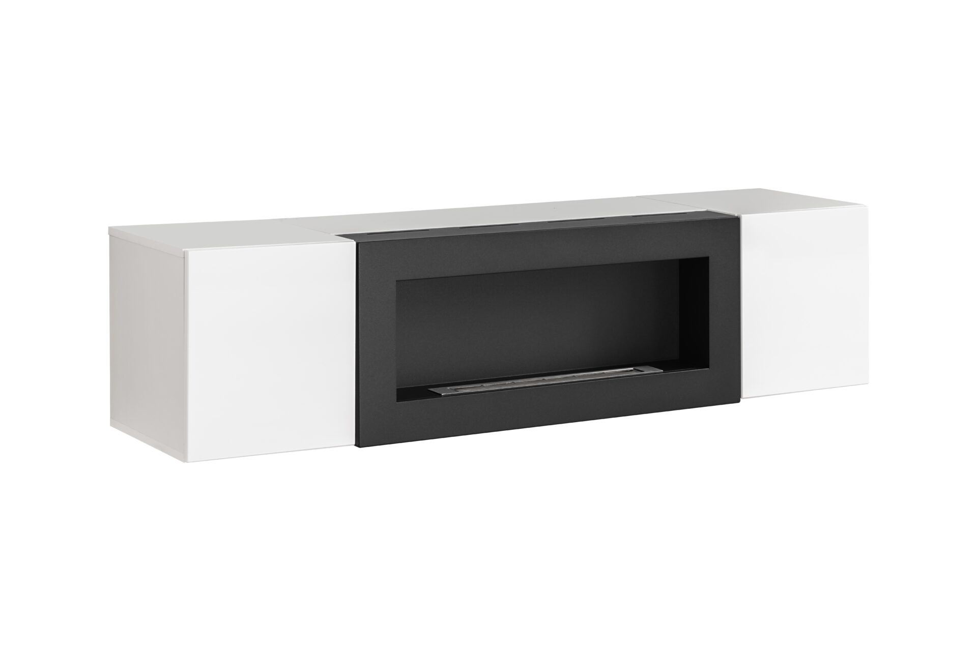 Pakabinama komoda SBK: durelės kairėje ir dešinėje, po vieną skyrių už kiekvienų durelių, biožidinys (bioetanolis) viduryje, blizgūs PVC fasadai, spustelėjimo sistema