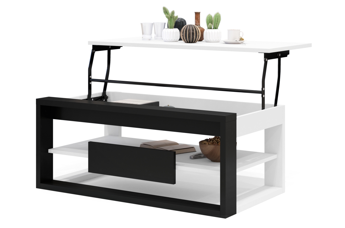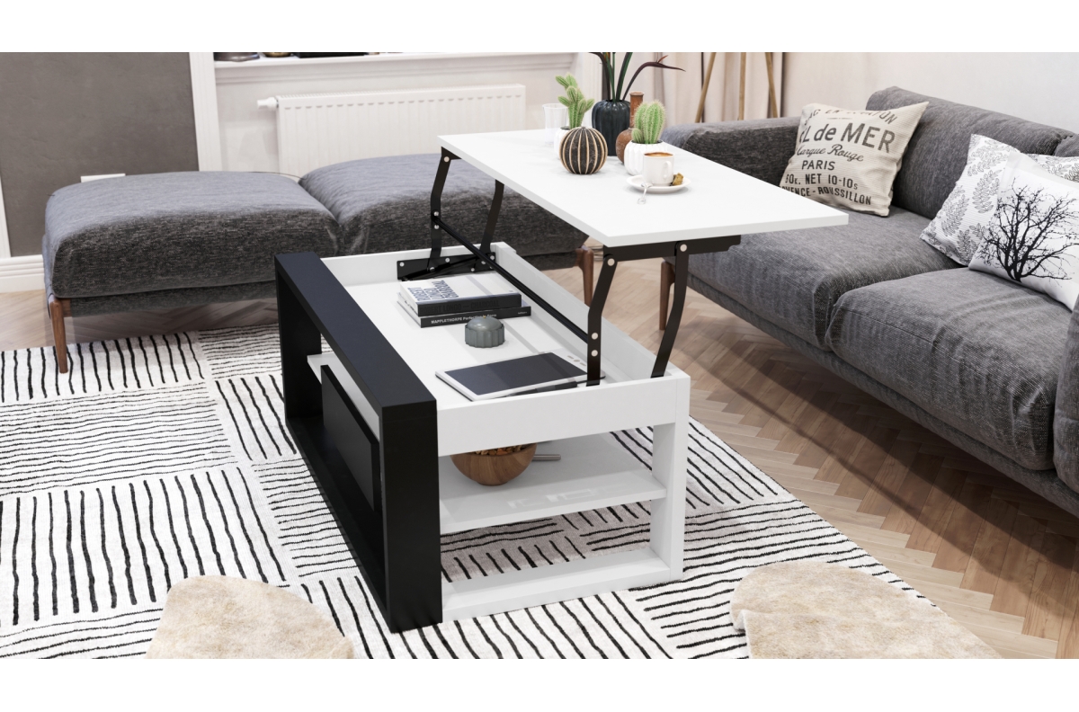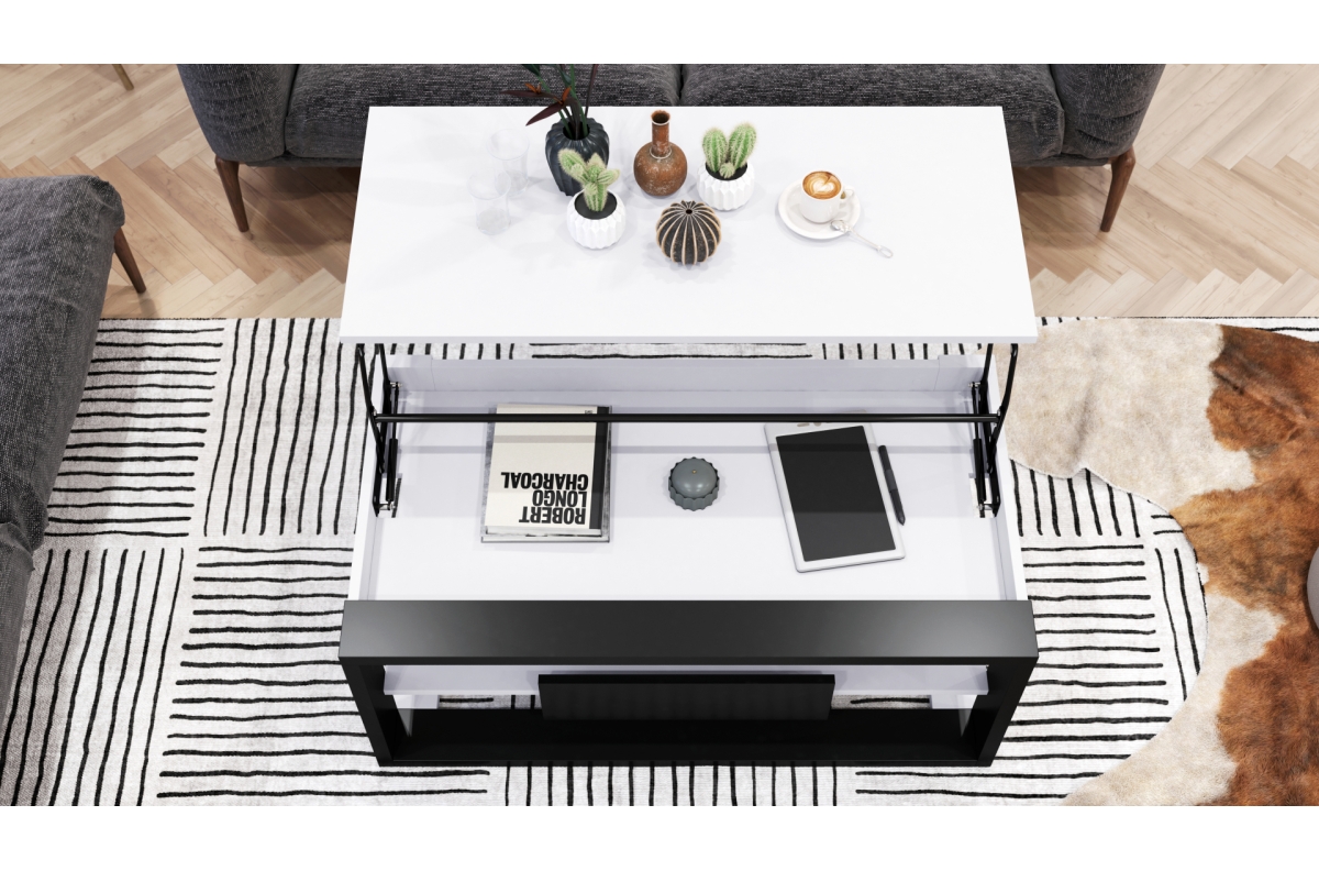 PLOTIS 110 cm, GYLIS 60 cm, AUKŠTIS 45 cm / 71 cm, MEDŽIAGOS Medžio drožlių plokštė, FUNKCIJA Pakeliamas stalviršis (nėra, AUKŠČIO reguliavimo), PAVIRŠIUS Matinis, STILIUS Loft / Industrial, SVORIS SU PAKUOTE 37,5 kg