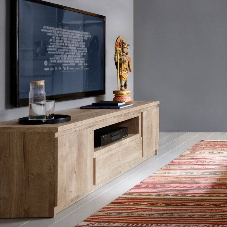 Ieškote baldo, kuris papuoštų jūsų svetainę klasika ir patogiai tilptų jūsų televizorius bei pramogų įranga? Atraskite „Fribo FRIF01“ televizoriaus spintelę, pasižyminčią nesenstančiu dizainu ir funkcionalumu, pritaikytu šiuolaikiniams poreikiams. Jos matmenys (165,4 cm pločio, 51,1 cm aukščio ir 45 cm gylio) leidžia patogiai pastatyti tiek didelius, tiek mažesnius ekranus, taip pat papildomą garso ir vaizdo įrangą. Pagaminta iš aukštos kokybės laminuotos plokštės, natūralaus, šilto Ribbeck auksinio ąžuolo atspalvių, „Fribo FRIF01“ televizoriaus spintelė suteikia jaukumo jūsų interjerui, išlaikydama modernų charakterį. Laminatas yra itin patvarus – atsparus įbrėžimams, mechaniniams pažeidimams, drėgmei ir aukštai temperatūrai, todėl galėsite džiaugtis gražia jo išvaizda ilgus metus. Puikus „Fribo FRIF01“ spintelės išplanavimas su vienu erdviu stalčiumi ir dviem šoninėmis spintelėmis leidžia tvarkingai laikyti daiktus. Nesvarbu, ar jums reikia vietos DVD diskams, konsolių žaidimams, knygoms ar kitiems priedams, šioje komodoje lengvai tilps visi jūsų reikalingi daiktai, išlaikant tvarką kambaryje. Spintelės turi paslėptus vyrius, o stalčiai juda pilno ištraukimo rutuliniais guoliais, todėl jais naudotis nepaprastai patogu ir paprasta.
