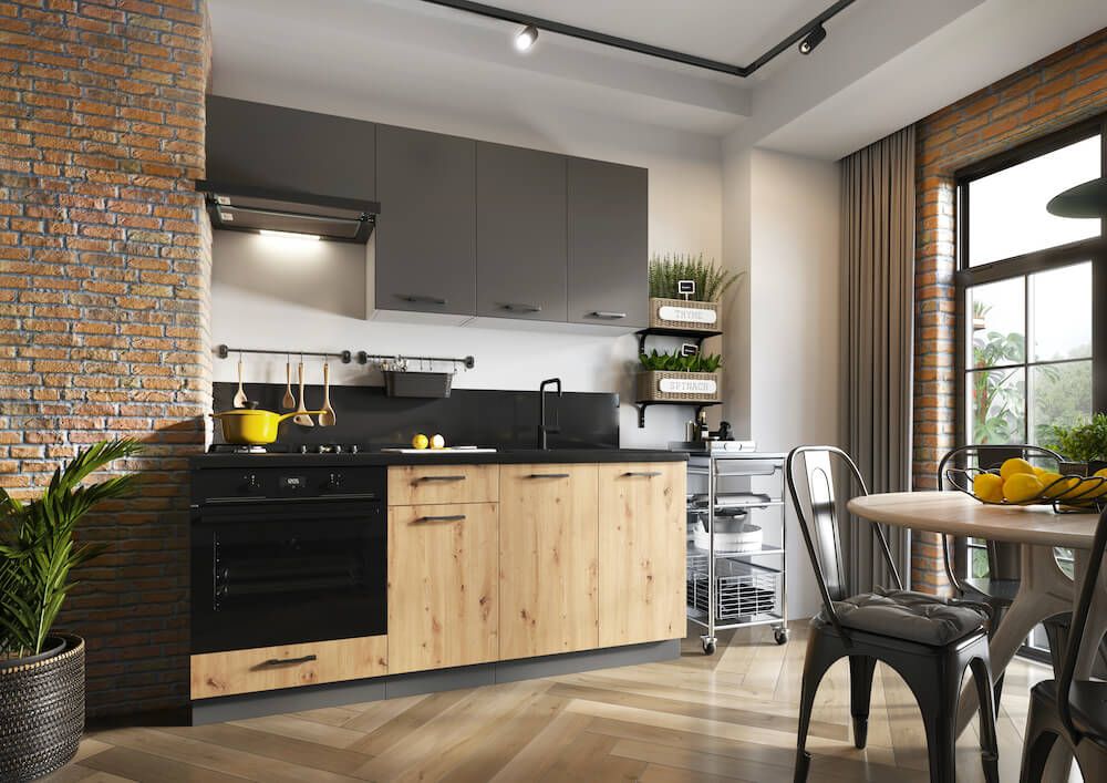Virtuvės specifikacija – medžio imitacijos, grafito | Virtuvės stilius – loftas | Fasado tipas: Laminuota plokštė / MDF / Lakuota laminuota plokštė | Matmenys: plotis [cm]>44,6 aukštis [cm]>71,3